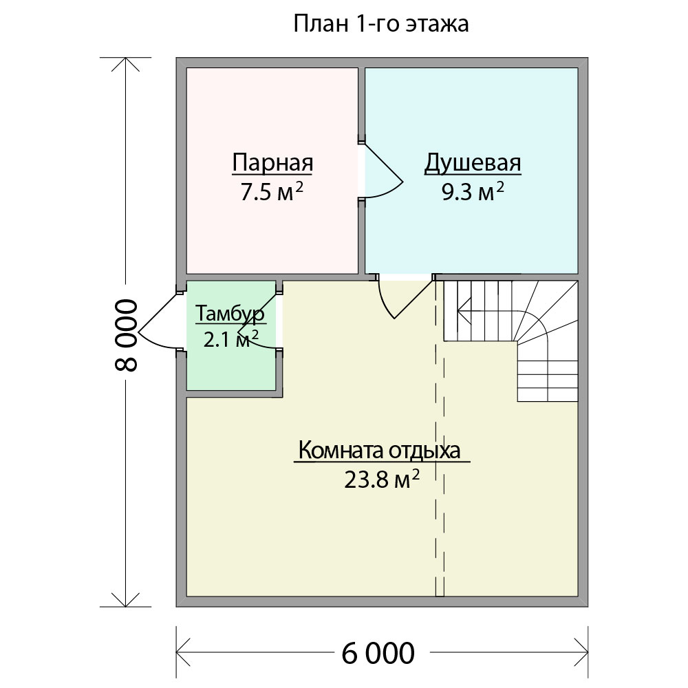На первом этаже располагаются вместительные парная, душевая, а также светлая комната, с большой площадью остекления. Есть возможность по желанию заказчика оборудовать санузел.