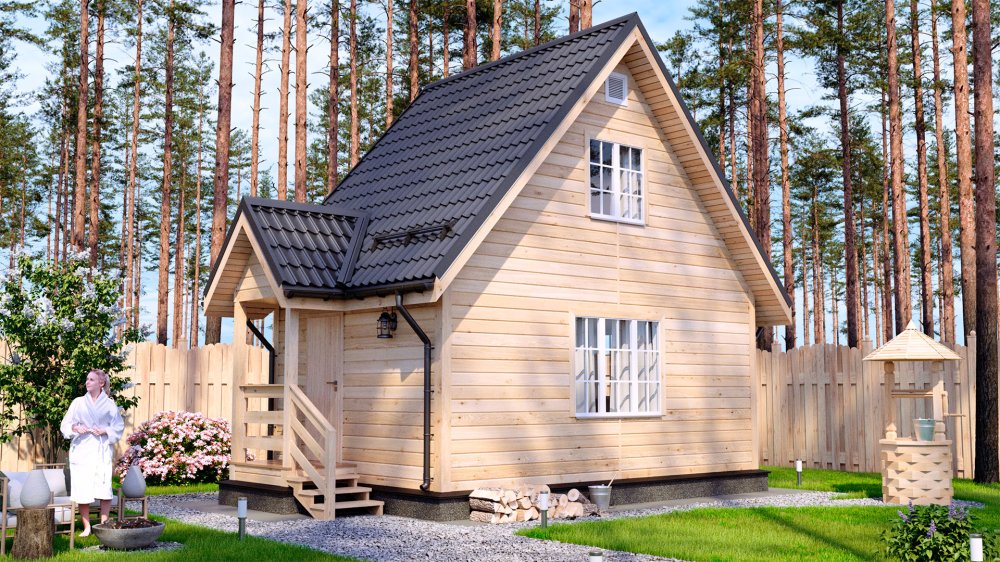 Эта баня может стать первой постройкой на дачном участке. Её площадь позволяет совмещать функции бани с функциями дачного домика. Если установить на первом этаже перегородку, то Вы получите два помещения - одно послужит небольшой кухней, а другое - раздевалкой. На втором этаже расположена комната отдыха, которую легко превратить в спальню, разместив там мебель.