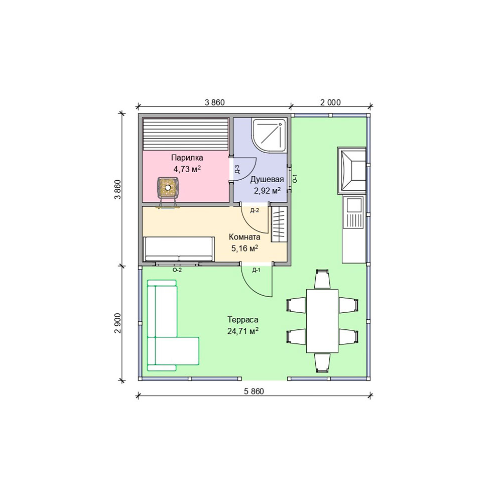 Значительные размеры террасы позволяют оборудовать на ней летнюю кухню с обеденной зоной и место для хранения дров, или летнюю кухню с зоной барбекю и зоной отдыха, которая весьма кстати. После хорошей парной приятно сидеть вечером на свежем воздухе, вдыхать вечерние ароматы.