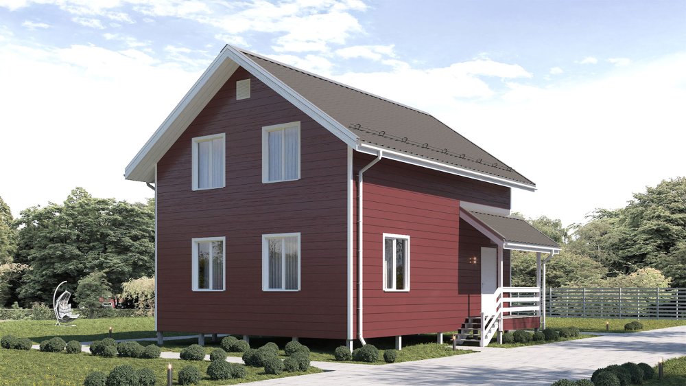 Проект "Калуга" - добротный двухэтажный коттедж классической архитектуры. Отличительные особенности дома - чёткая геометрия фасадов, скатная крыша, симметрично расположенные друг над другом окна, пристроенное крыльцо с навесом.