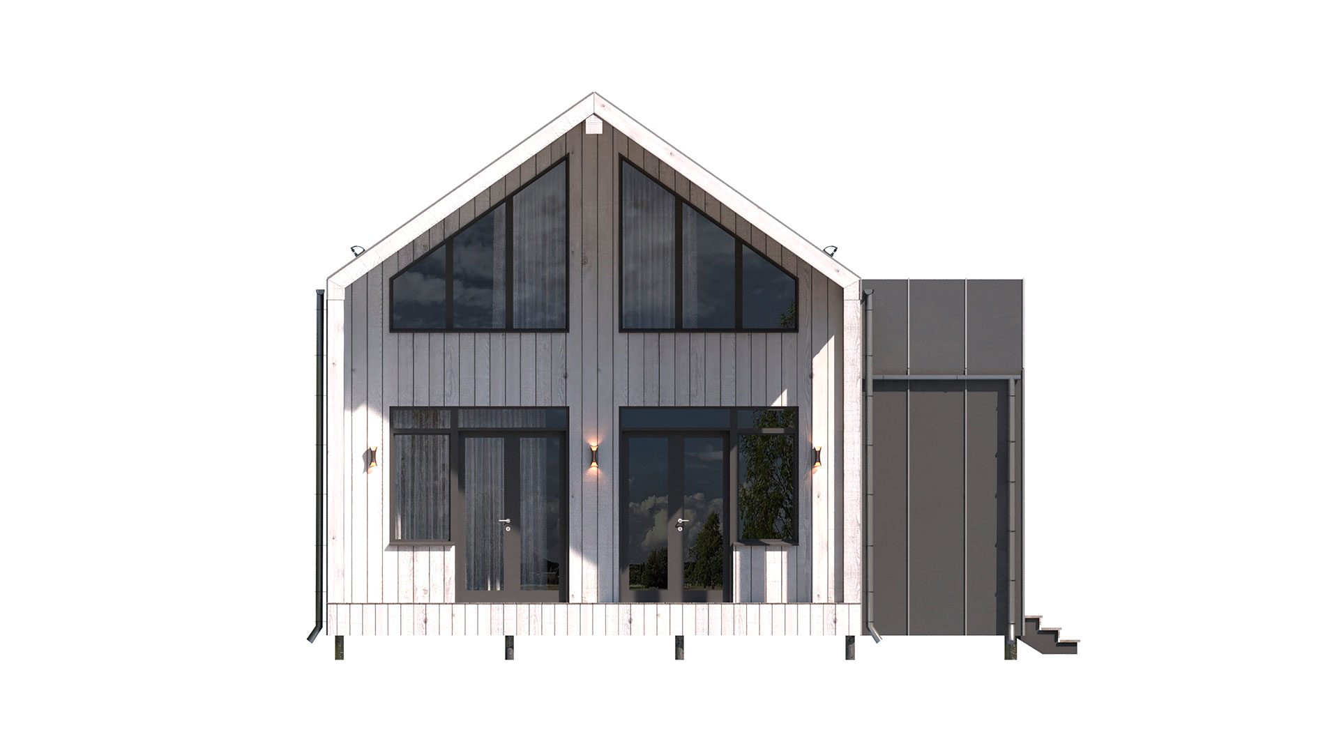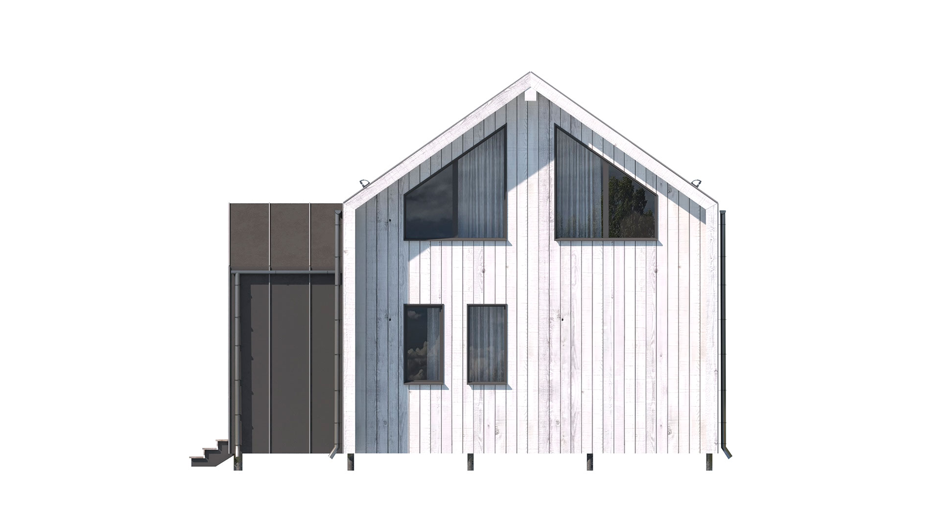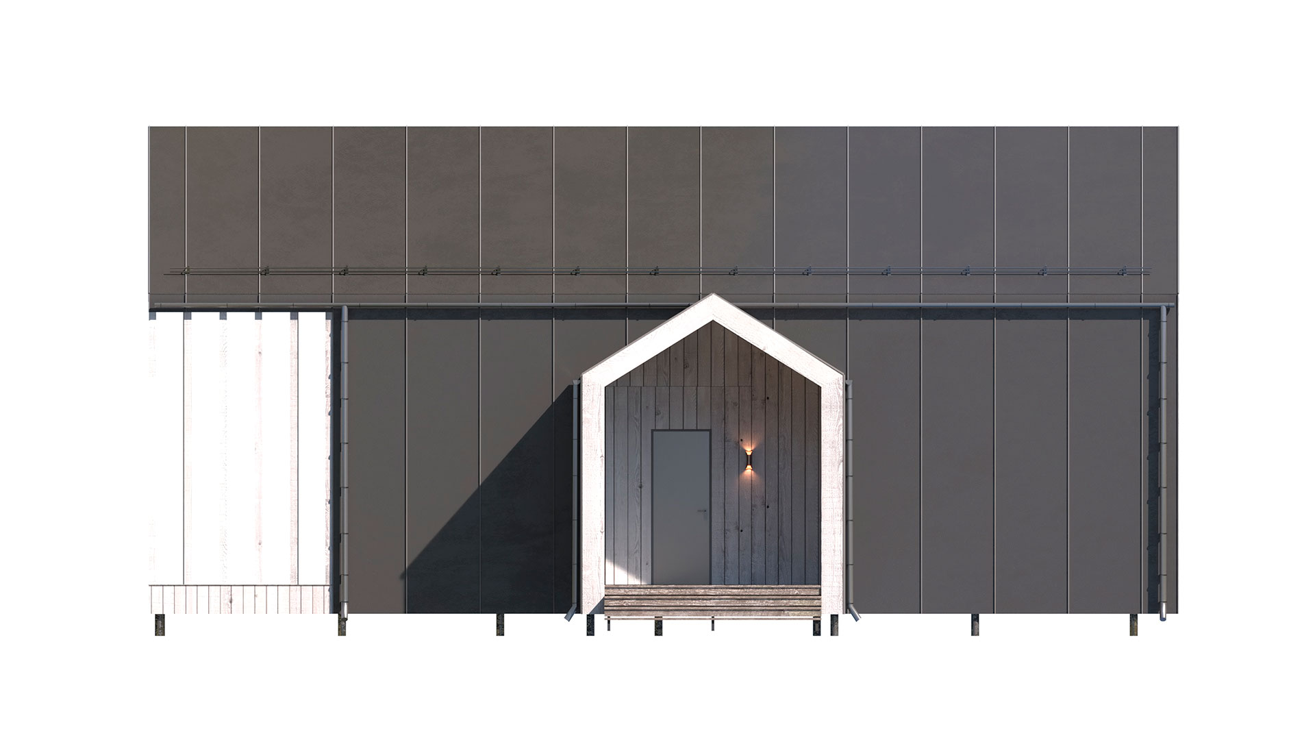 - Внешняя отделка комбинированная: клик-фальц (цвет серый) + планкен 16 мм вертикально по обрешетке их п/м 20х100 мм. Карнизы подшиваются планкен бруса 16 мм.