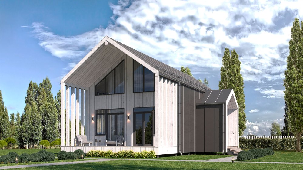 Проект "Норвегия" включает серию каркасных домов с характерной для северной страны архитектурой. Отличительные особенности загородных коттеджей - большие окна, скатная крыша с выступающими краями, деревянные фасады, длинная терраса (открытая или застекленная).