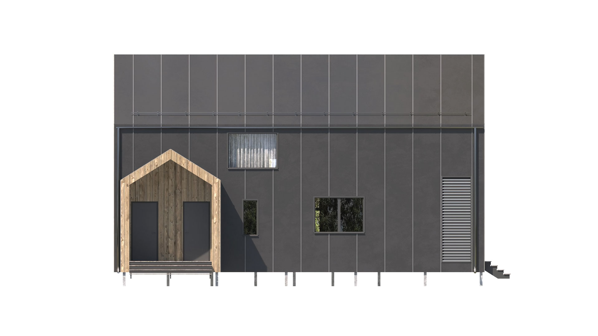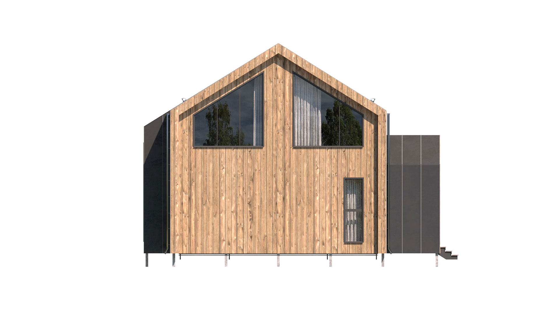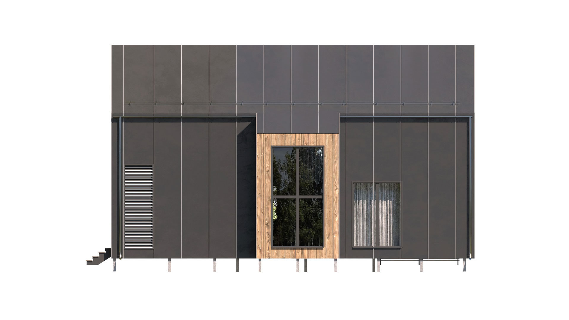- Внешняя отделка комбинированная: клик-фальц (цвет серый) + планкен 16 мм вертикально по обрешетке их п/м 20х100 мм. Карнизы подшиваются планкен бруса 16 мм.