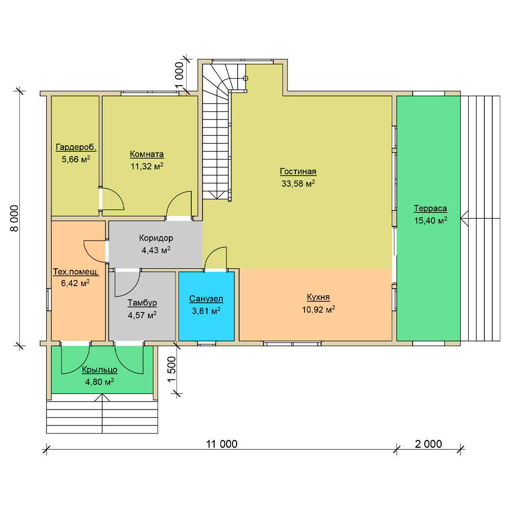 - Высота потолков 1-го этажа и мансарды: 2600 мм.