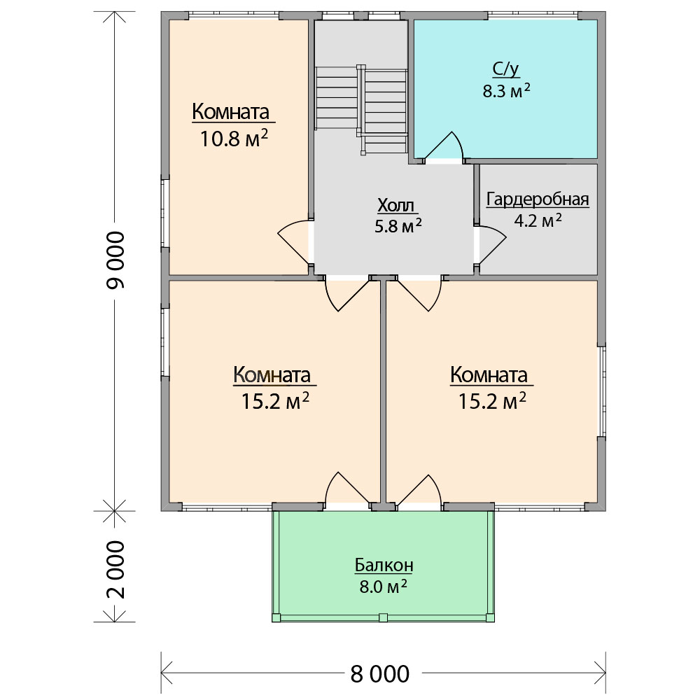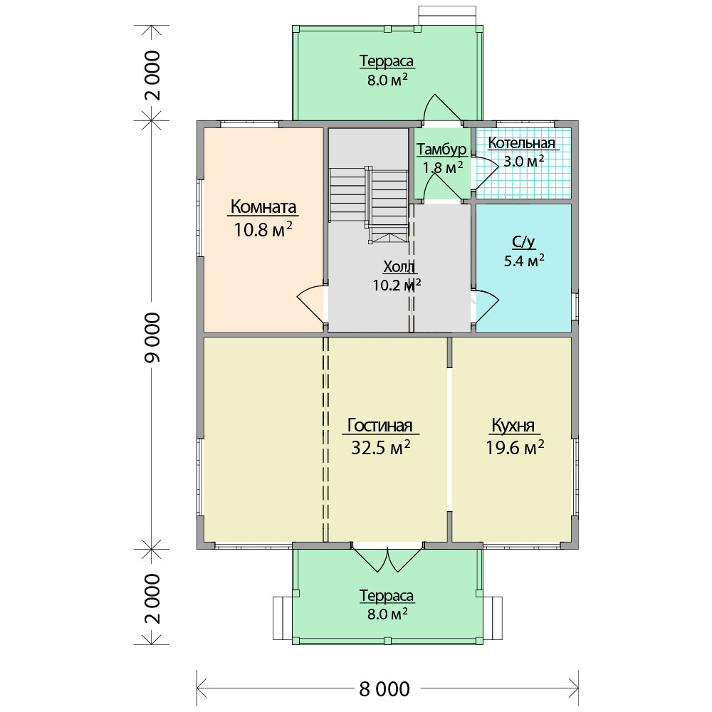 - Высота потолков 1-го и 2-го этажей: 2600 мм.