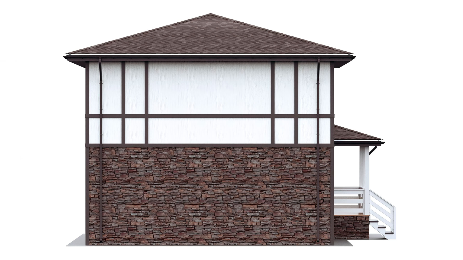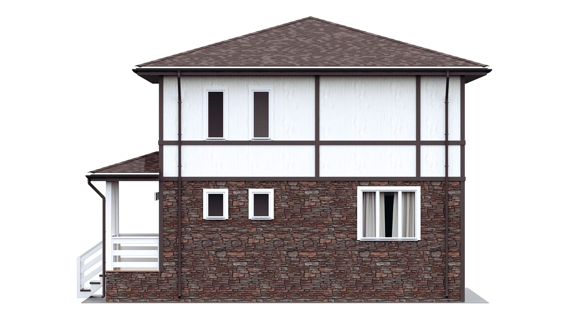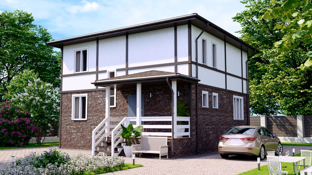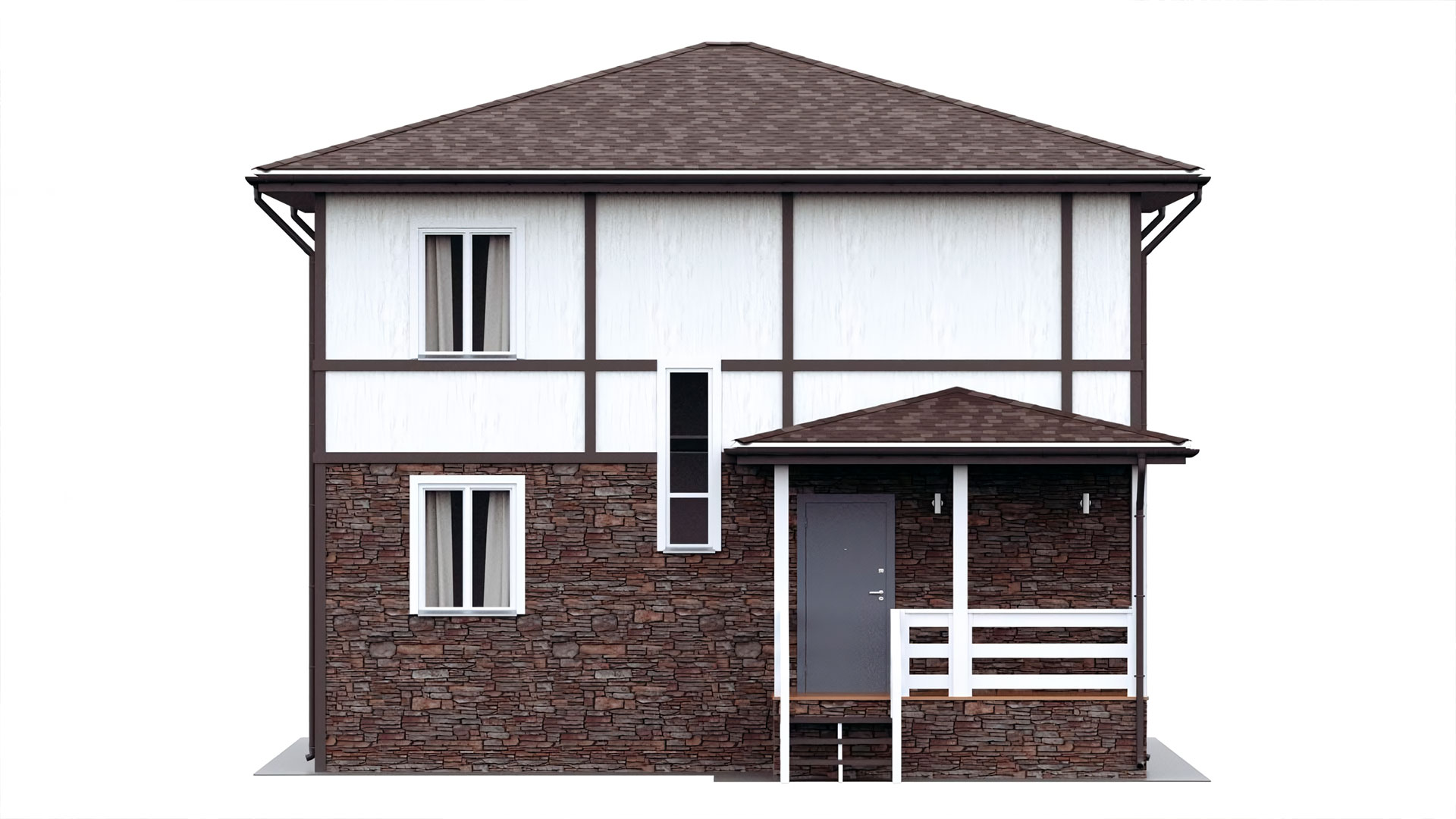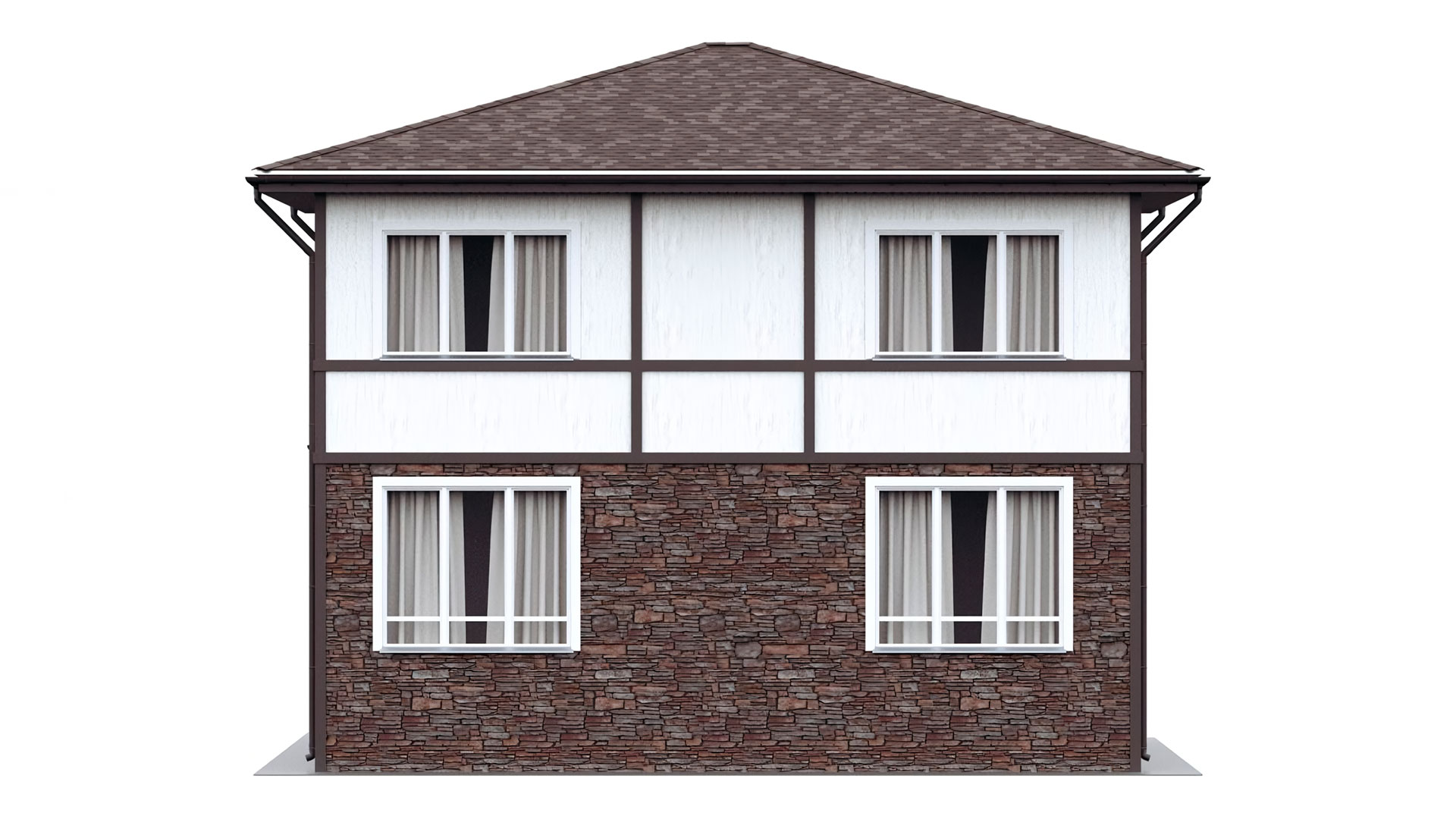 Каркасный двухэтажный коттедж "Енисей 3" размером 8,5х9 привлекает своё внимание строгой и уравновешенной архитектурой. Украшением фасадов являются декоративные балки, напоминающие фахверковые стойки немецких домов. Крыльцо с большим навесом находится в боковой части. Большие окна расположены симметрично.
