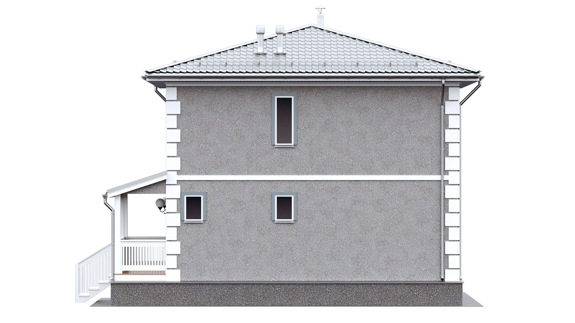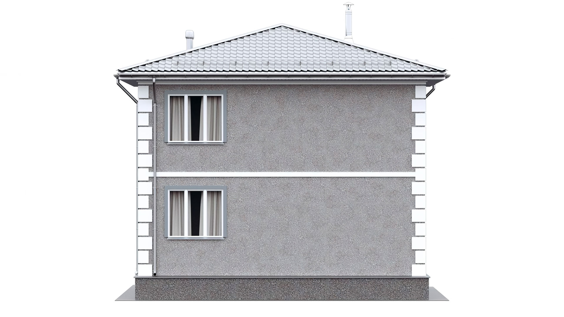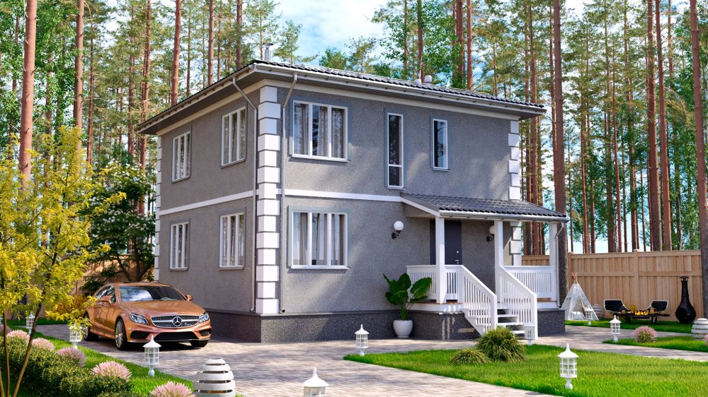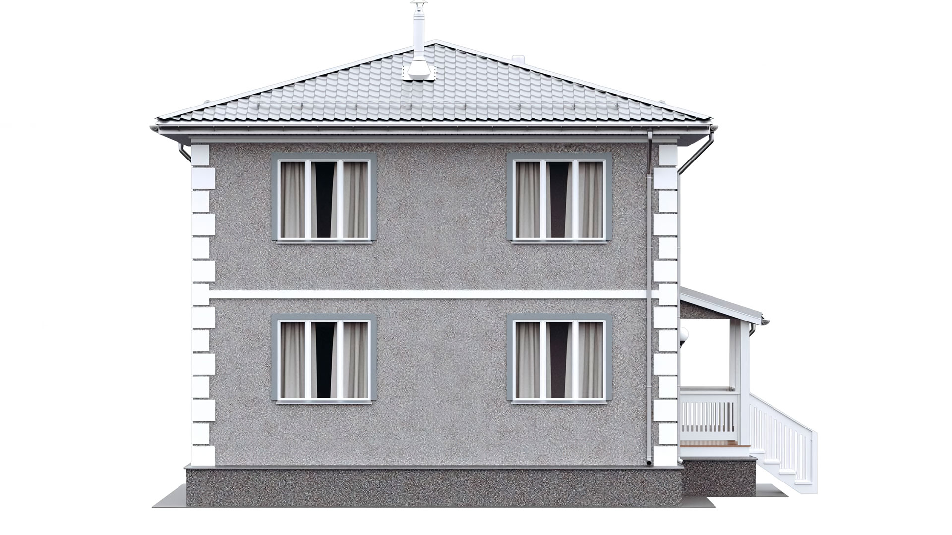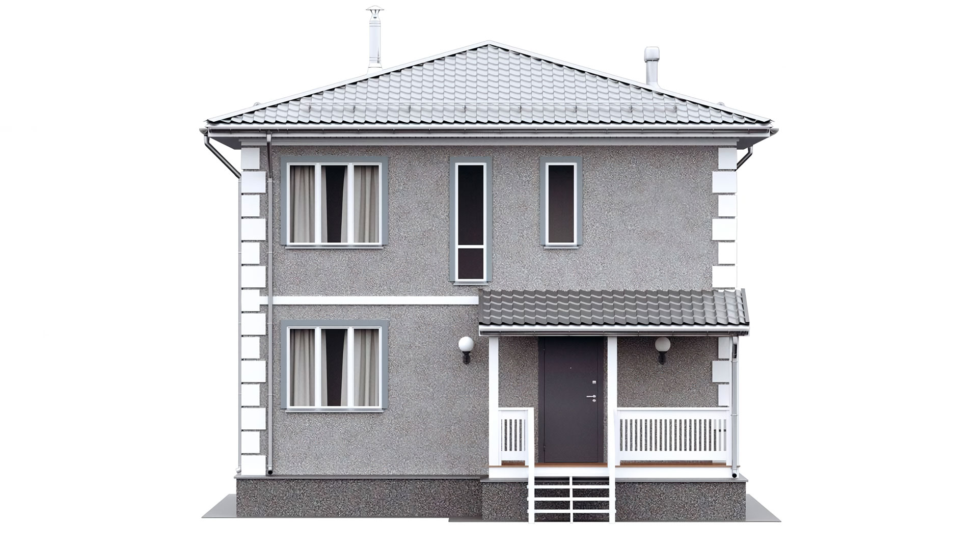 Квадратный двухэтажный дом "Енисей" выдержанный в классическом стиле, предназначен для постоянного проживания семьи. Отличительными особенностями архитектуры являются симметричное расположение элементов, сбалансированные пропорции дома, большие окна. К входу ведет крыльцо с навесом и небольшой лестницей. Угловые стыки декорированы искусственным камнем.