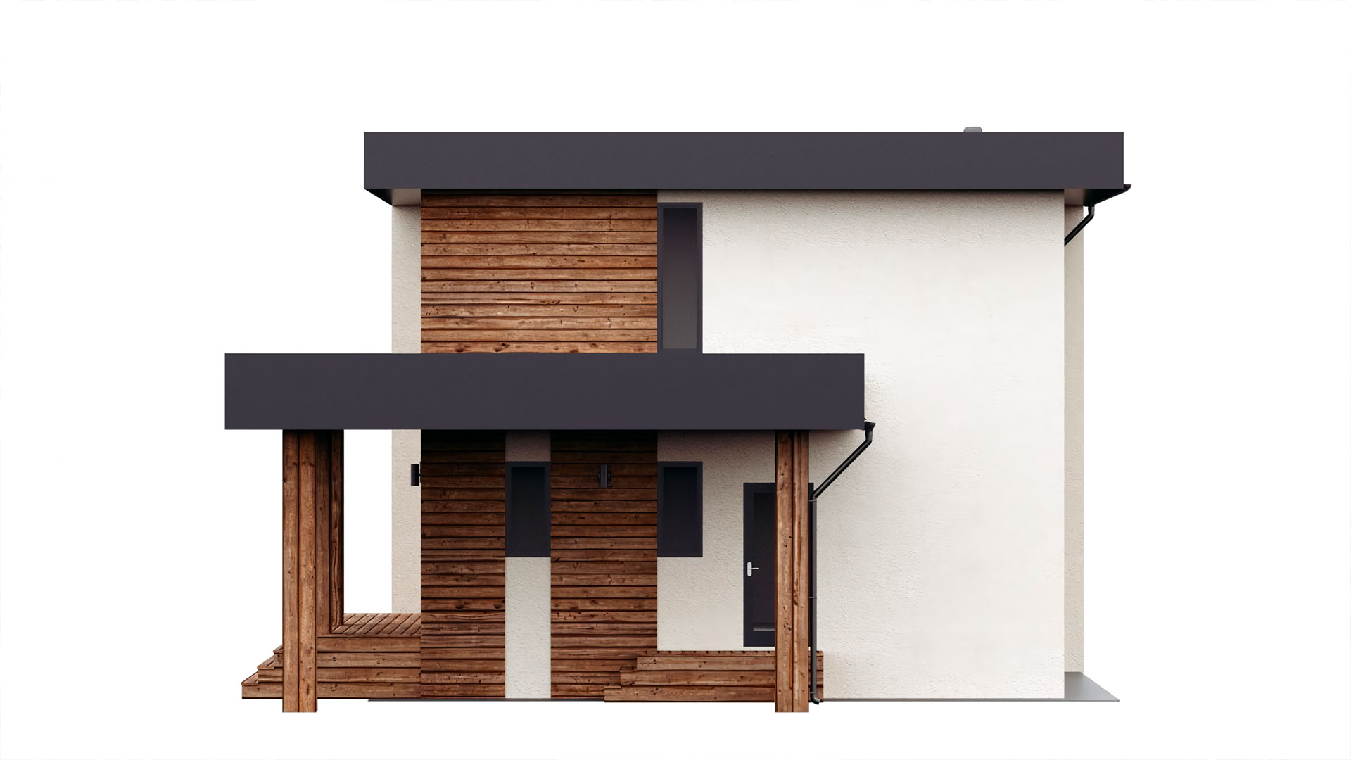 Внешняя облицовка квадратного здания - планкен, фиброцементный сайдинг, кровельное покрытие - кликфальц. Благодаря панорамным окнам, в помещениях всегда будет светло. Часть фасада со стороны центрального входа, и торцевой участок дома защищены от садков большим навесом на опорах, под которым находится внутренний дворик.