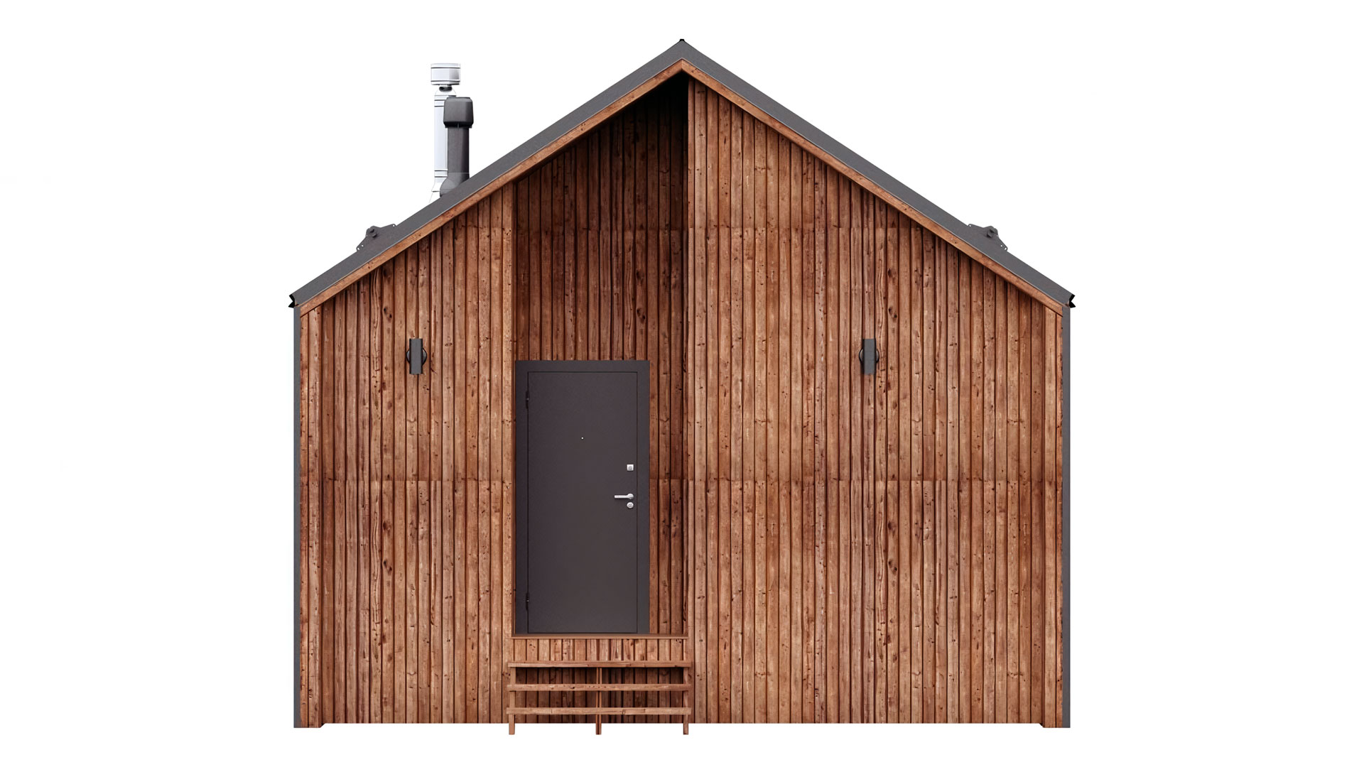 - Внешняя отделка комбинированная: цветной профилированный лист С20 (цвет серый) + имитация бруса 16 мм вертикально по обрешетке из п/м 20х100 мм (без покраски). Карнизы подшиваются имитацией бруса 16 мм.