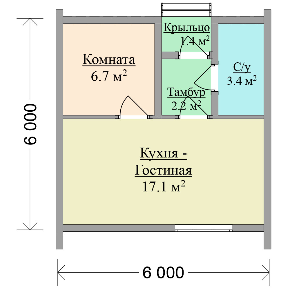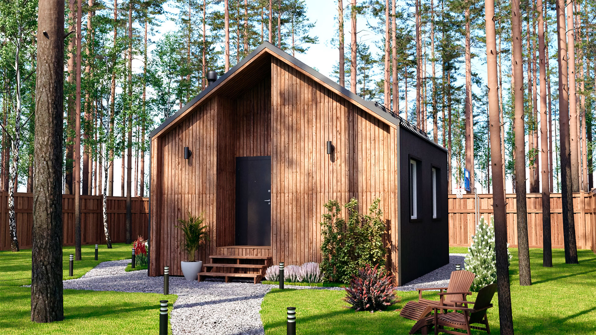Одноэтажный дом "Асгард" со скатной крышей и небольшим крыльцом - оптимальный выбор для сезонного или постоянного проживания небольшой семьи, или одного человека. Компактный современный коттедж строится "под ключ" всего за 25-30 дней. Планировка дома включает в себя кухню-гостиную, спальню, тамбур, санузел. В процессе строительства каркасного дома подводятся все коммуникации (водоснабжение, канализация, электричество), создается вытяжная вентиляционная система с выводом на кровлю.