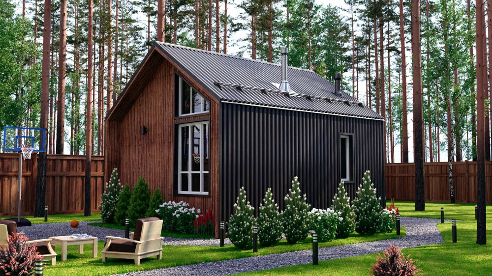 Внешняя облицовка строения - планкен без покраски. Недорогой и комфортабельный проект загородного дома "Асгард" может быть построен на маленькой территории, в том числе, на дачном участке.