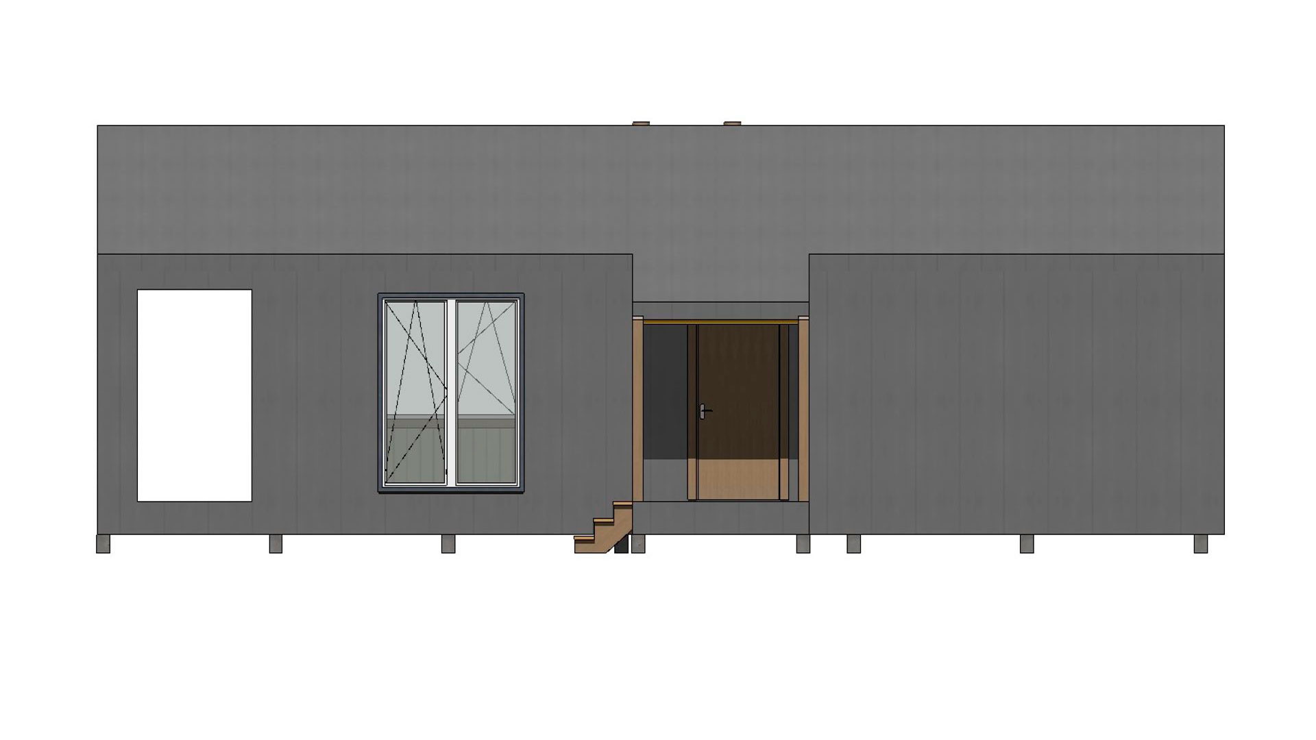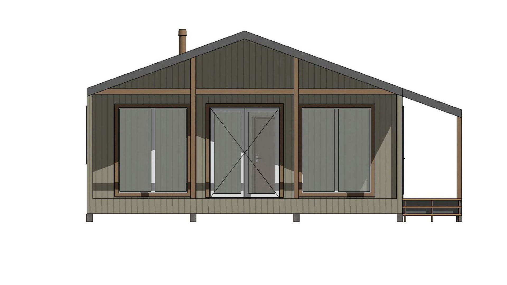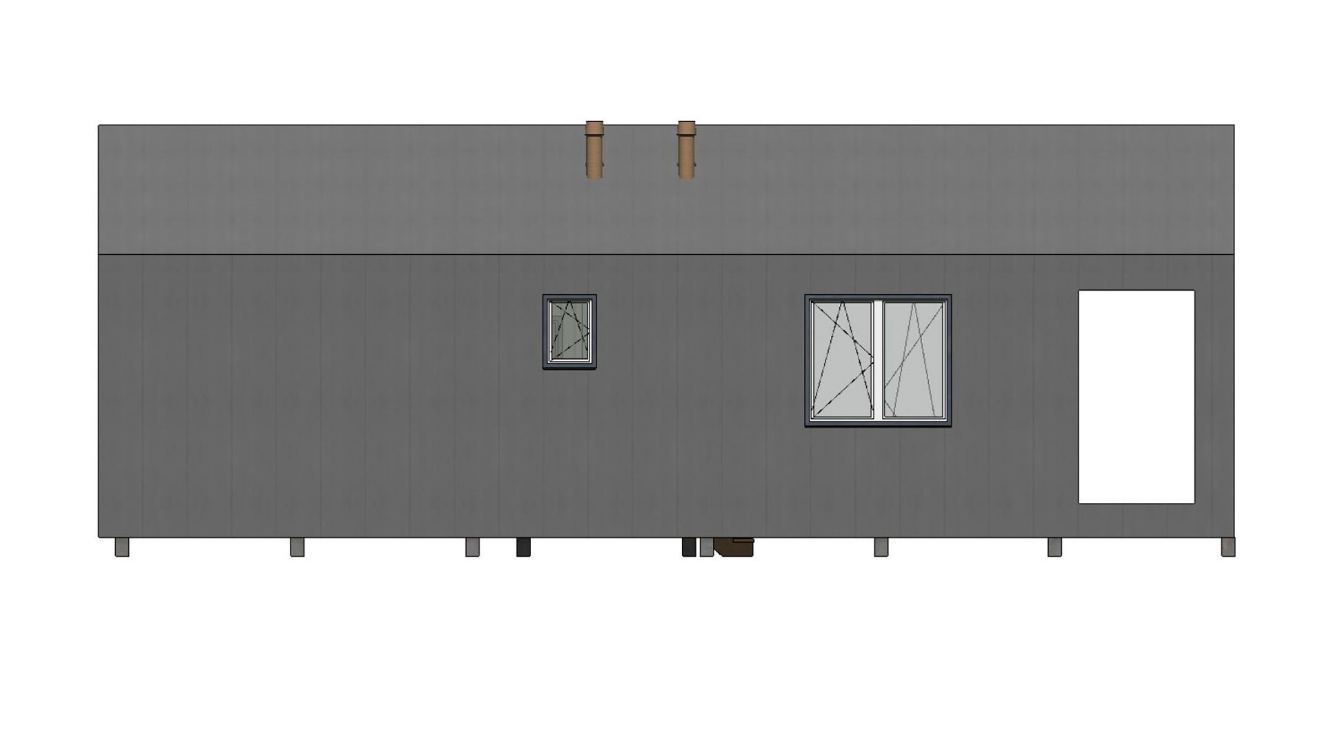 - Внешняя отделка комбинированная: цветной профилированный лист С20 (цвет серый) + имитация бруса 16 мм вертикально по обрешетке из п/м 20х100 мм (без покраски). Карнизы подшиваются имитацией бруса 16 мм.