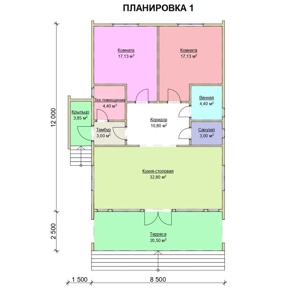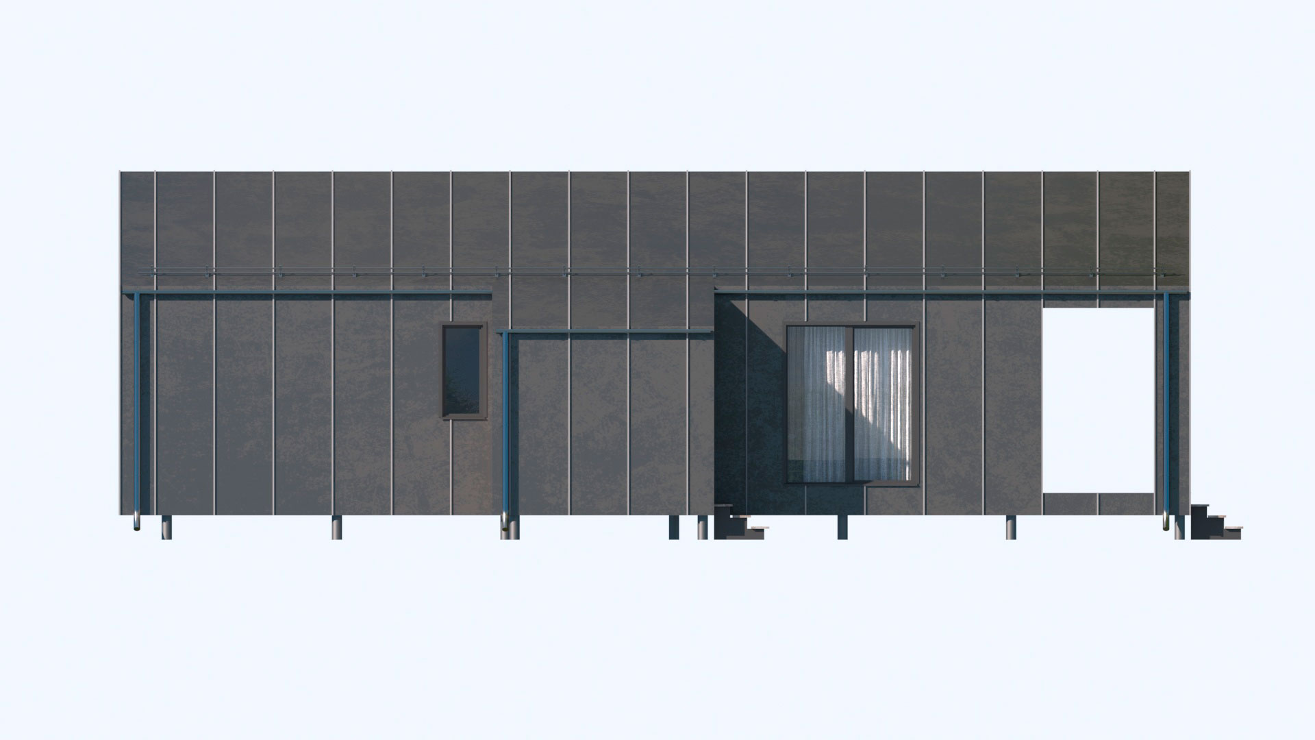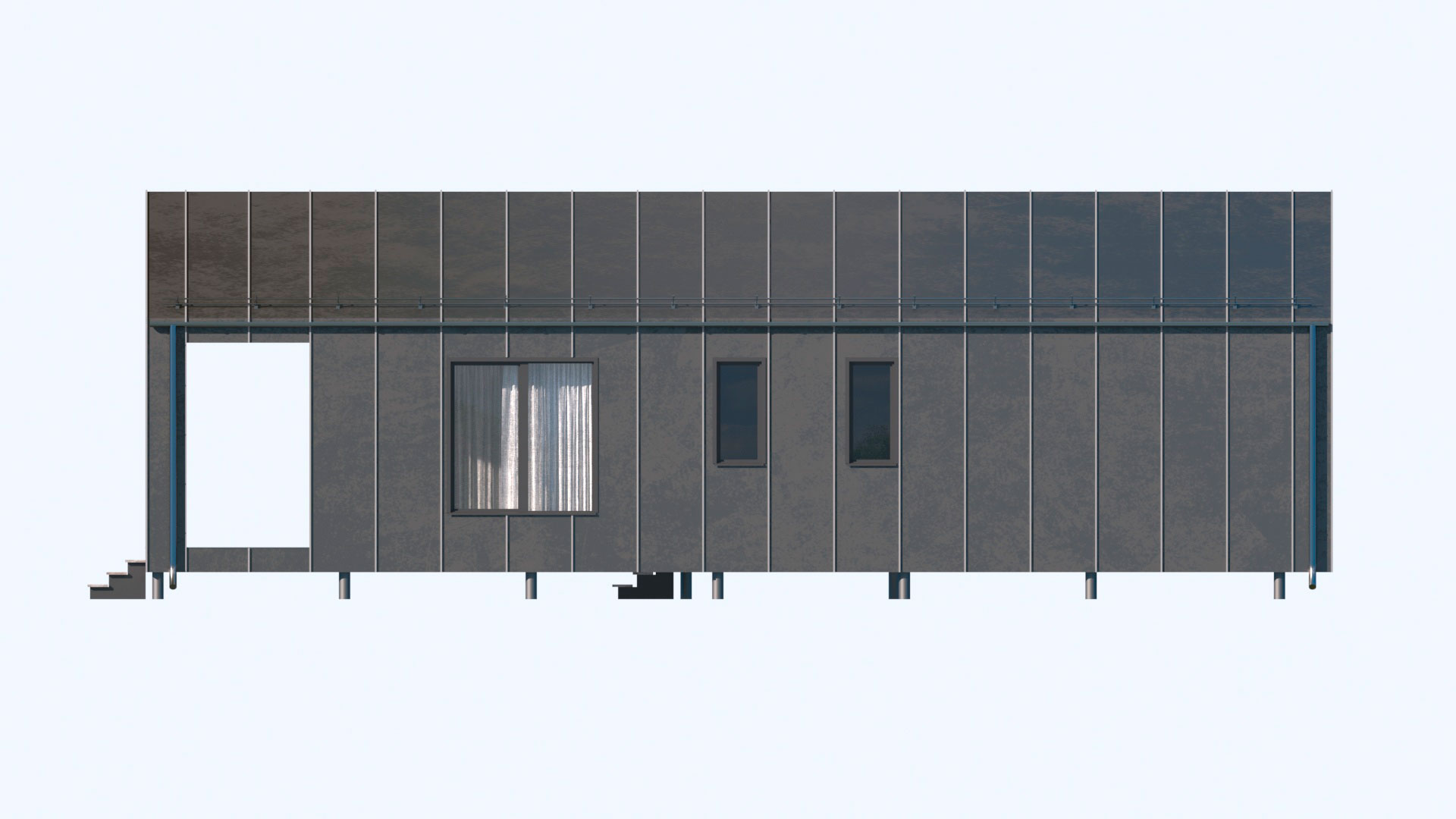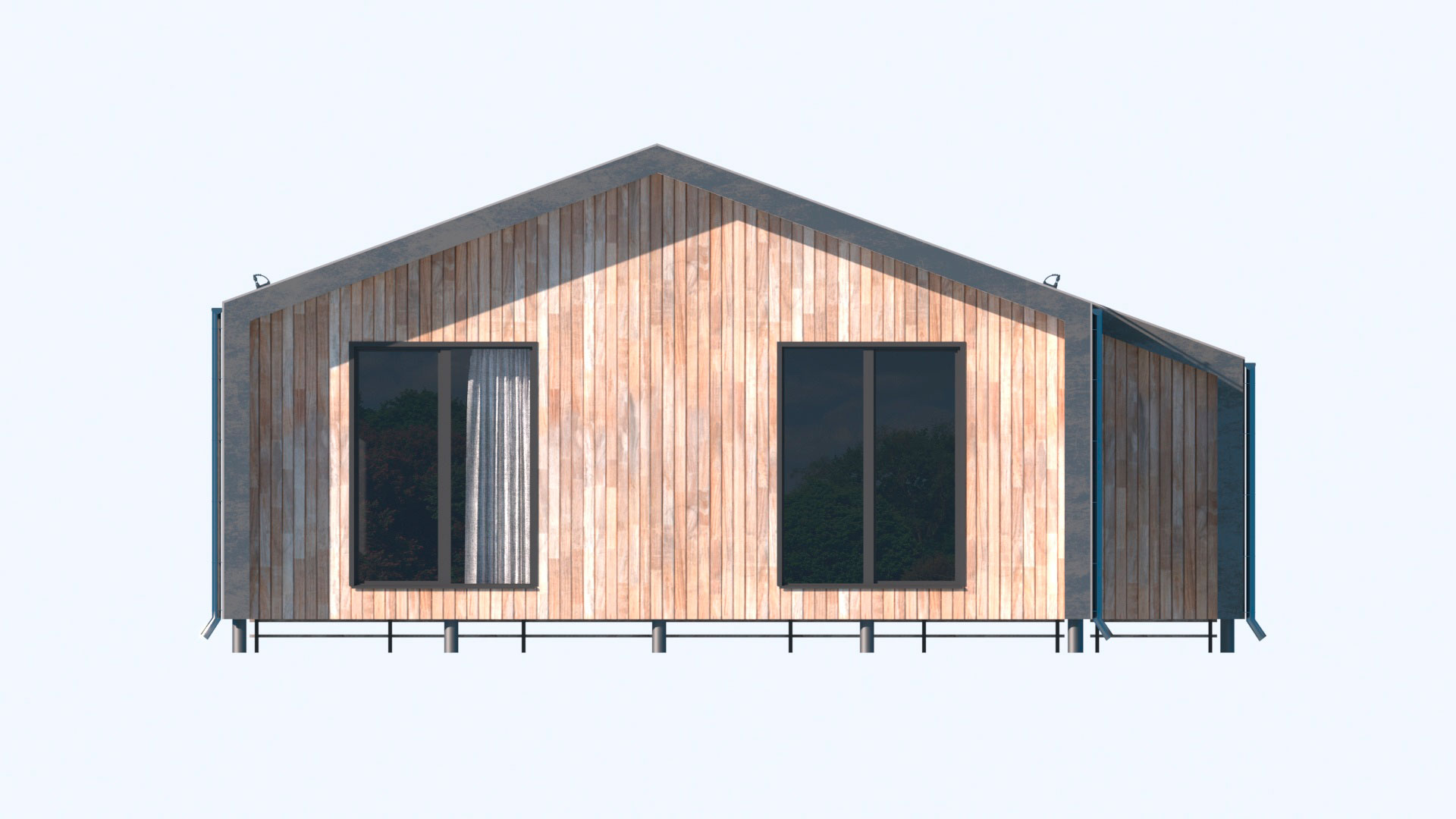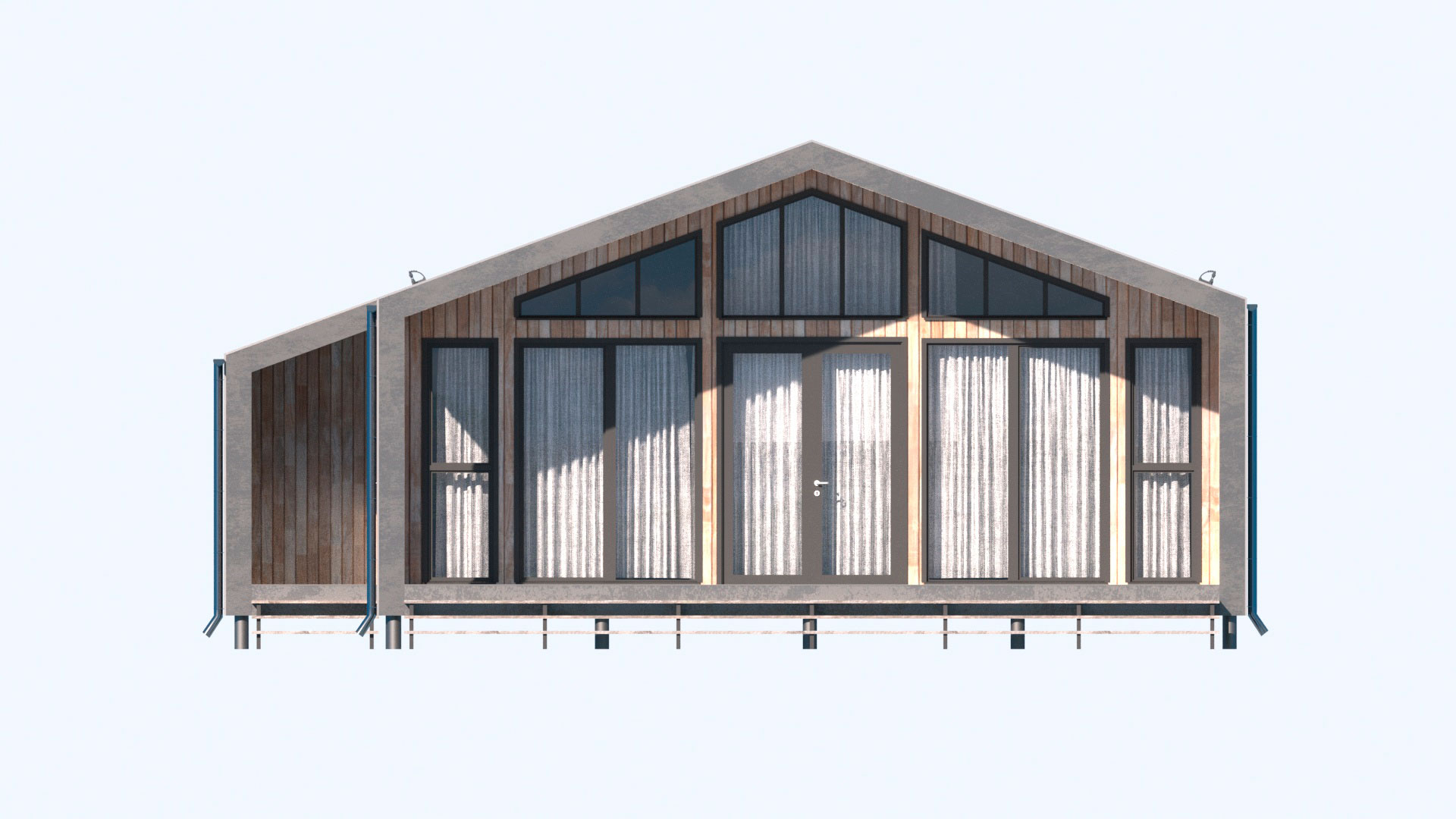 Большой одноэтажный дом (площадь 117,51 м2) отличается выразительной архитектурой с элементами минимализма, удобной планировкой комнат, просторными помещениями, стильной внутренней отделкой. Скатная крыша выдается за пределы здания, образуя защитный козырек над террасой, возвышающейся над широкой лестницей. Центральная часть каркасного дома представляет собой светопрозрачную стену с встроенной стеклянной дверью, а с боковой стороны расположено небольшое крыльцо.