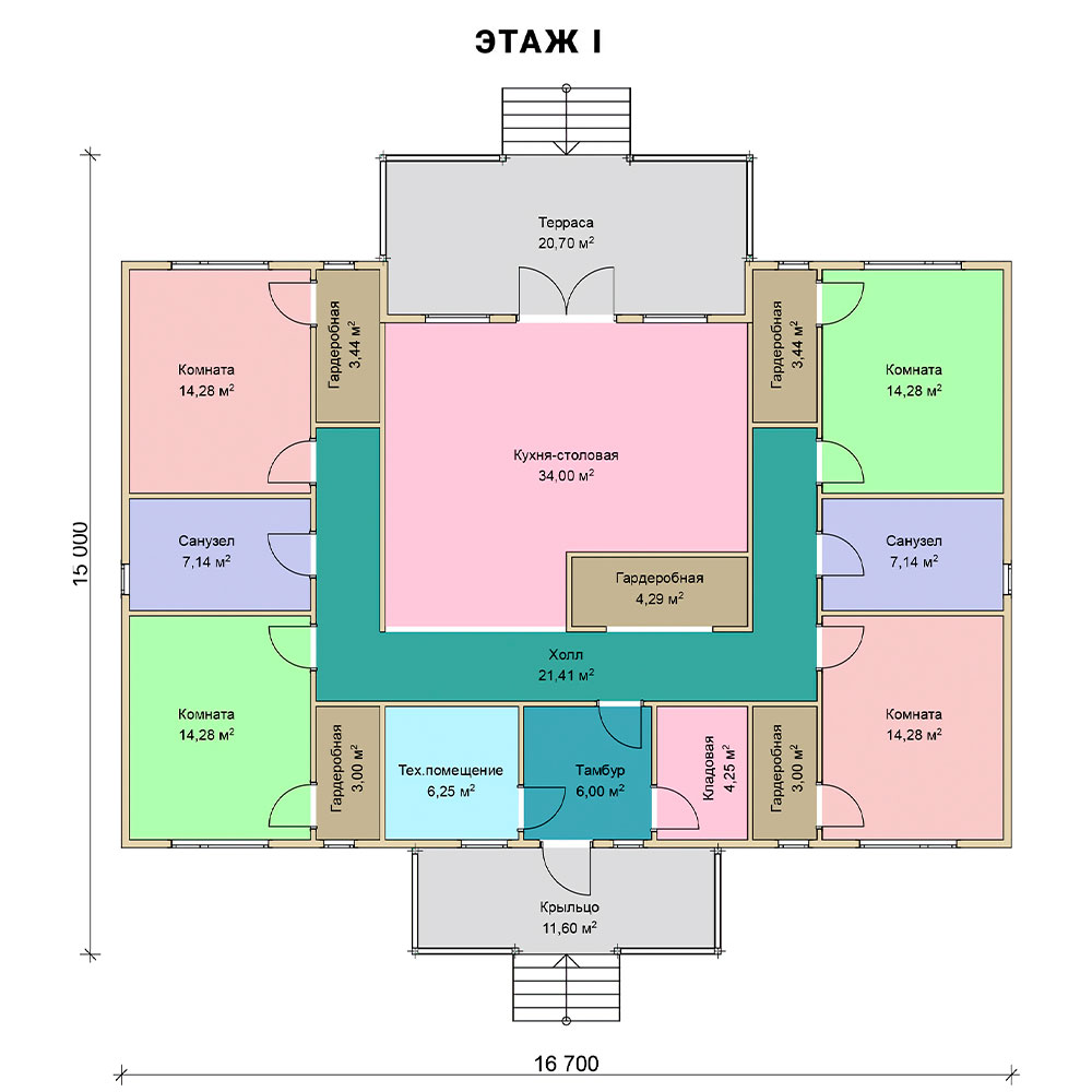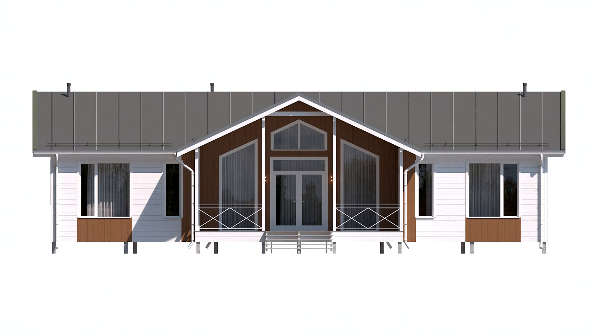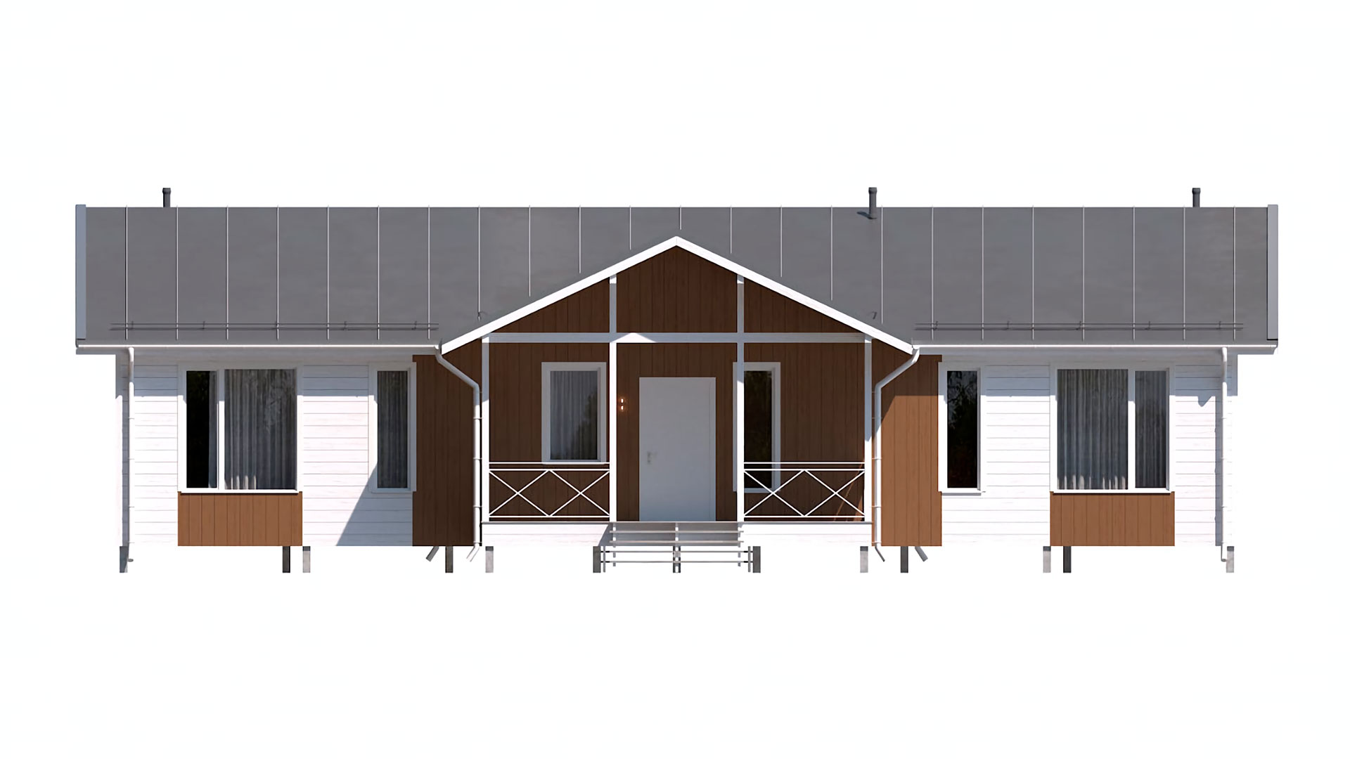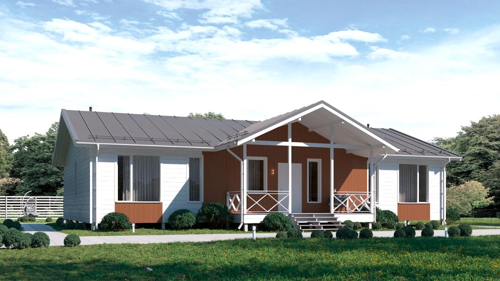 Проект "Фаворит" - солидный одноэтажный дом для большой семьи. Четыре просторные раздельные комнаты, гардеробная, большая кухня-столовая, технические и хозяйственные помещения, летняя терраса - есть всё что необходимо для постоянного проживания в загородной зоне. Дом на свайном фундаменте, построенный всего за 50 дней, можно эксплуатировать точно так же, как традиционные здания из кирпича, дерева и камня.