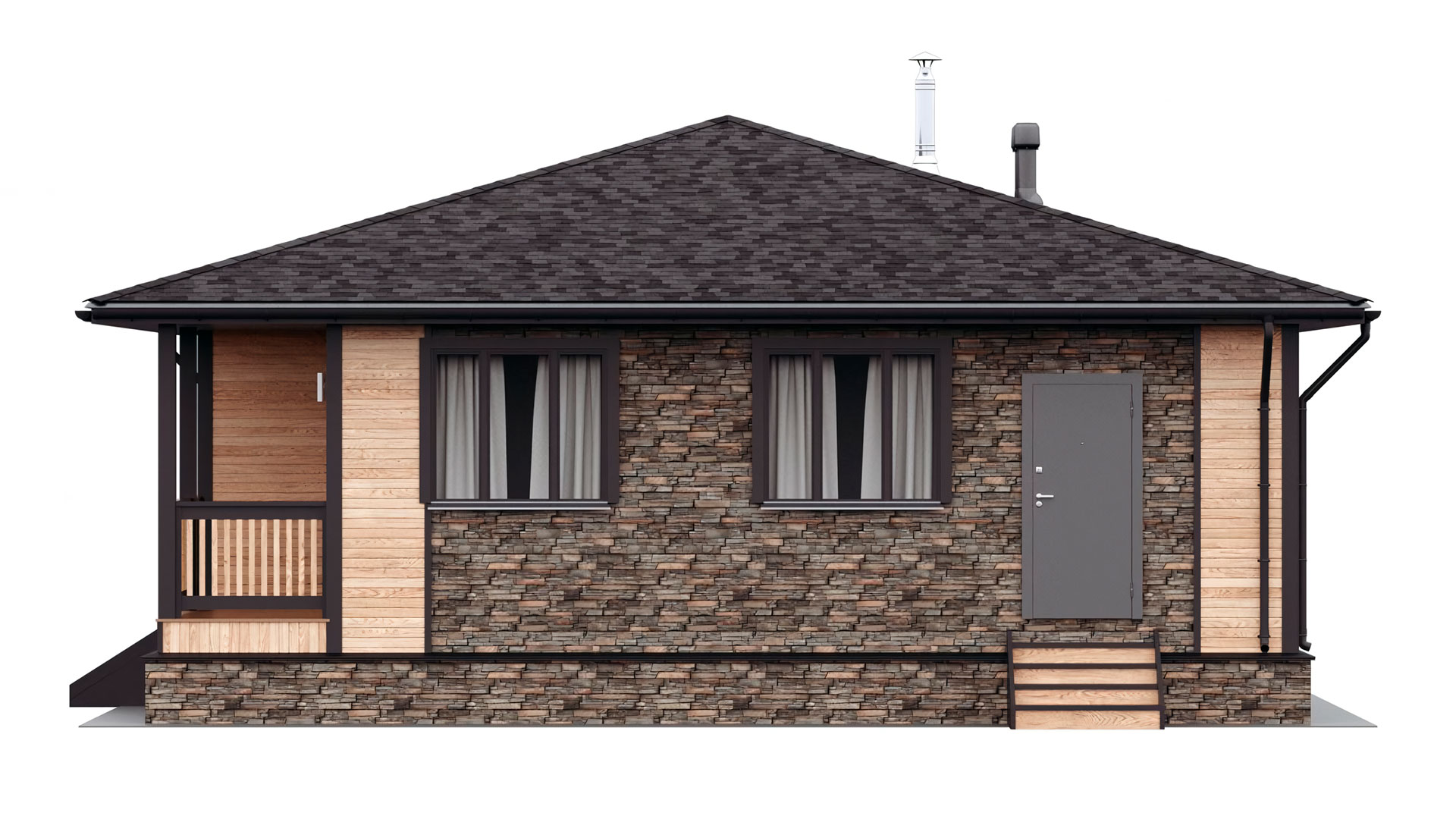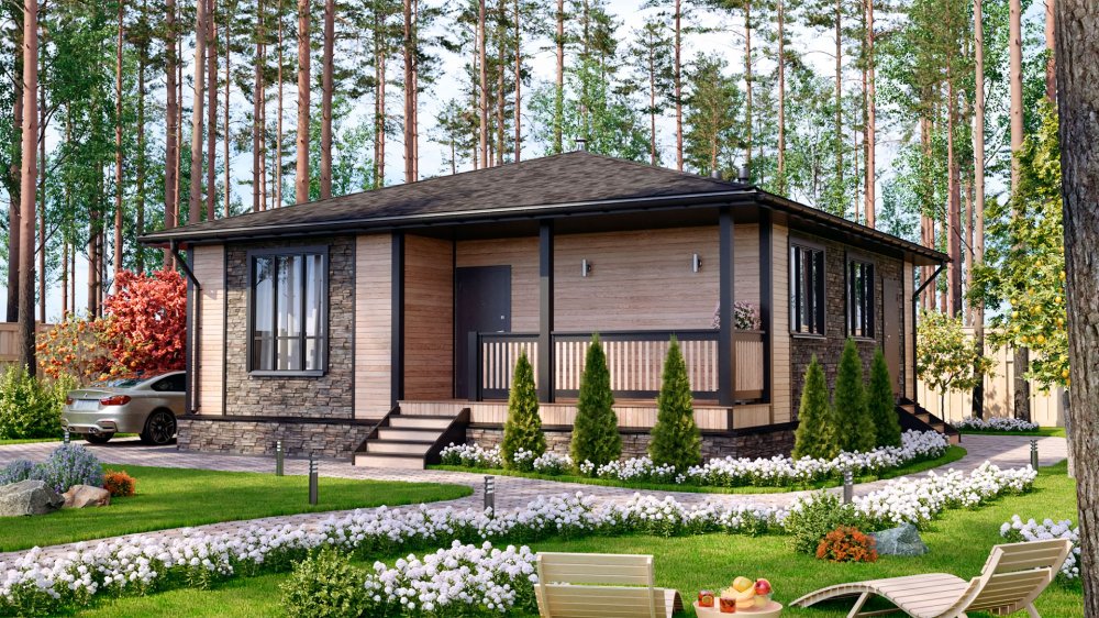 Каскад-мини — проект одноэтажного загородного дома классической архитектуры с удобной планировкой и большими окнами. Проектом предусмотрены две изолированные комнаты, большая кухня, объединенная с просторной гостиной, санузел, холл. Из тамбура есть выход на террасу, которая служит дополнительным функциональным пространством в летнее время.