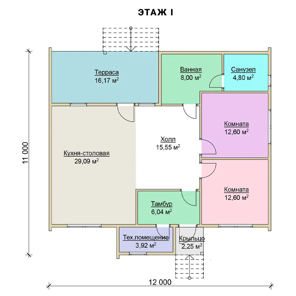 Каркасный дом "Комфорт" - это просторный коттедж для постоянного проживания, выдержанный в современном минималистическом стиле. Планировка дома отличается удобством и рациональным распределением пространства. В здании находятся 3 большие раздельные комнаты, кухня-столовая с выходом на широкую террасу, ванная, санузел, техническое помещение. Есть в доме большой холл, который может использоваться как пространство для отдыха, или как функциональная зона (например, бильярдная).