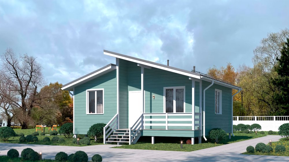Лесник 3 - загородный дом с оригинальной архитектурой, удобной планировкой комнат, стильной отделкой фасадов. В течение 35-50 дней каркасный дом возводится на небольшом участке, где есть свой огород или фруктовый сад. При каркасном строительстве используется свайный фундамент, защищающий строение от сырости и промерзания. Уютный коттедж с двумя спальными комнатами, большой кухней-столовой и дополнительными помещениями станет комфортным местом проживания для одного человека или семейной пары.