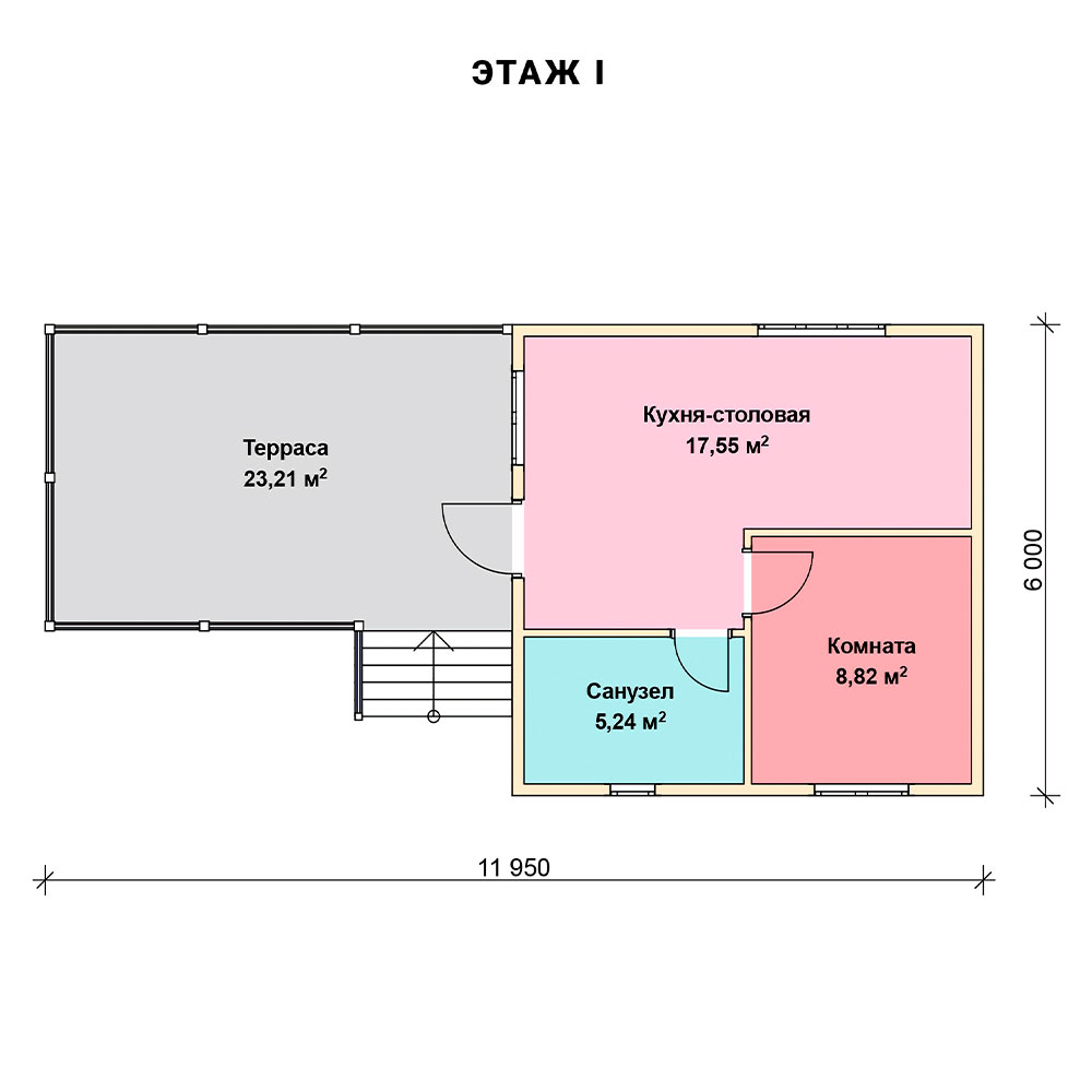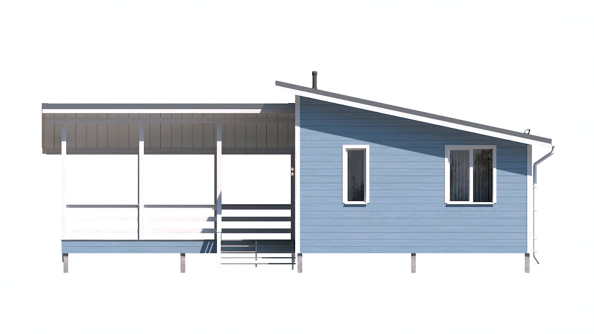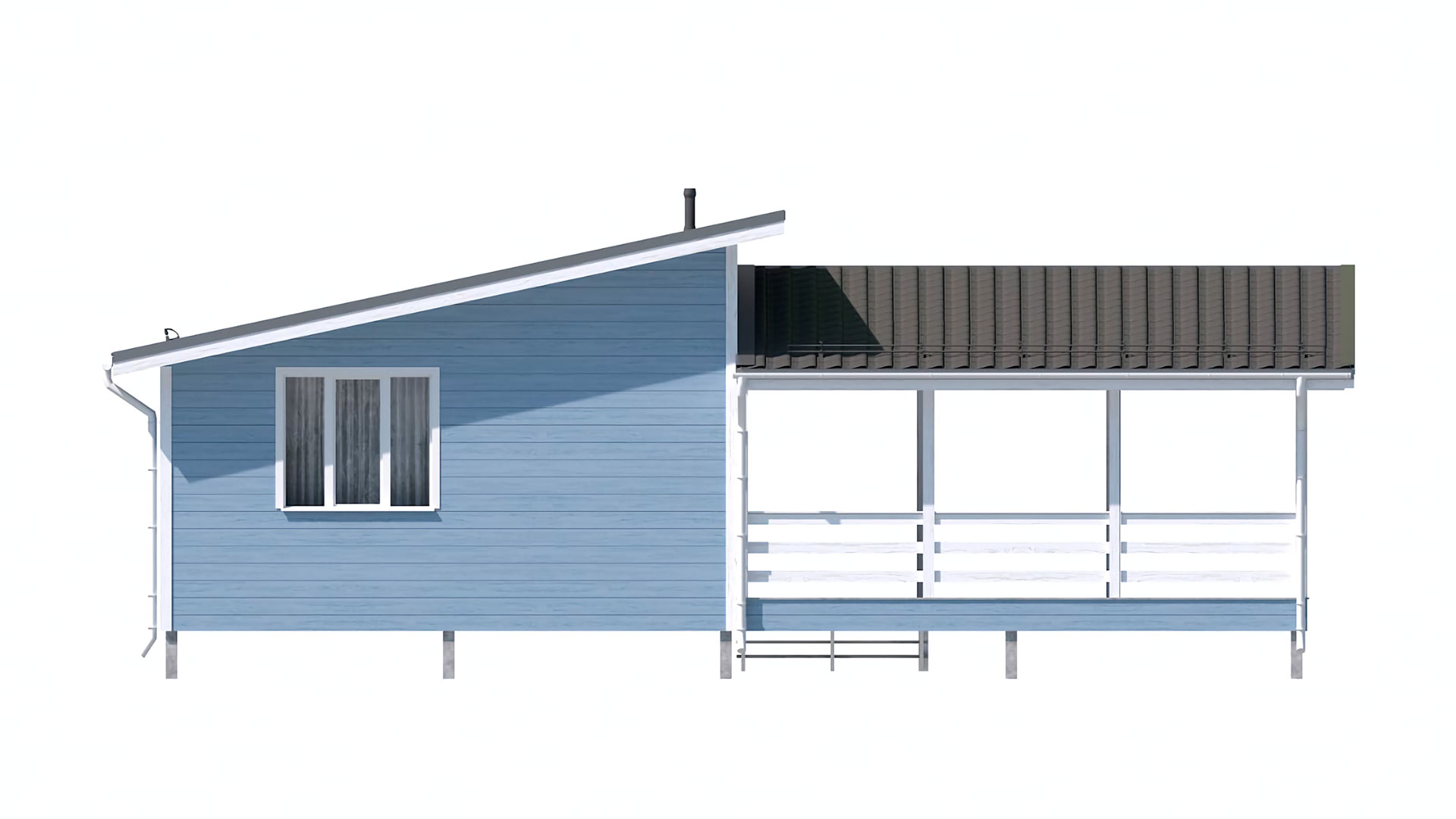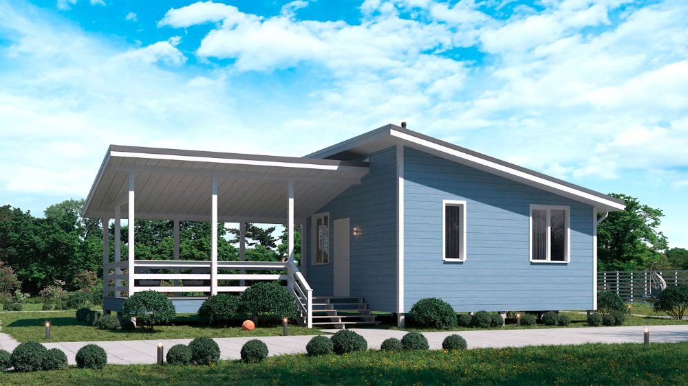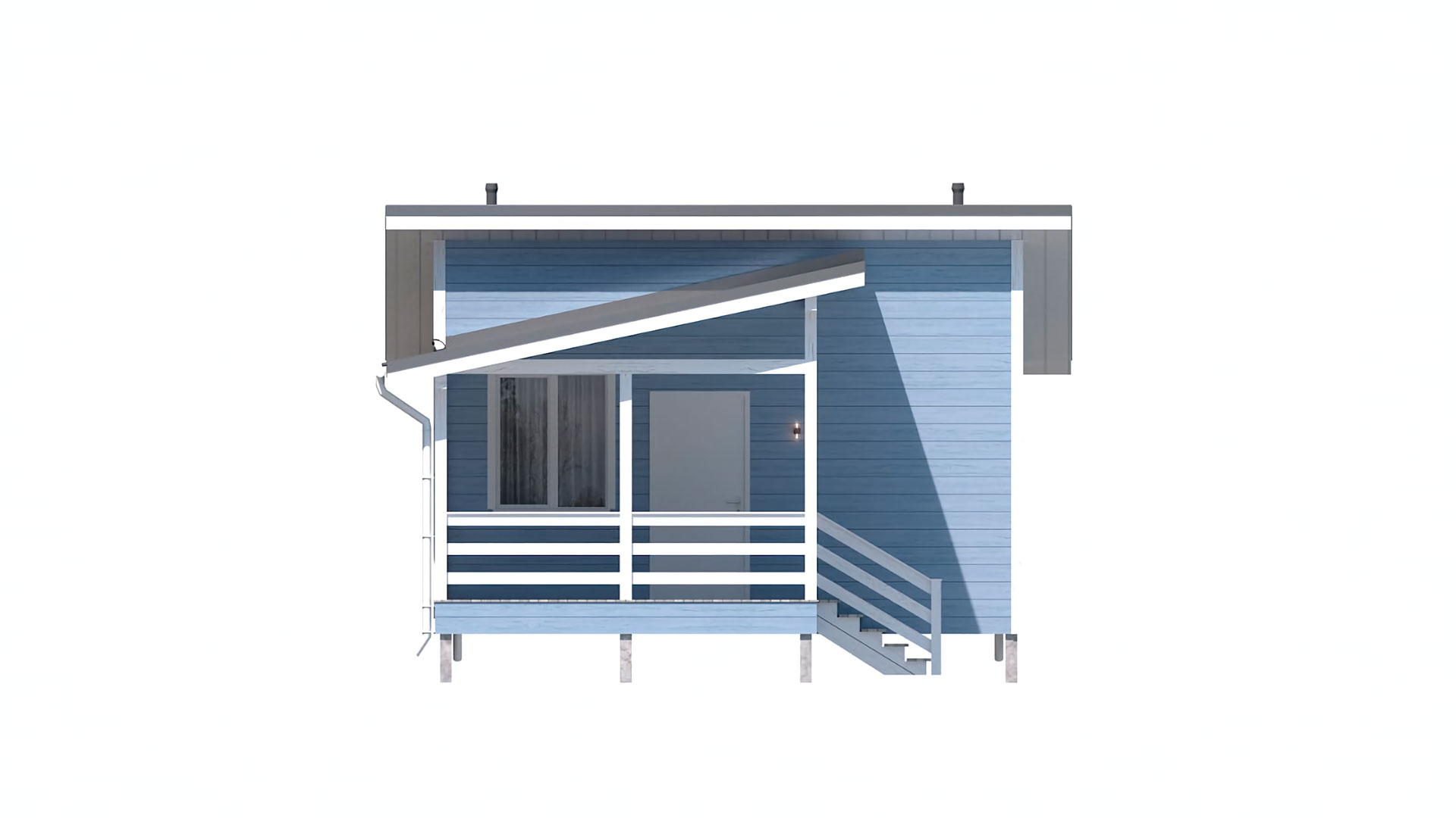 Загородный дом "Радость 1" - проект с необычной архитектурой комнат и зонированием жилого пространства. В компактном здании с наклонной крышей всего одна комната, кухня-столовая и санузел. Главная особенность - большая терраса под навесом, привыкающая к строению (площадь 23,21 м2). Собственник недвижимости может обустроить обеденную зону, мастерскую, площадку для отдыха, спортивных или творческих занятий. Если террасу утеплить и сделать остекление, получится дополнительное жилое пространство, уютное и светлое.