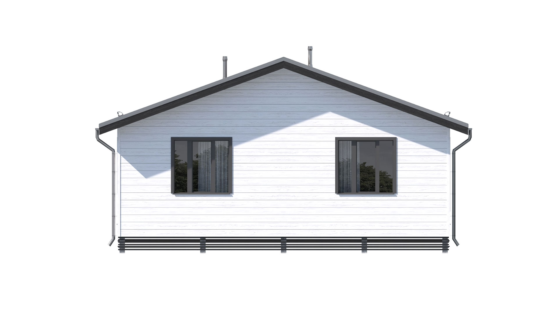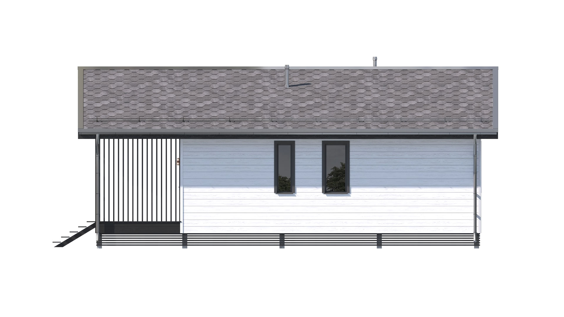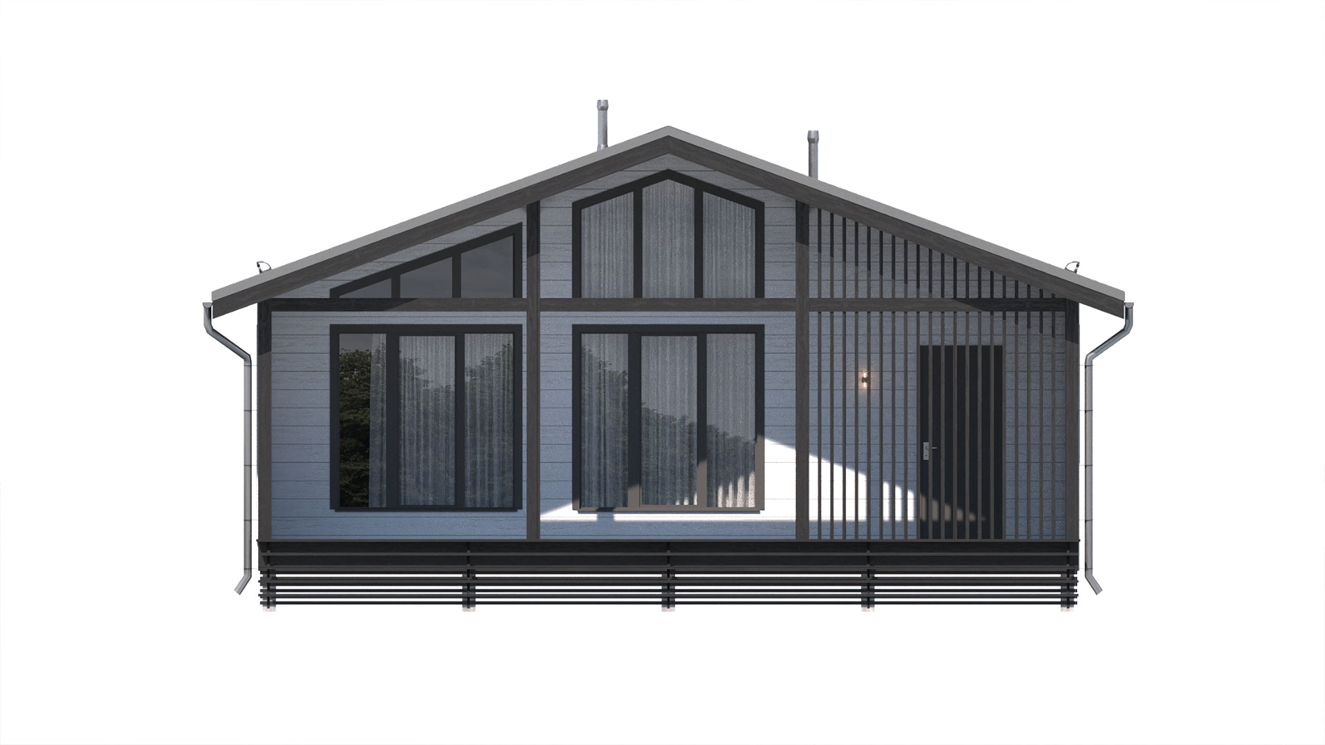 Каркасный дом "Семейный" построен в минималистическом стиле с элементами конструктивизма. Фасады с чёткими геометрическими формами, большие квадратные и асимметричные окна в центральной части дома, решетчатое вертикальное ограждение у входа, - составляющие модной загородной архитектуры.