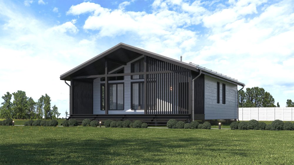 Каркасный дом «Семейный» выполнен в современном минималистичном дизайне с элементами конструктивизма.