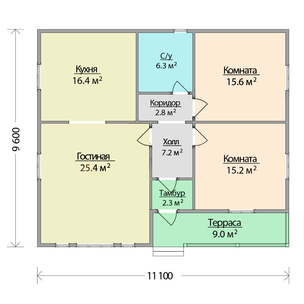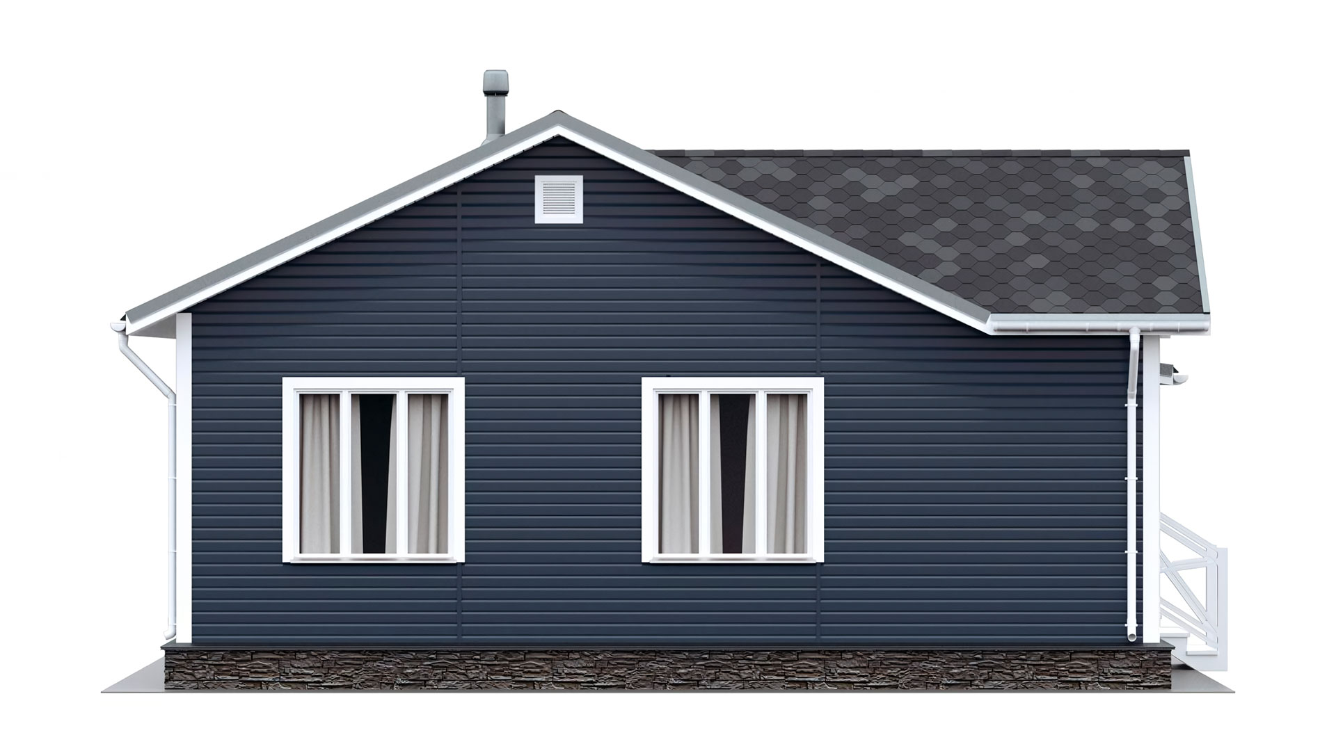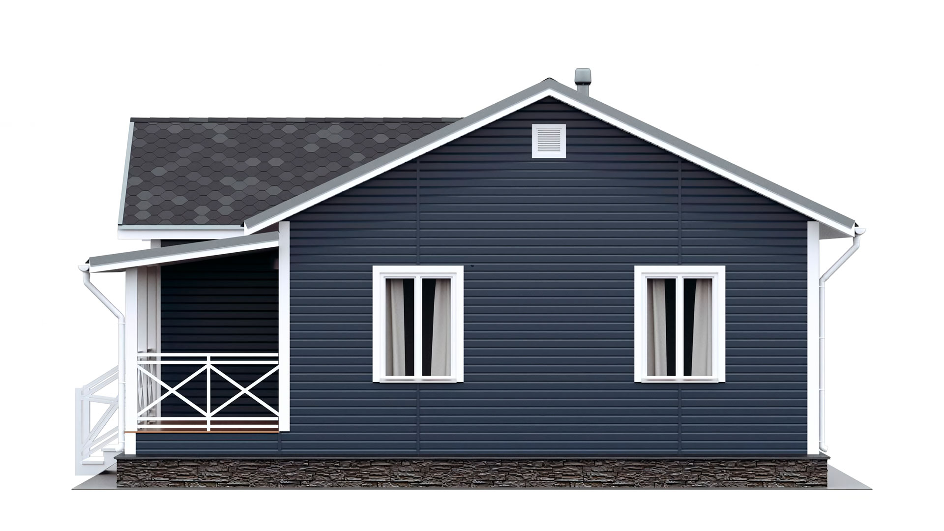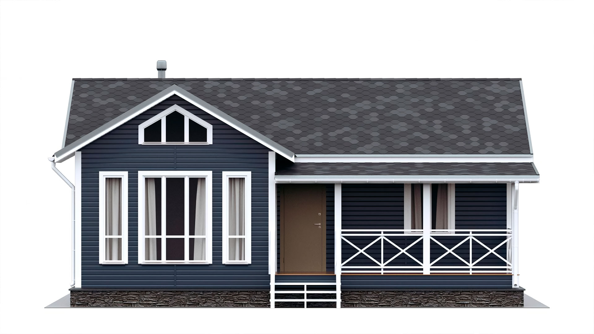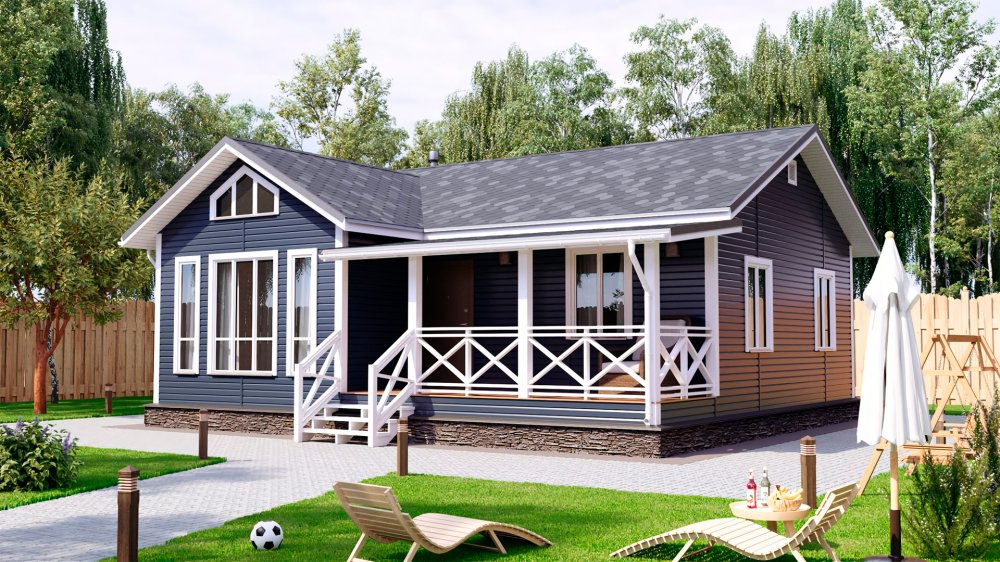 Каркасный дом «Спутник 5» представляет собой комфортабельный загородный коттедж, выдержанный в современном архитектурном стиле. Отличительные особенности – большие окна, красивая облицовка фасадов, фигурная крыша, наличие большой террасы под свесом кровли. Планировка соответствует современным правилам эргономики, и отличается большим удобством. Большая кухня соединена с гостевой комнатой, рядом с небольшим холлом находятся 2 изолированных помещения (спальни), из тамбура есть выход на широкую открытую террасу (можно застеклить, при желании покупателя).