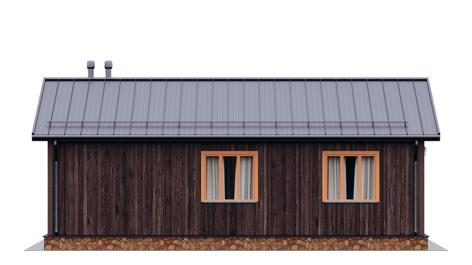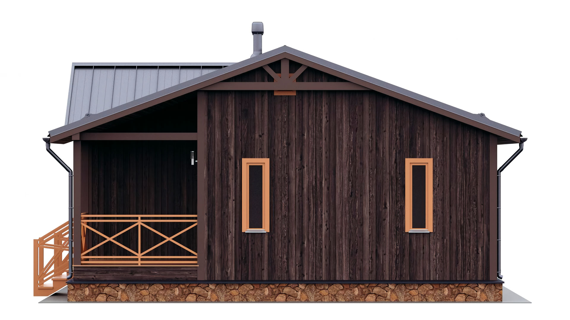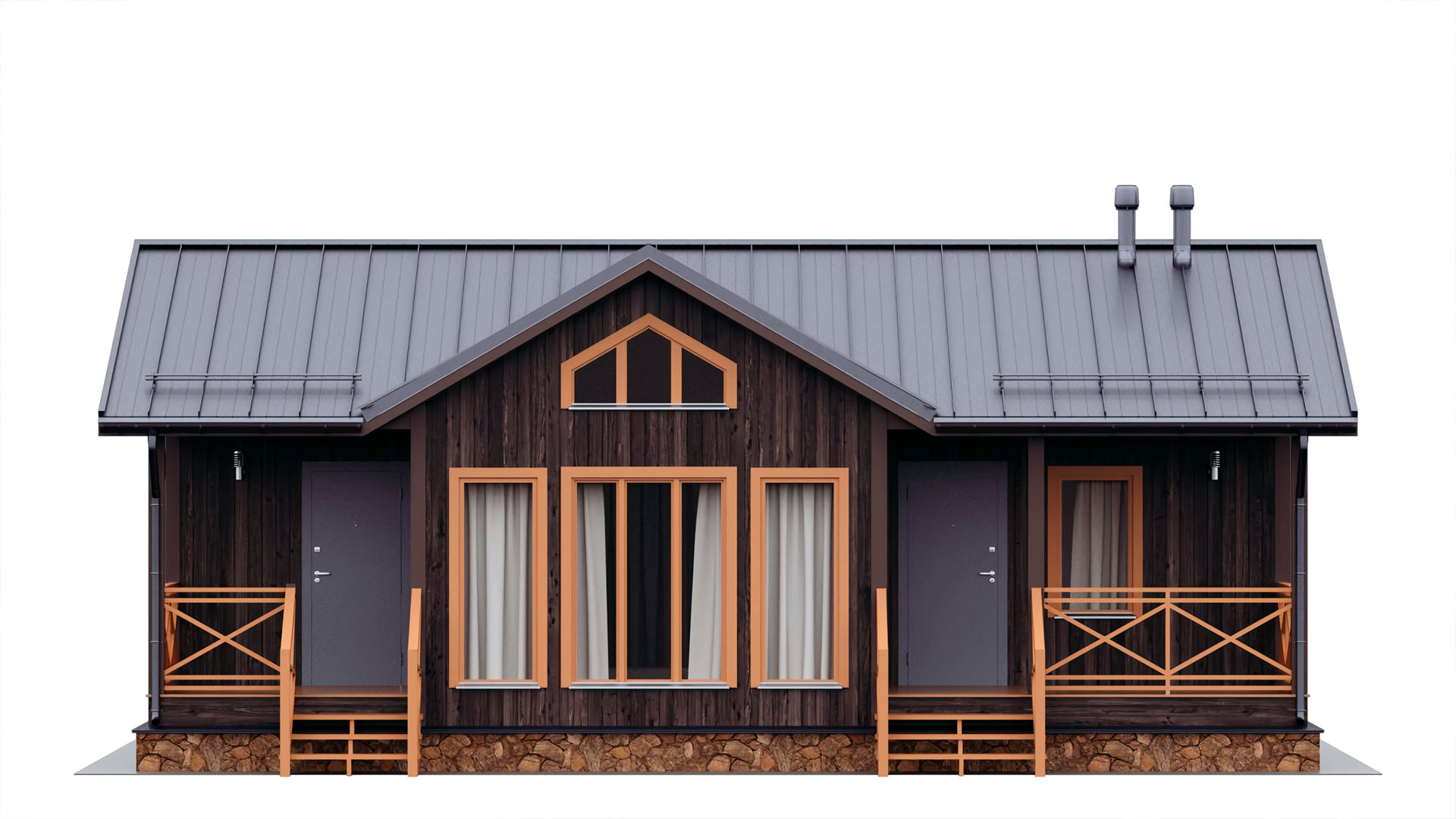 Каркасный дом "Спутник+" - комфортабельный коттедж с фигурной крышей и двумя раздельными входами. Такое решение позволяет разделить жилое пространство на приватные зоны (что особенно важно, если в здании проживают две семьи, или пожилые родители). Центральная часть коттеджа почти полностью застеклена, с боковых сторон расположены небольшие деревянные лестницы, ведущие на террасу и крыльцо. Здание облицовано имитацией бруса, или виниловым сайдингом (в зависимости, от комплектации).