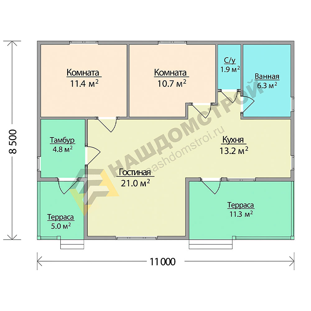 Проект Спутник+ с угловой террасой. Проект имеет размер 8,5х11 м.