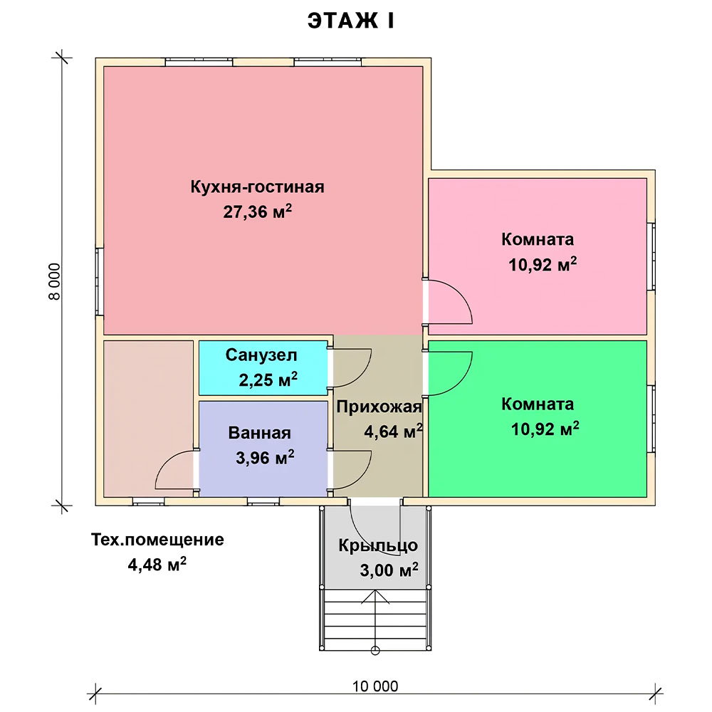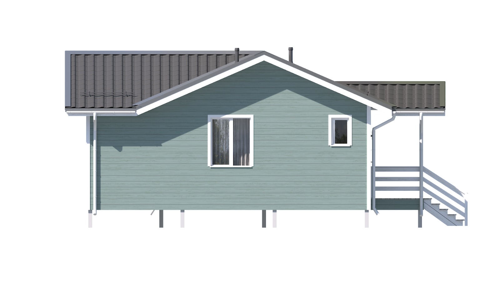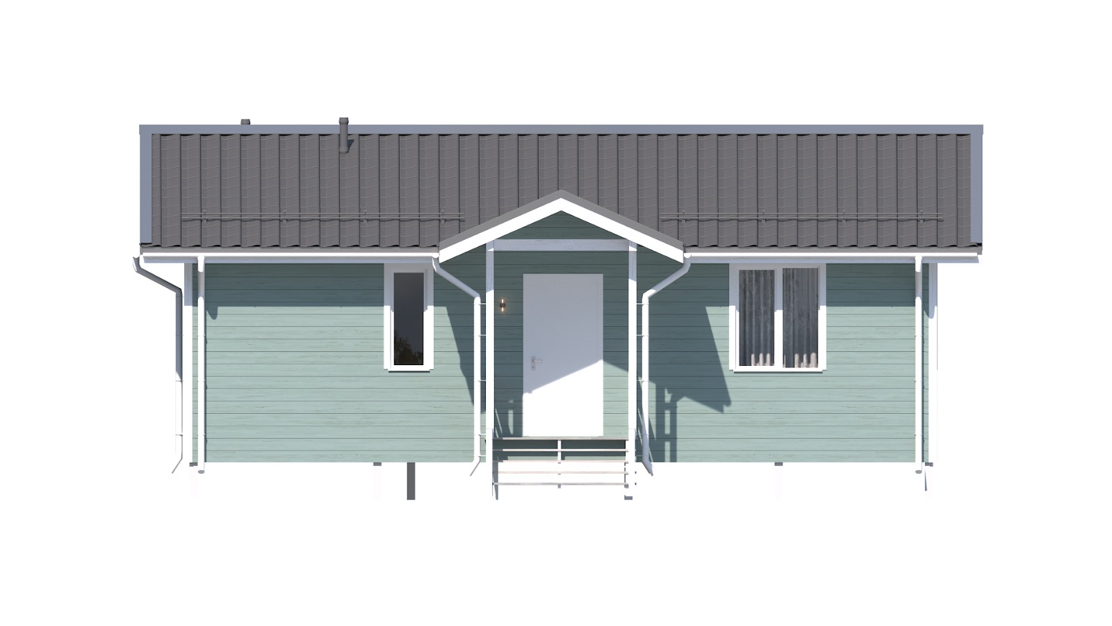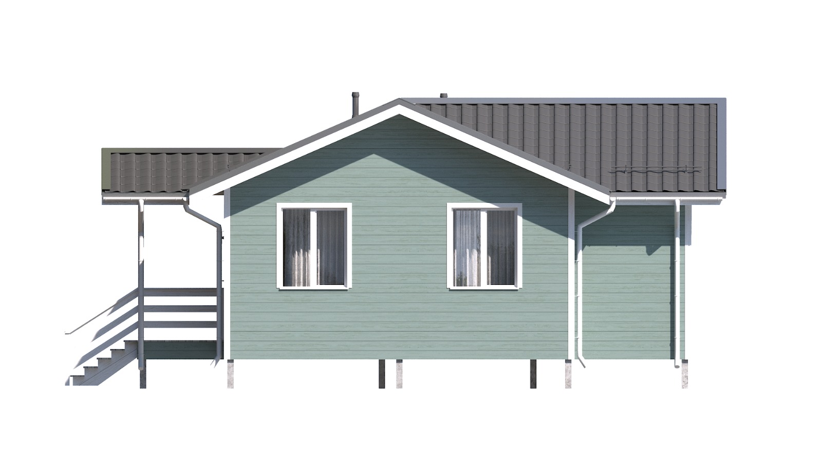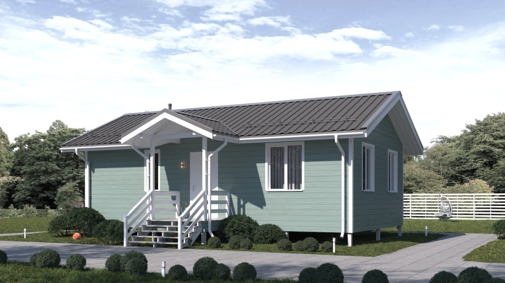 Компактный каркасный дом с высоким крыльцом, подходящий для дачного и постоянного проживания, выглядит в загородном ландшафте современно и привлекательно. Проект "Уют" доступен для городских жителей со средним доходом. В доме есть две комнаты, кухня-гостиная, ванная комната., санузел, техническое помещение. Заказчик может выбрать вариант фасадной и внутренней отделки, а также пакет дополнительных услуг по благоустройству территории и прокладке коммуникаций.