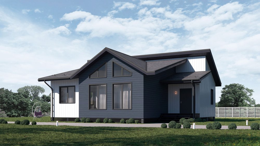 Одноэтажный каркасный дом "Жемчужина" лучшим образом подойдет для проживания большой семьи, где есть пожилые люди и дети. Лаконичная современная архитектура, красивая отделка фасадов, рациональная планировка, большая площадь жилого пространства определили популярность нового проекта.