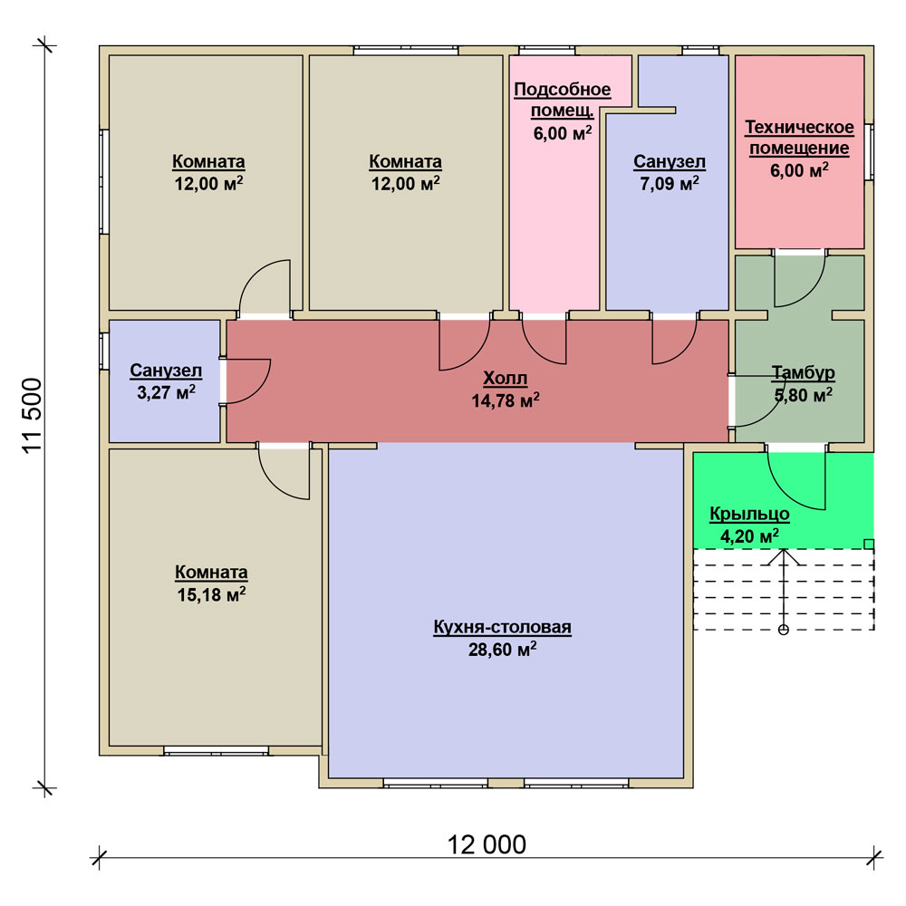 Планировкой дома предусмотрены 3 раздельные комнаты, просторная кухня-столовая, большой холл, соединенный с тамбуром, два санузла. Есть также дополнительная комната, которую можно использовать как гардеробную или хозяйственный блок. В техническом помещении располагается коммуникационное оборудование. В каркасном доме нет лестниц и перепадов по высоте, что особенно удобно для семей с маленькими детьми.