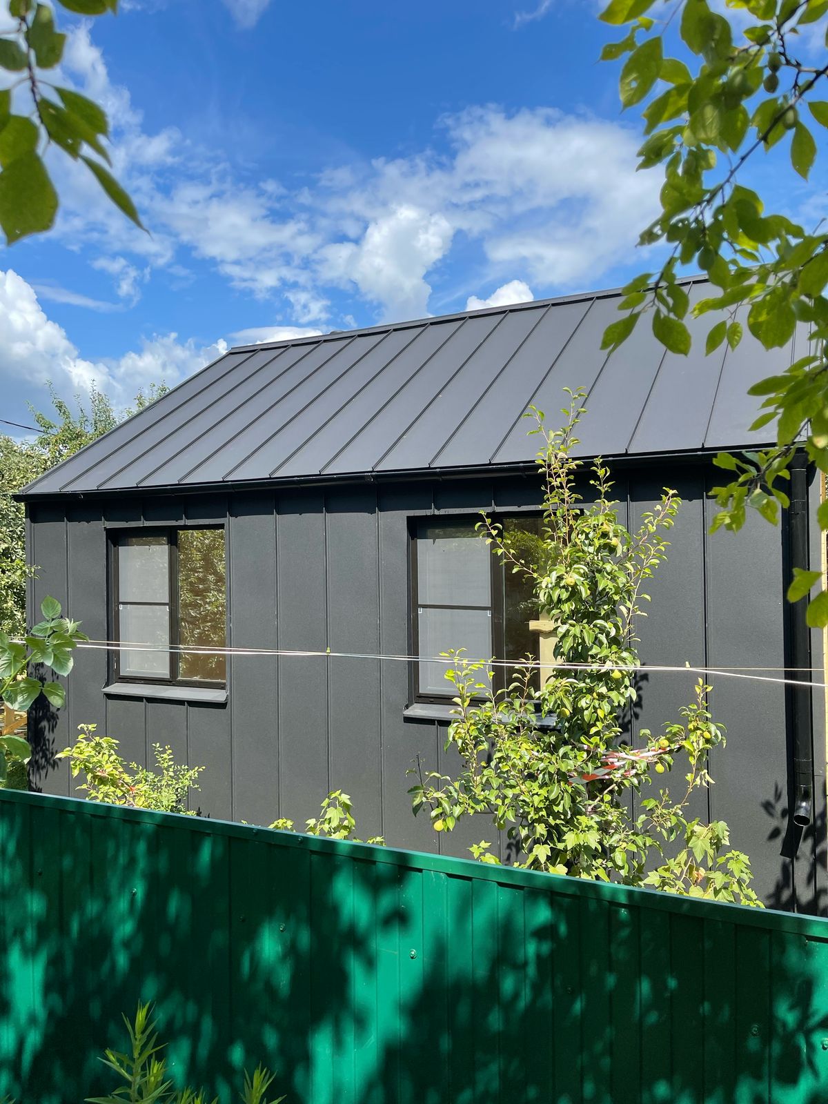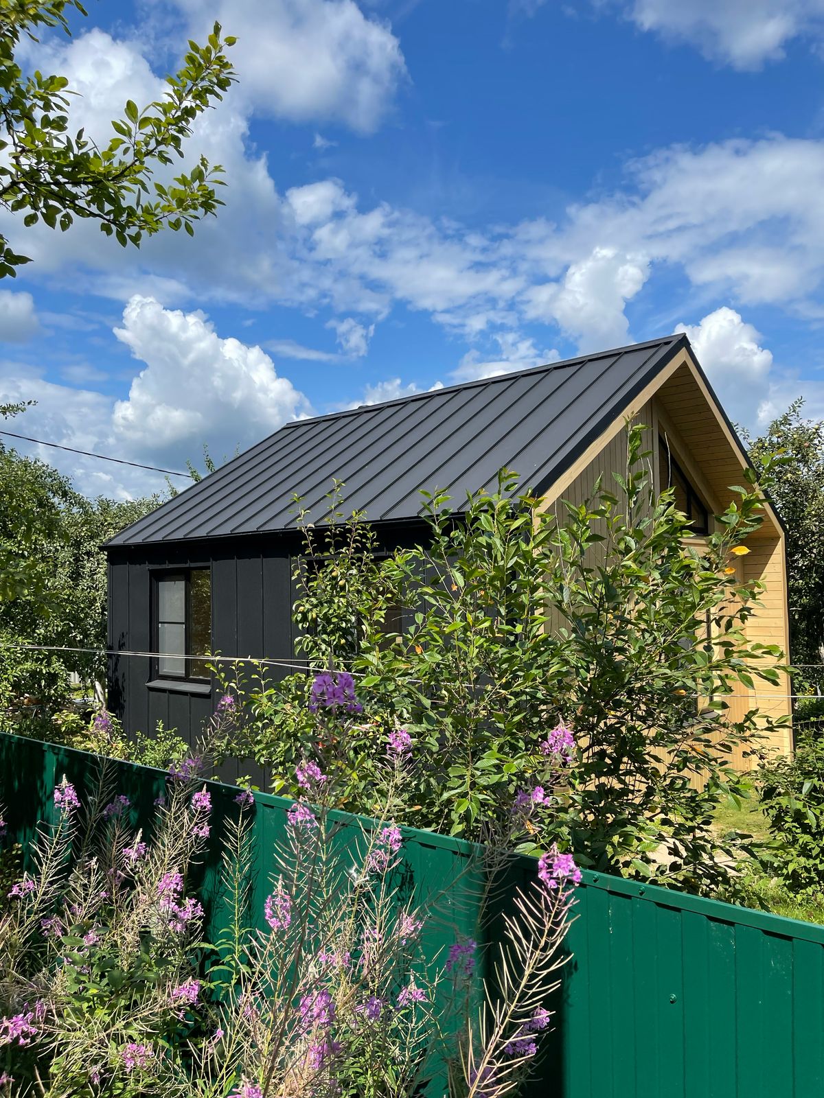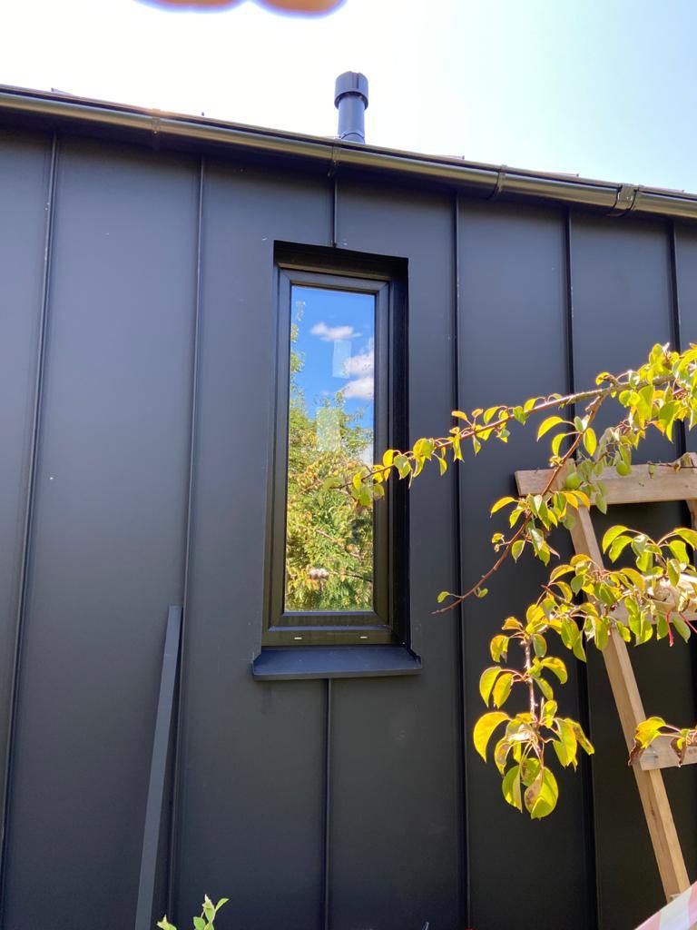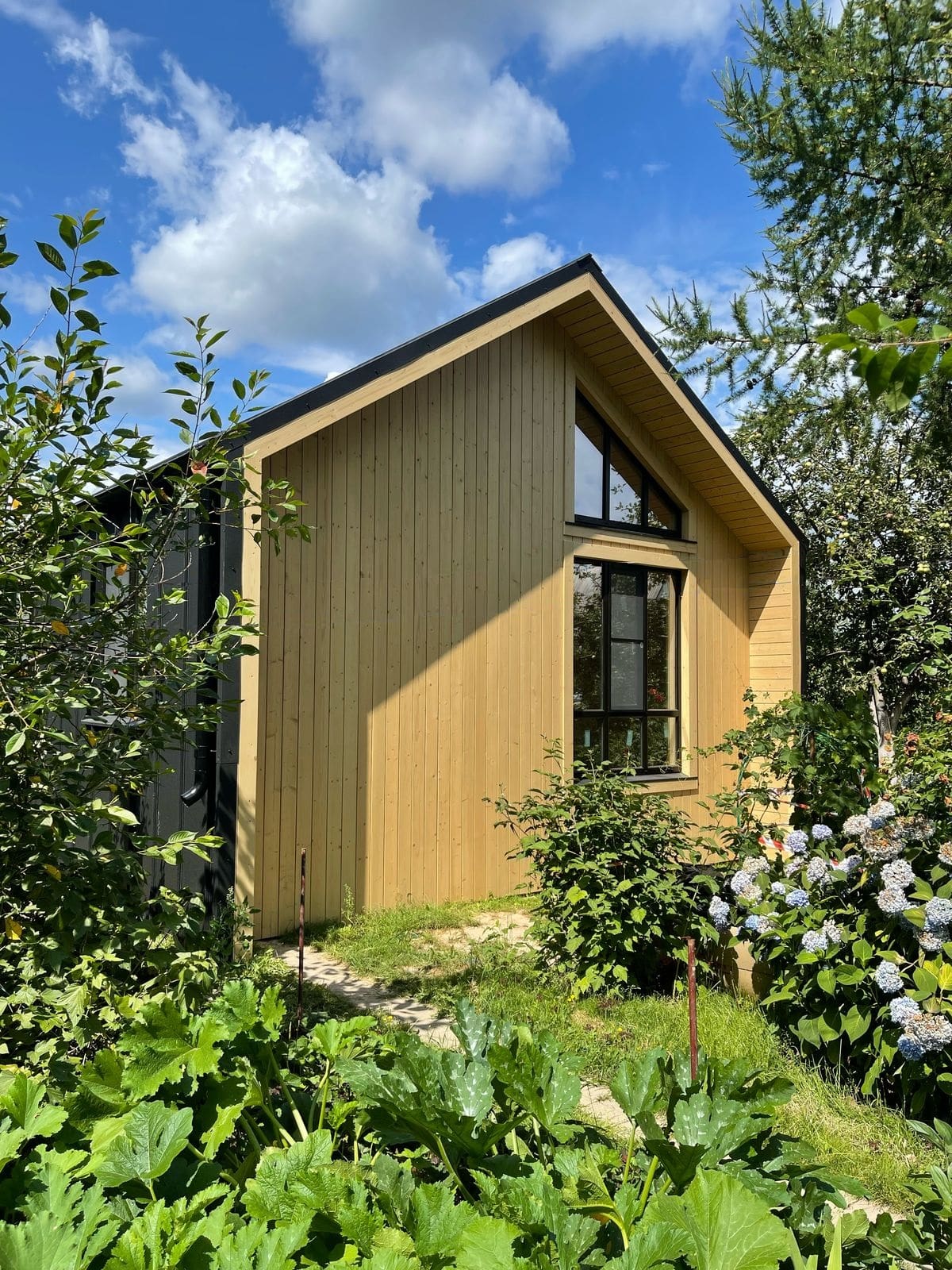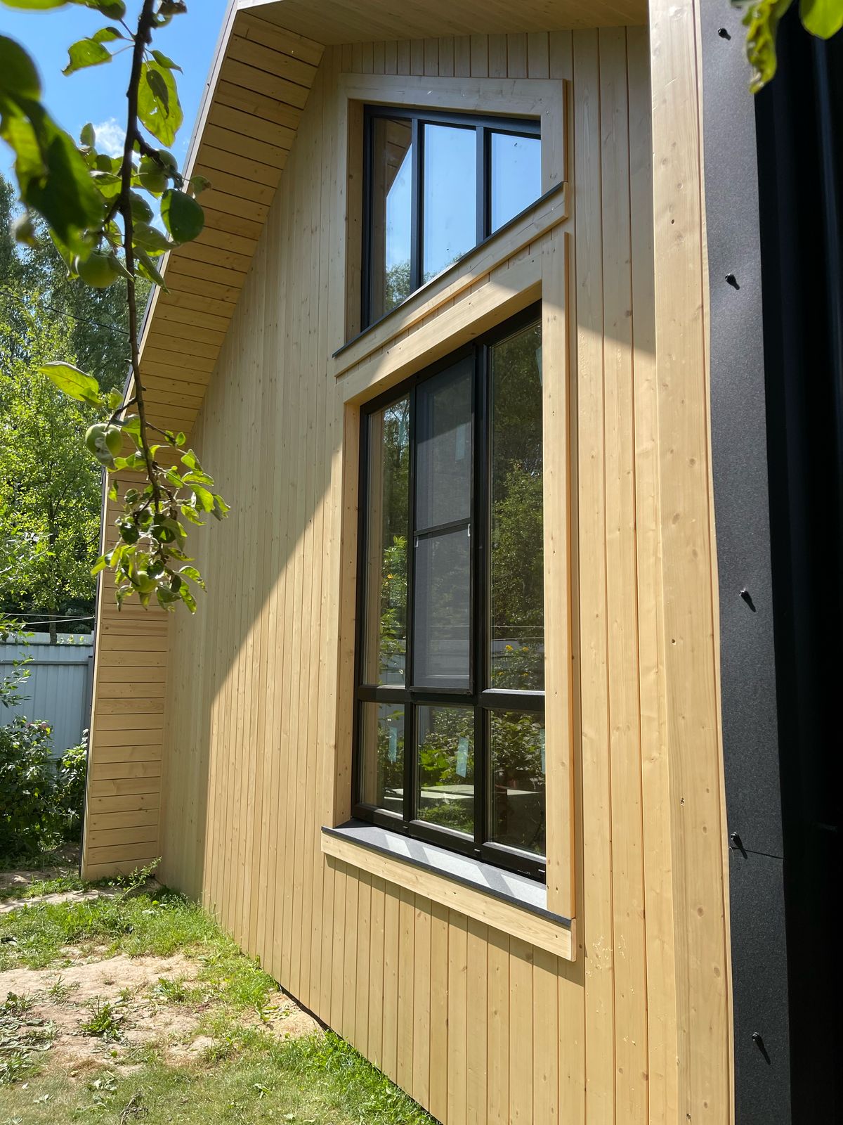 Здание украшают панорамные окна классической и фигурной формы. Фасад дома облицован пленкеном, остекление - оконные системы на основе профиля "Рехау", внутренняя отделка стен - имитация бруса, потолок и пол - плиты ОСП 9 мм. Заказчик пожелал, чтобы был установлен водосток и утепление здания по периметру. Дом строился на маленьком дачном участке, но при этом всё же осталось место для небольшого огорода и зоны отдыха.
