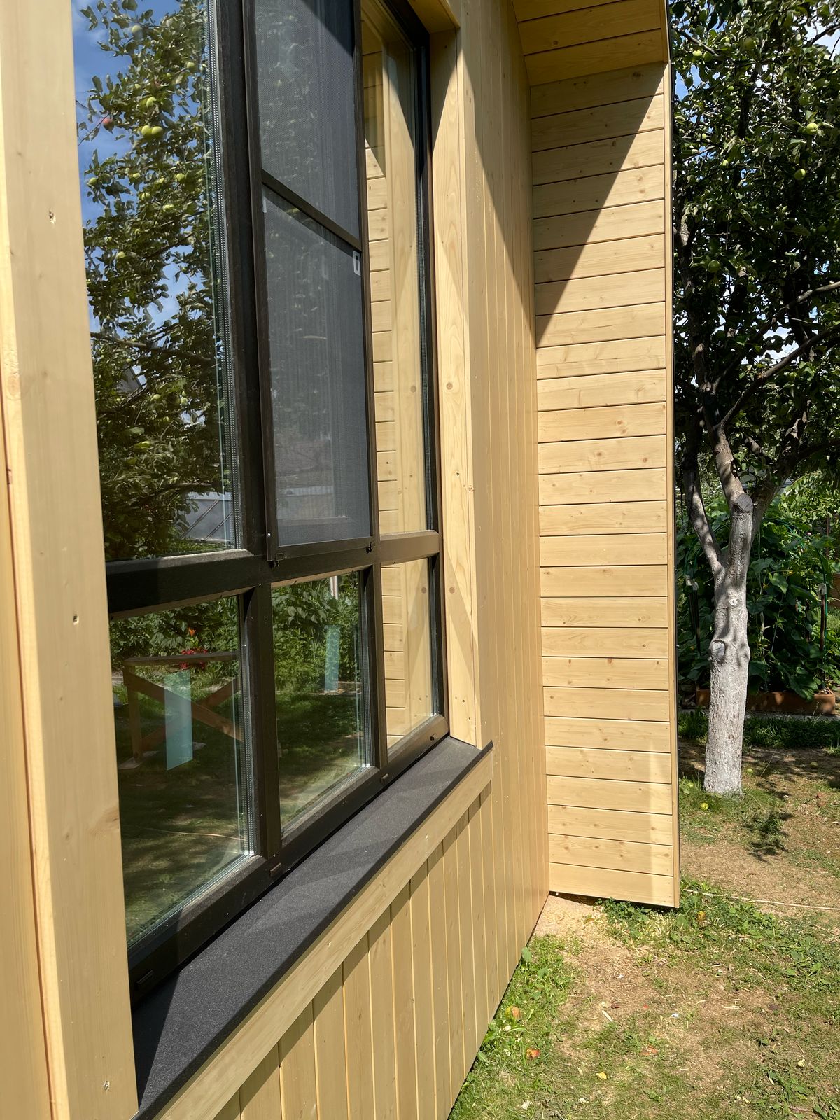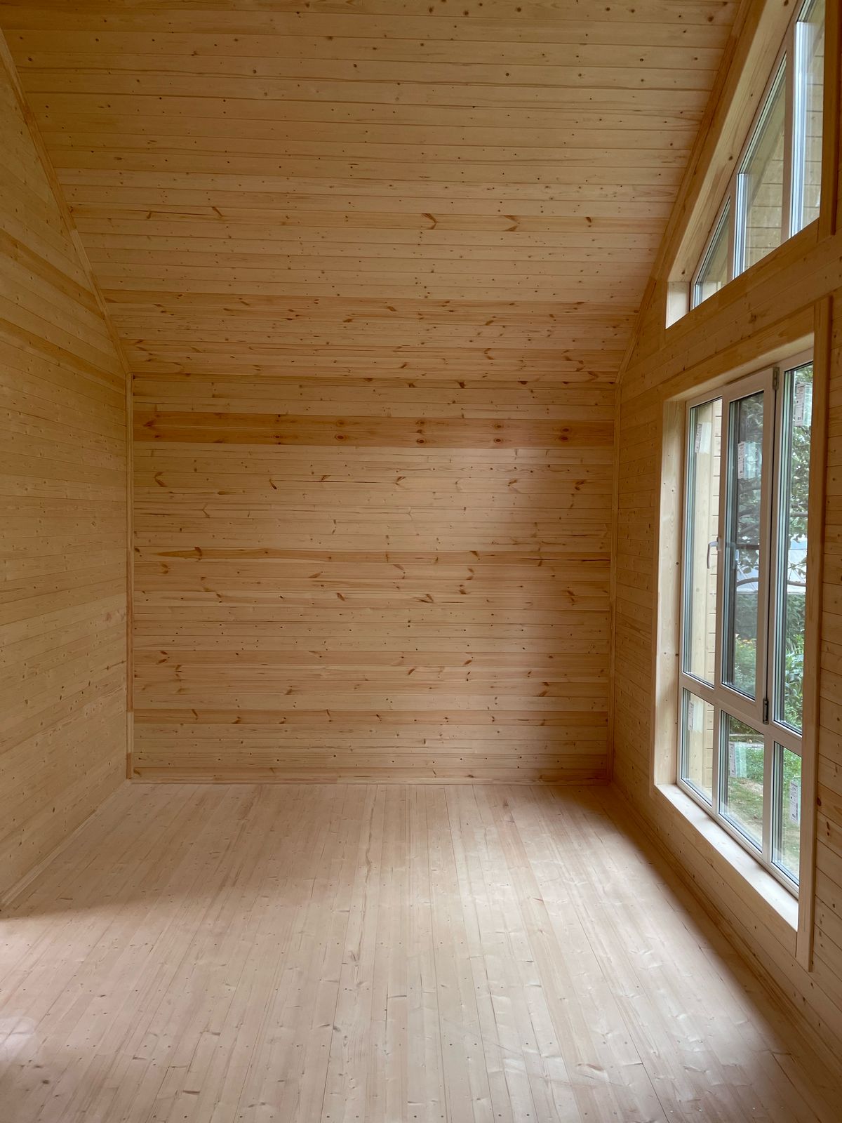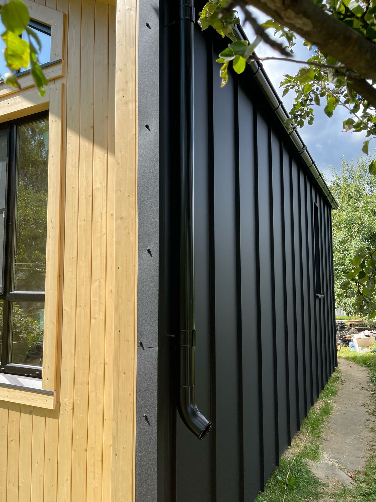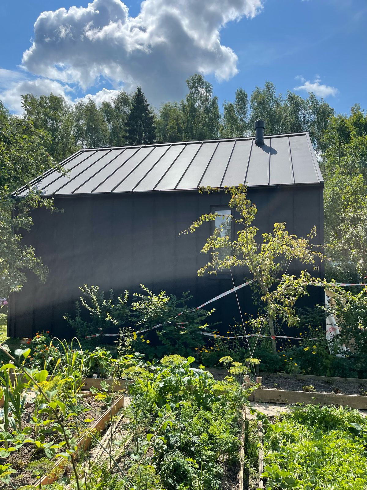 Здание украшают панорамные окна классической и фигурной формы. Фасад дома облицован пленкеном, остекление - оконные системы на основе профиля "Рехау", внутренняя отделка стен - имитация бруса, потолок и пол - плиты ОСП 9 мм. Заказчик пожелал, чтобы был установлен водосток и утепление здания по периметру. Дом строился на маленьком дачном участке, но при этом всё же осталось место для небольшого огорода и зоны отдыха.