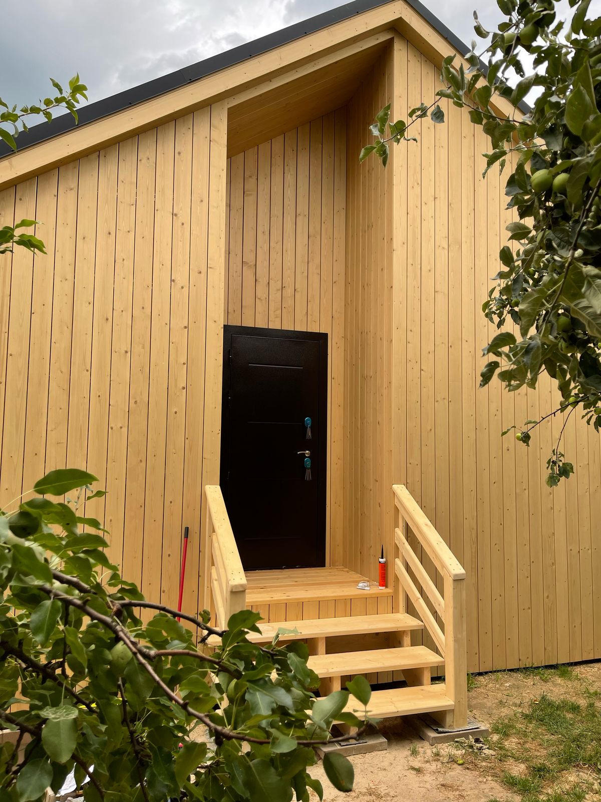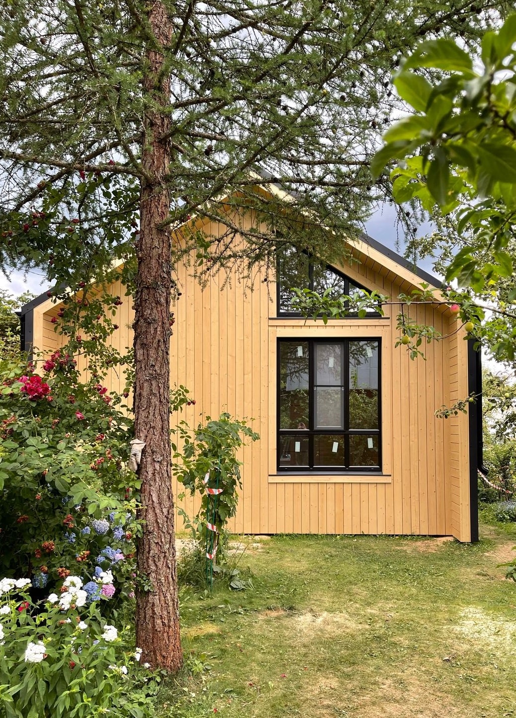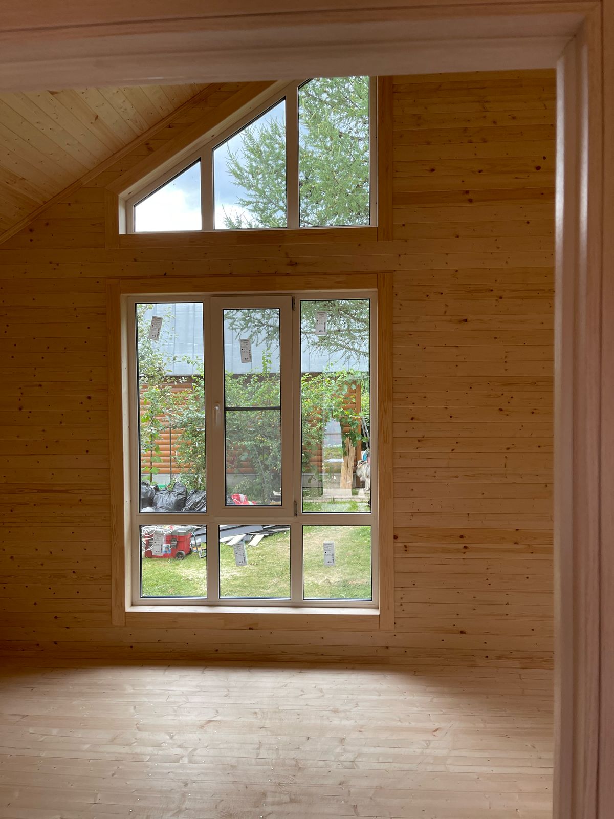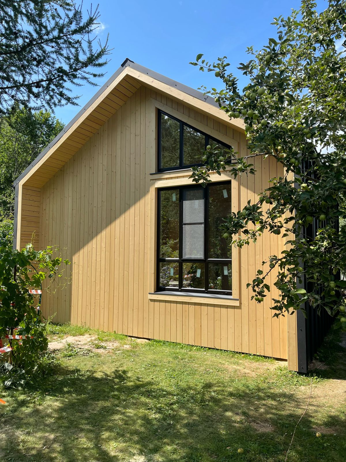Здание украшают панорамные окна классической и фигурной формы. Фасад дома облицован пленкеном, остекление - оконные системы на основе профиля "Рехау", внутренняя отделка стен - имитация бруса, потолок и пол - плиты ОСП 9 мм. Заказчик пожелал, чтобы был установлен водосток и утепление здания по периметру. Дом строился на маленьком дачном участке, но при этом всё же осталось место для небольшого огорода и зоны отдыха.