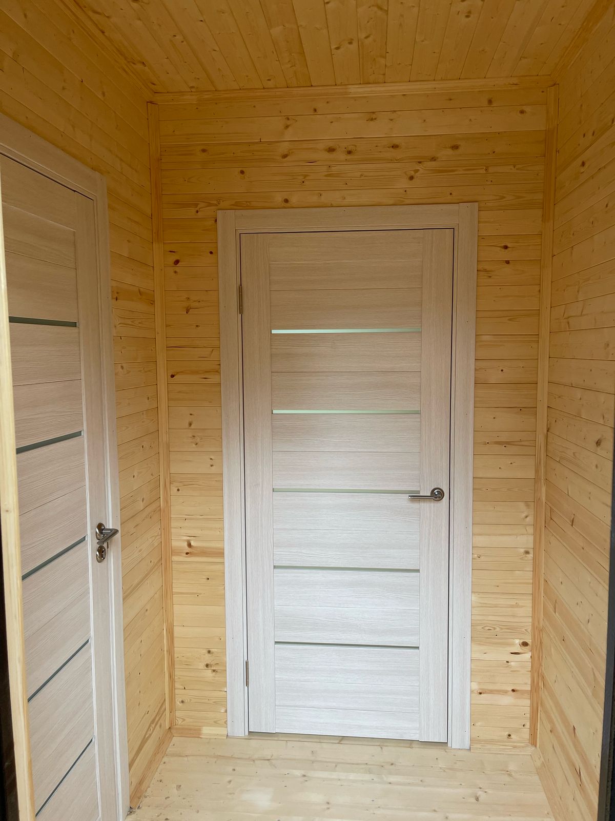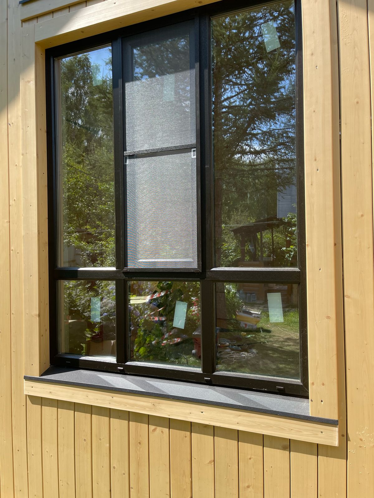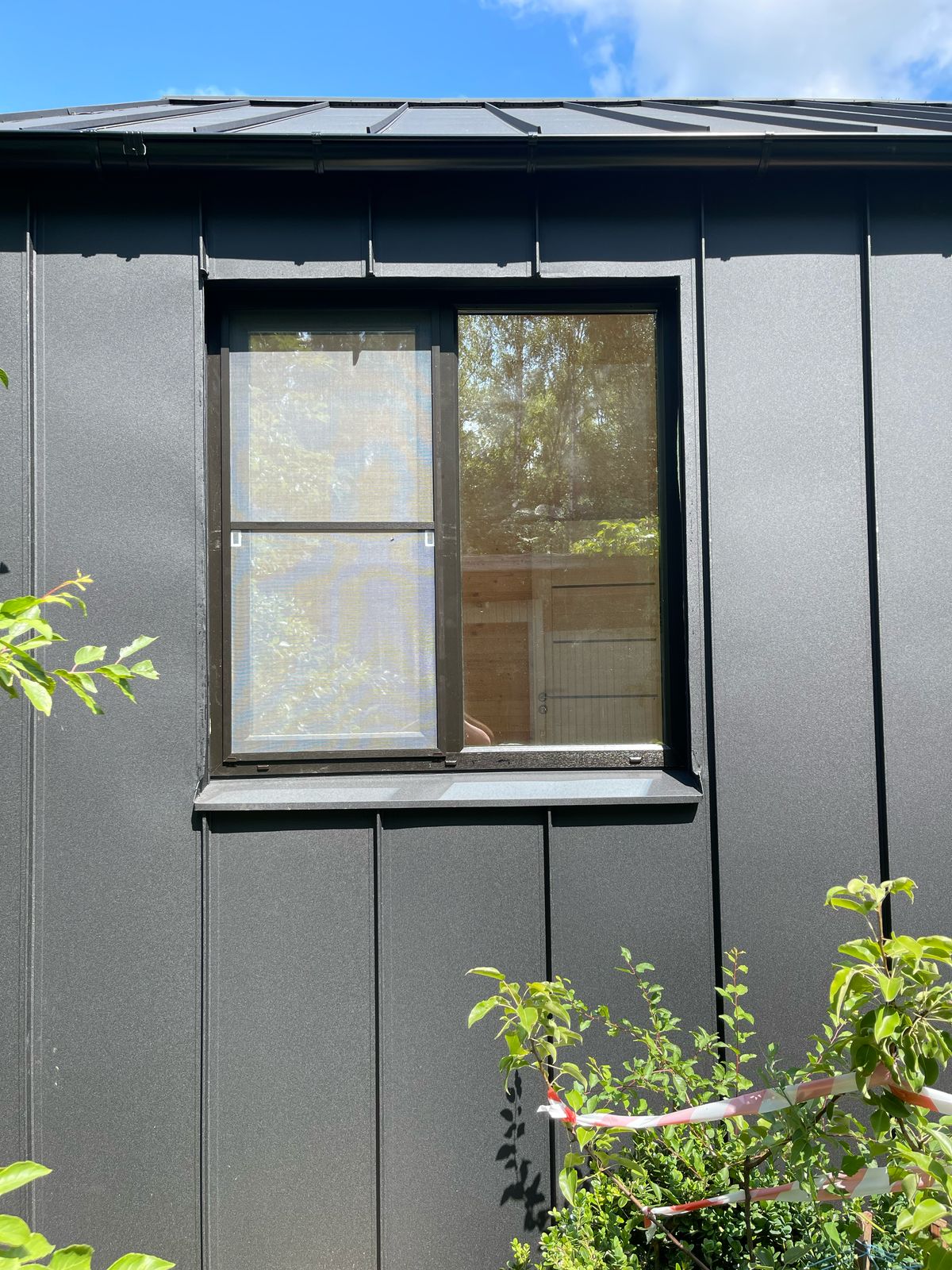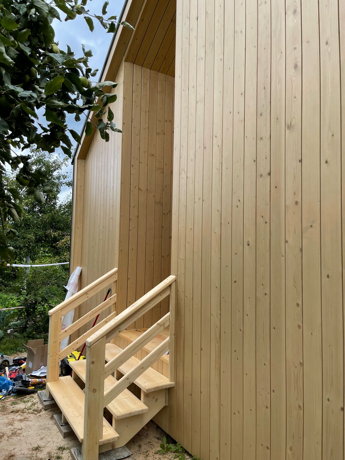 Здание украшают панорамные окна классической и фигурной формы. Фасад дома облицован пленкеном, остекление - оконные системы на основе профиля "Рехау", внутренняя отделка стен - имитация бруса, потолок и пол - плиты ОСП 9 мм. Заказчик пожелал, чтобы был установлен водосток и утепление здания по периметру. Дом строился на маленьком дачном участке, но при этом всё же осталось место для небольшого огорода и зоны отдыха.