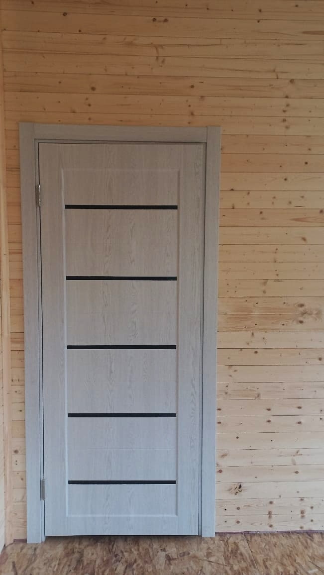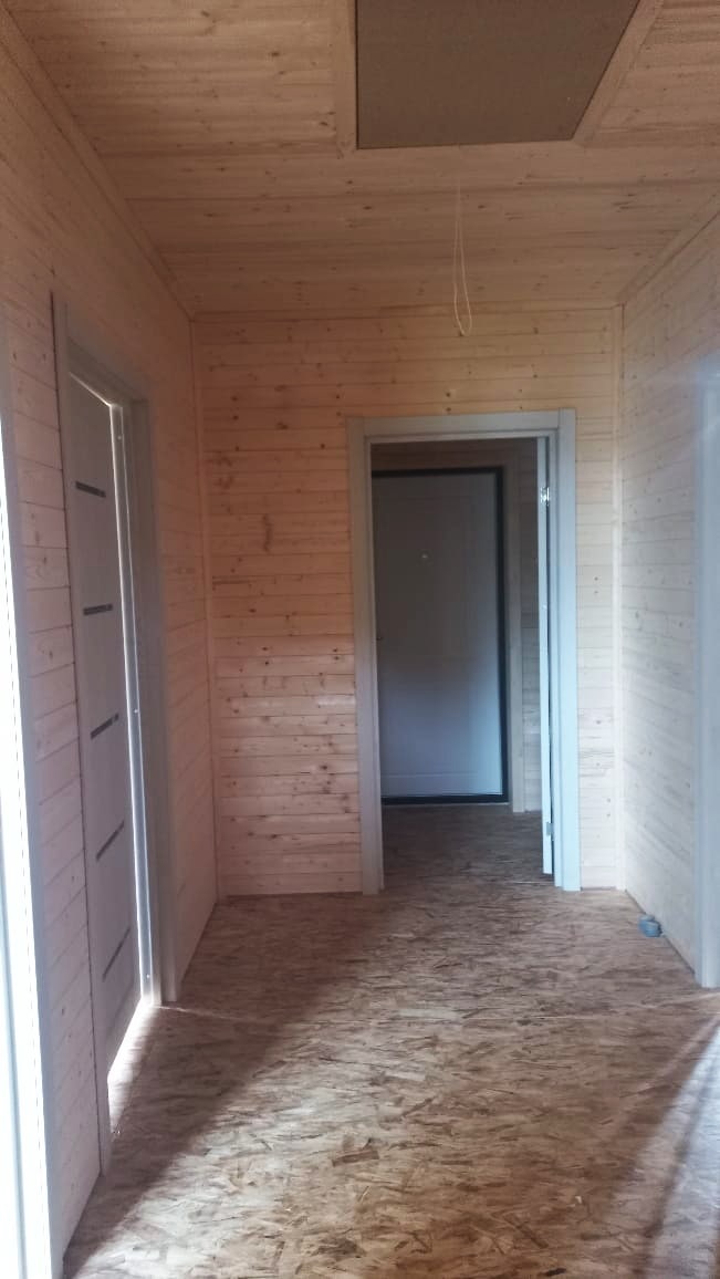 Двускатный потолок визуально увеличивает внутреннее пространство, делает помещения еще более светлыми и уютными. Межкомнатные двери с покрытием из эко-шпона органично вписываются в интерьер комфортабельного загородного дома. Обратите внимание на геометрические линии стен и пола - нигде нет просветов и зазоров, поверхности - идеально ровные.