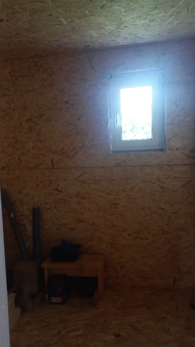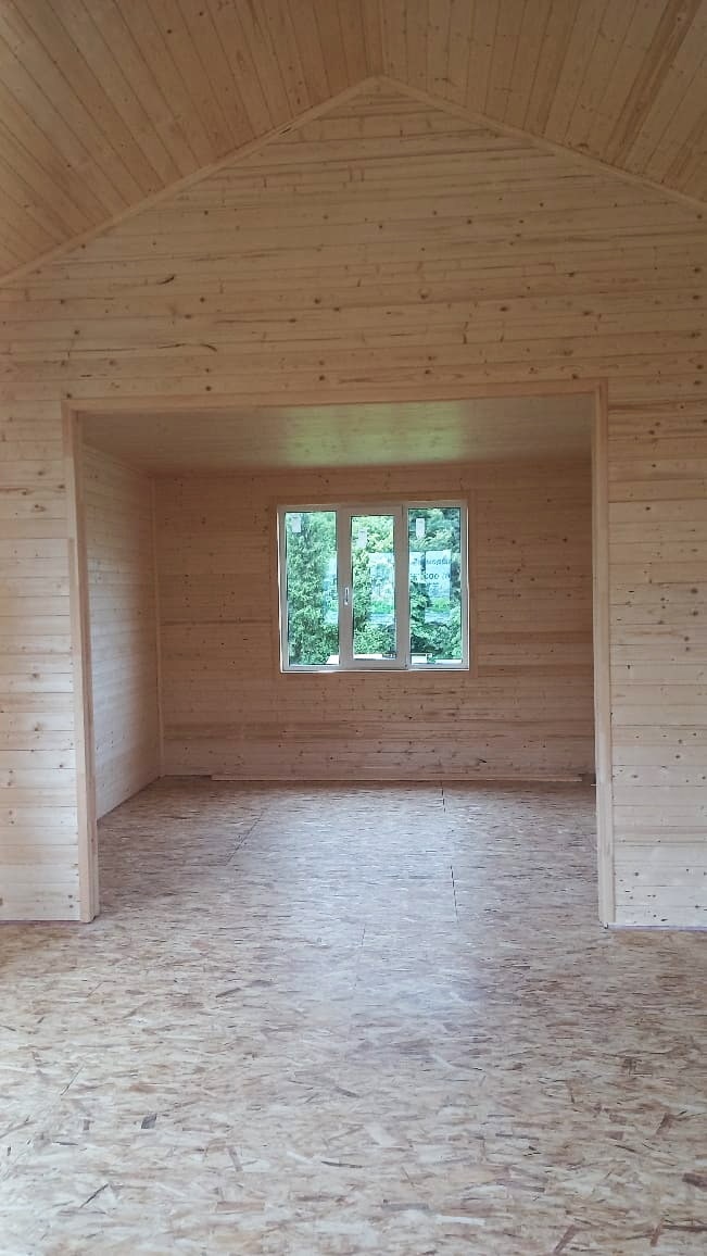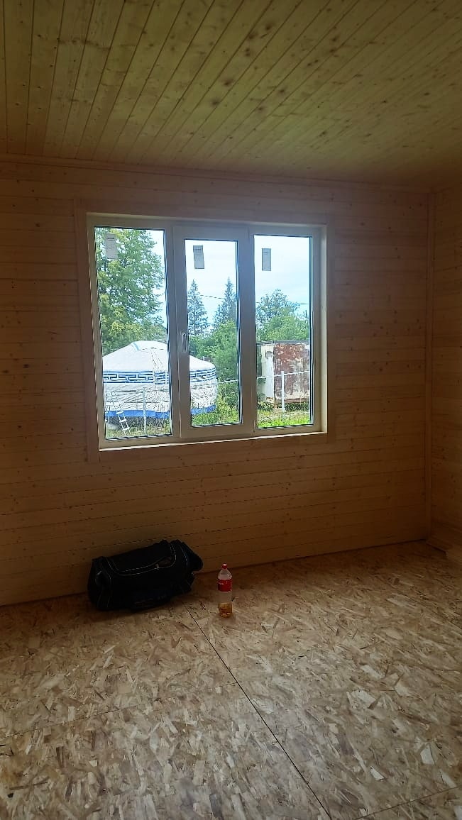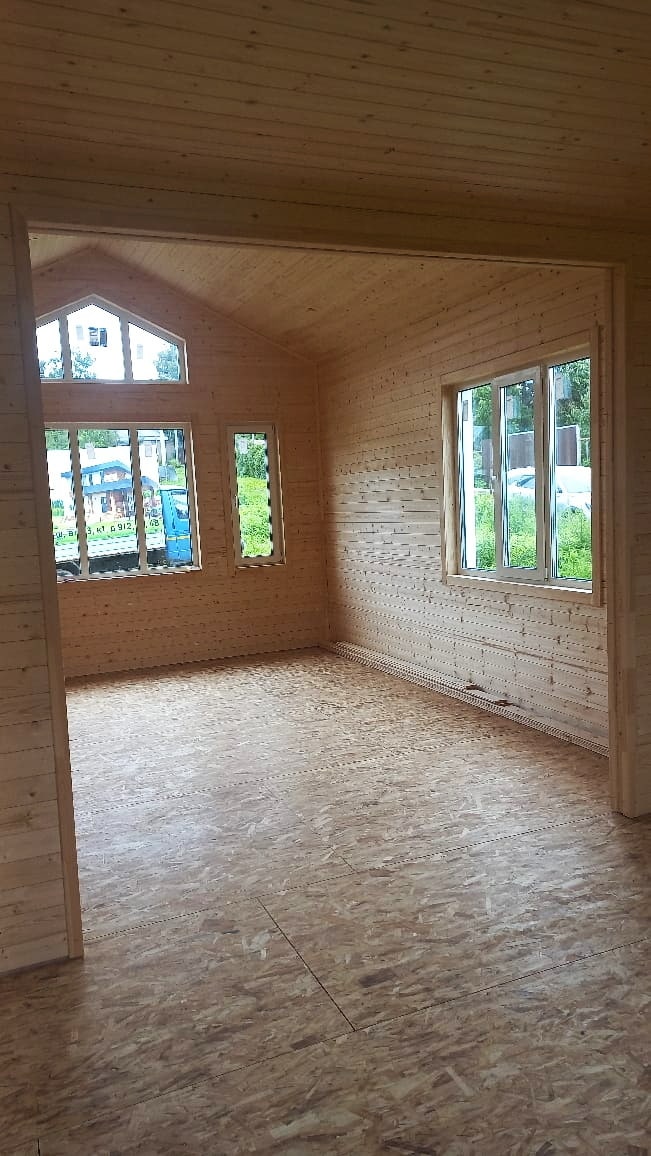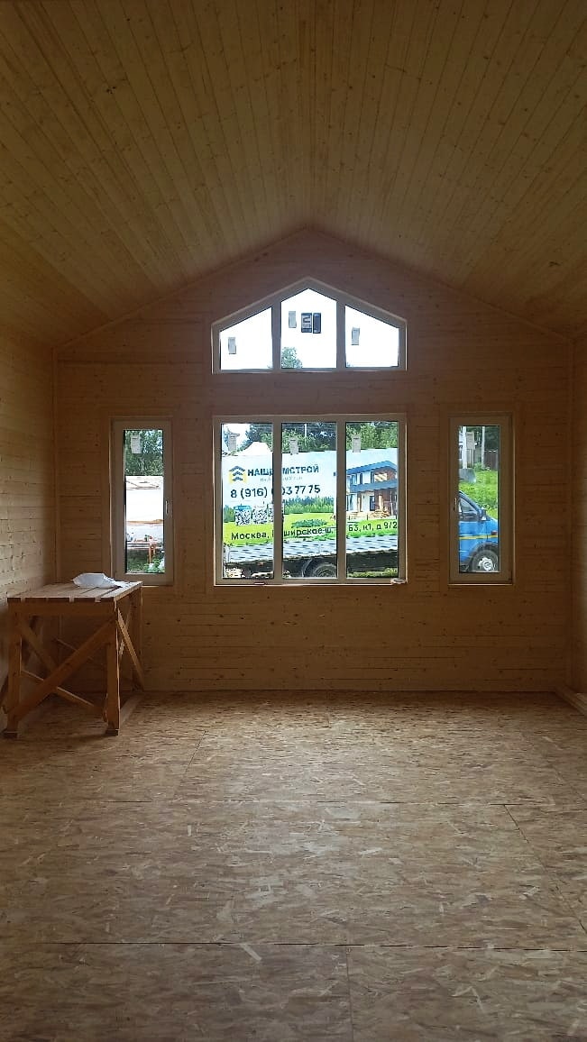 Внутренняя облицовка - вагонка "Штиль" из натурального дерева, напольное основание - плита ОСП (22 мм). Идеальная отделка с точки зрения экологических стандартов. Оконная композиция заслуживает отдельного внимания. Под фигурным (пятиугольным) окном расположены в ряд несколько вытянутых прямоугольных окон. Дизайнерское остекление придает каркасному дому нарядный вид, прочный оконный профиль "РЕХАУ" надёжно служит много лет.
