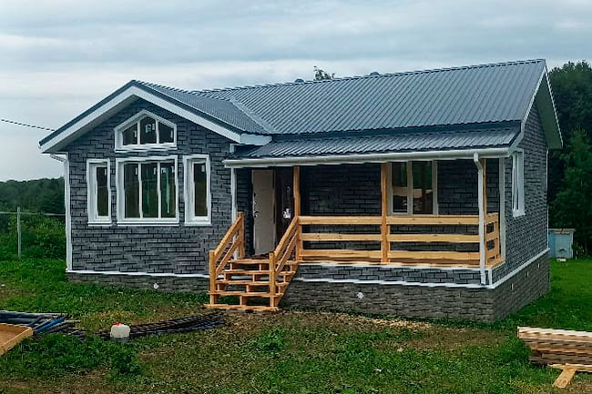 Площадь застройки занимает 85 м2 (размеры 8,5х10 м), а жилая площадь составляет 77,02 м2. В каркасном доме две отдельные комнаты, гостиная, объединенная с кухней, холл и санузел. Входная металлическая дверь (производство Россия) ведет в тамбур, затем в холл (холодный воздух не проникает в жилую зону). Для внешней облицовки мы используем надежный и красивый материал, проверенный временем. Это фасадная плитка HAUBERK (Хауберг), эстетичная и прочная, не пропускающая влагу, и не выгорающая на солнце.