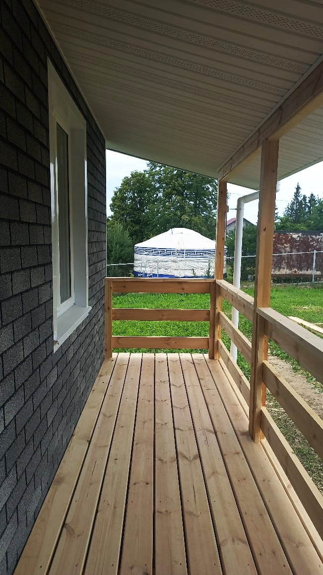 Большая терраса с деревянным ограждением площадью 8,25 м2 - удобное место для летнего отдыха, чаепитий, детских игр или приёма гостей. Мы выполняем все виды дополнительных услуг "под Ключ", связанных с отделкой дома, подводкой инженерных коммуникаций, интерьерным оформлением помещений и т.д.