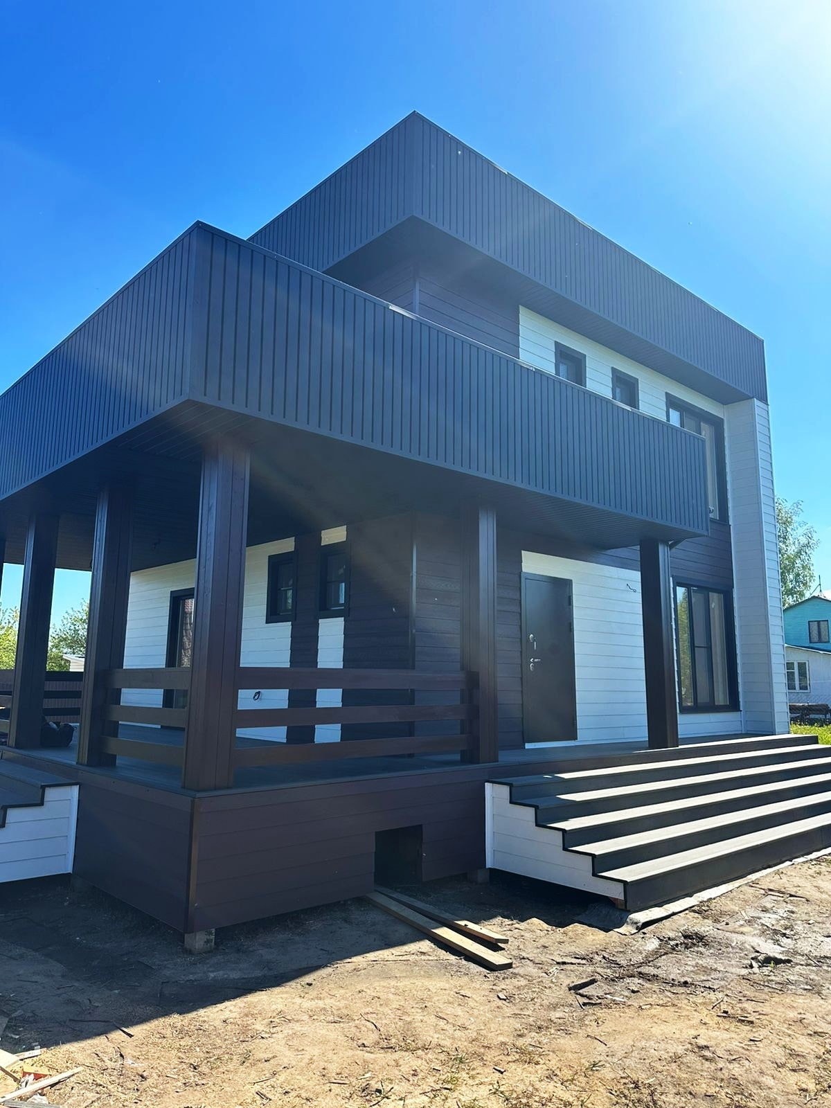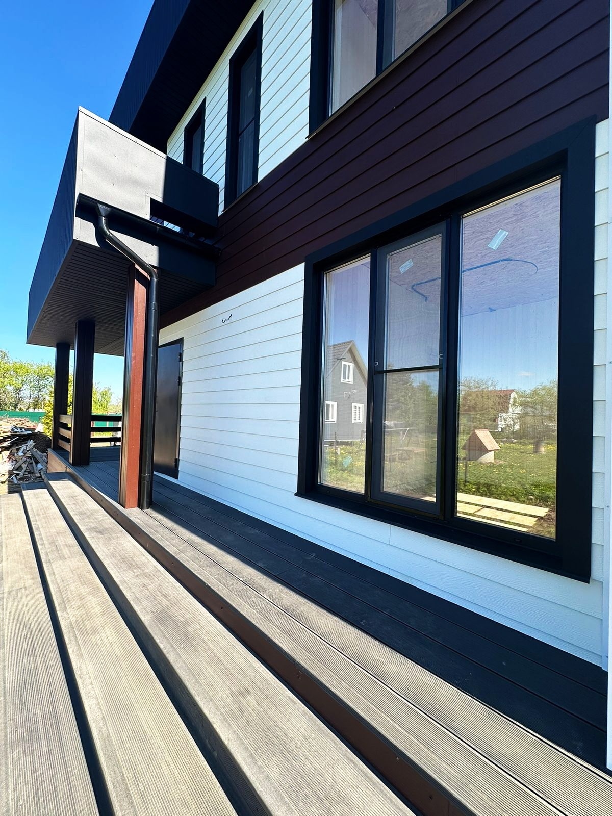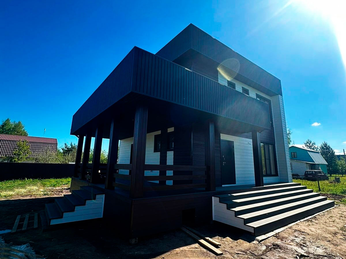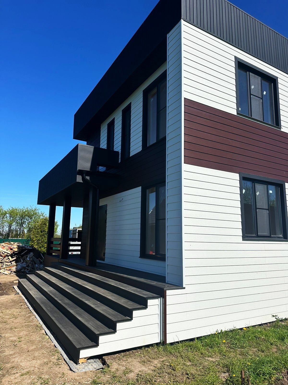 Отличительные особенности проекта - широкое, во всю стену, крыльцо, большие квадратные окна, плоская крыша. Фасады облицованы фибросайдингом и скошенным деревянным планкеном. Дом с усиленным каркасом утеплен по всему периметру минераловатными плитами.