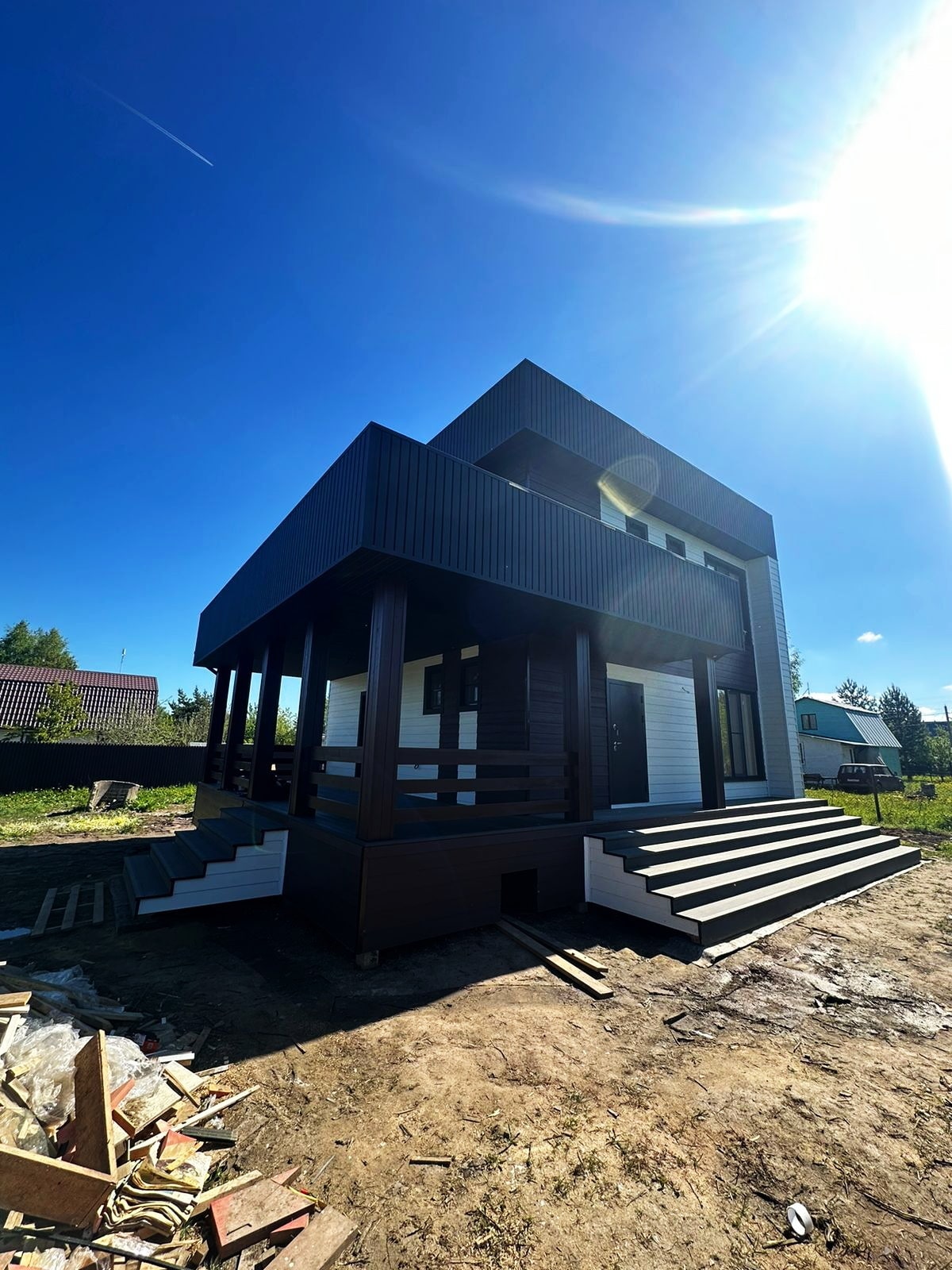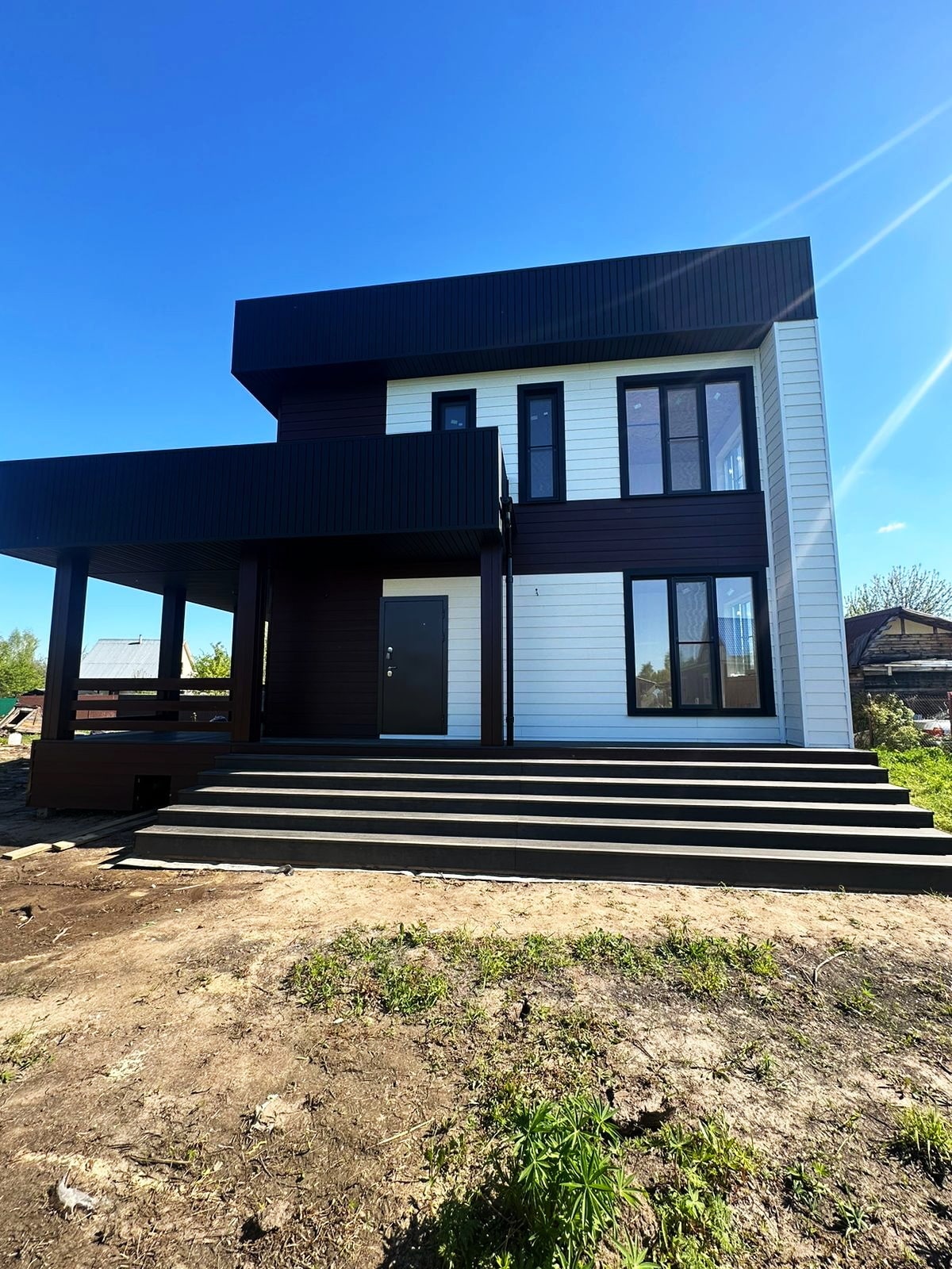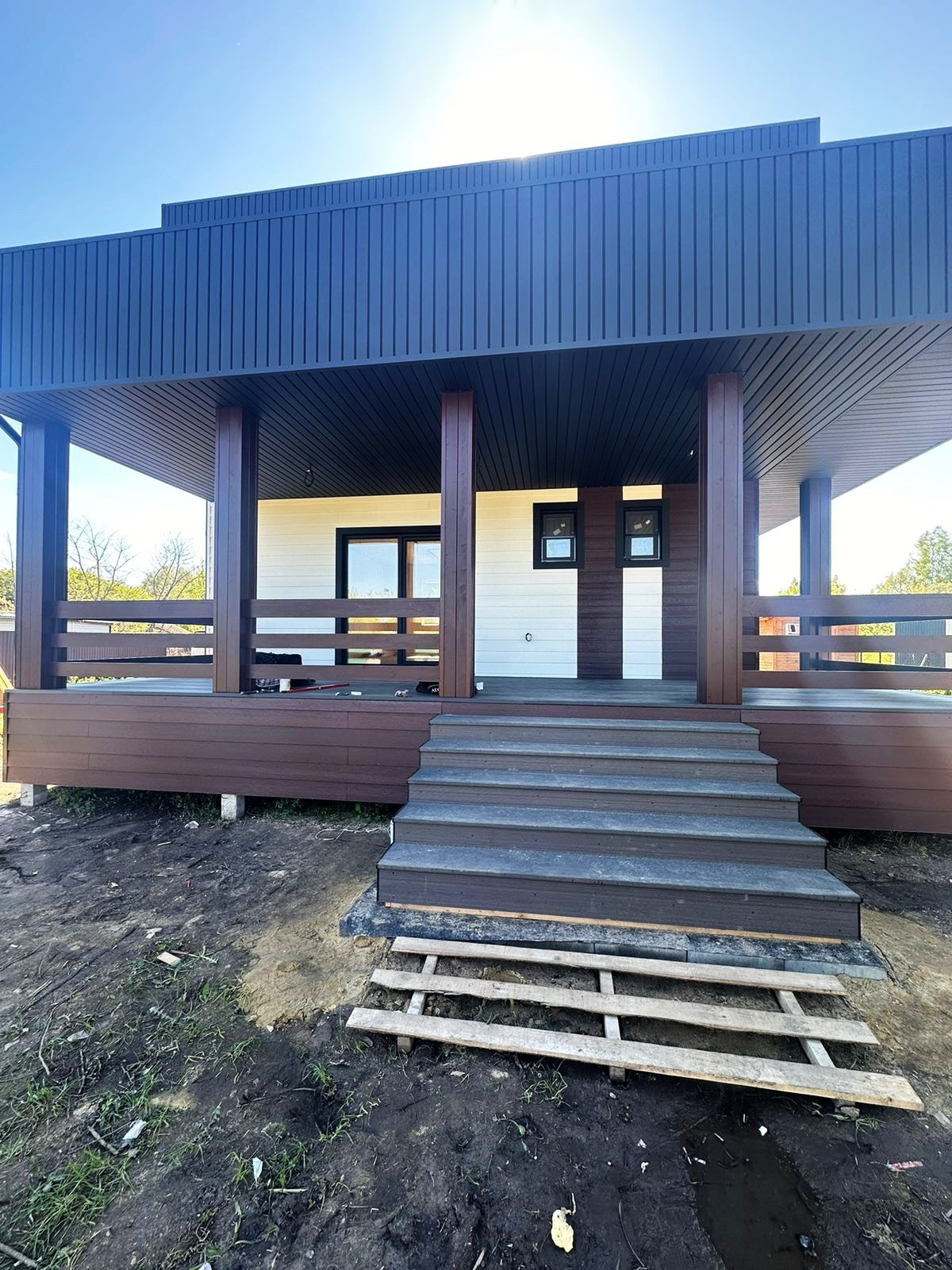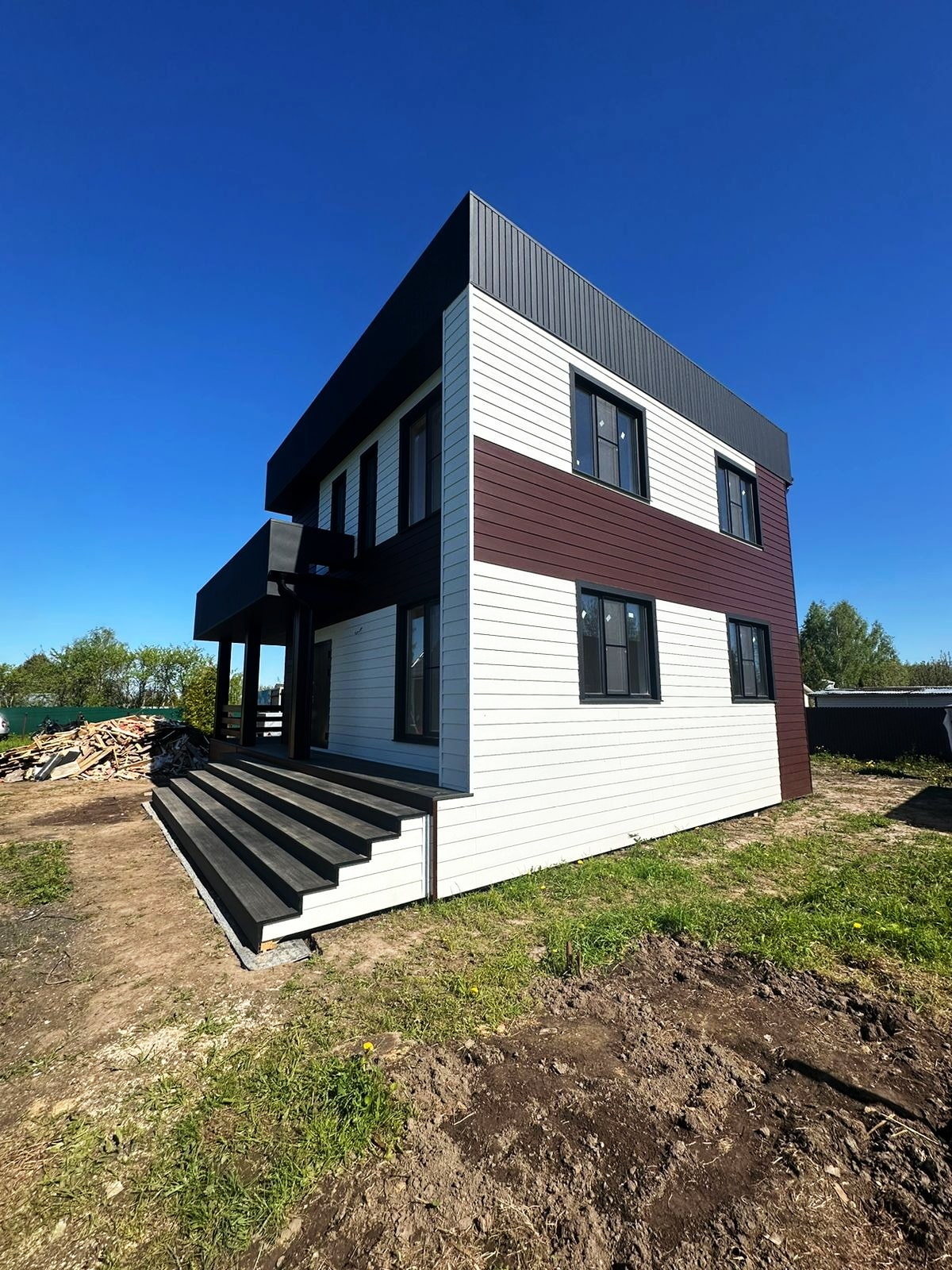 Отличительные особенности проекта - широкое, во всю стену, крыльцо, большие квадратные окна, плоская крыша. Фасады облицованы фибросайдингом и скошенным деревянным планкеном. Дом с усиленным каркасом утеплен по всему периметру минераловатными плитами.