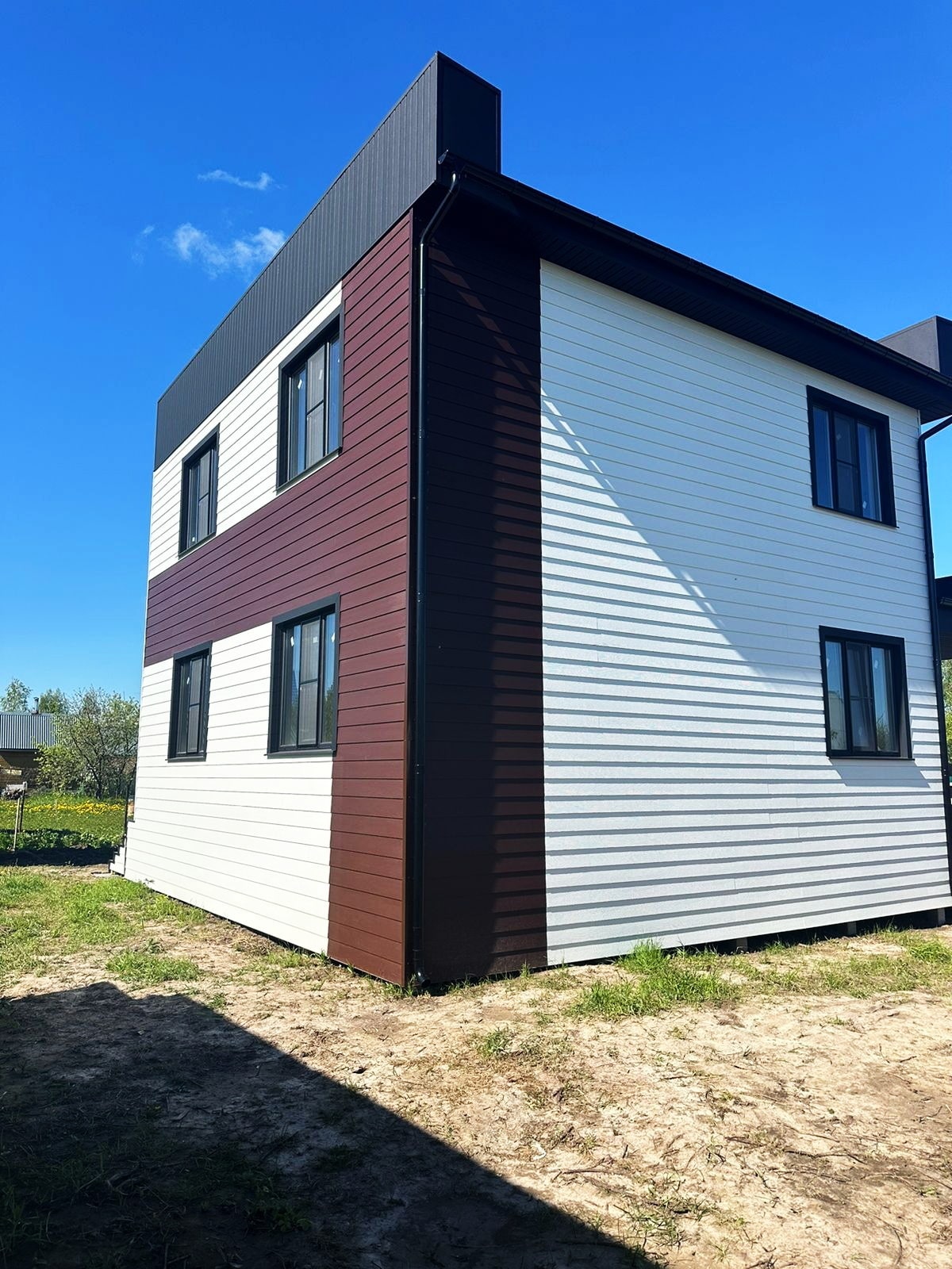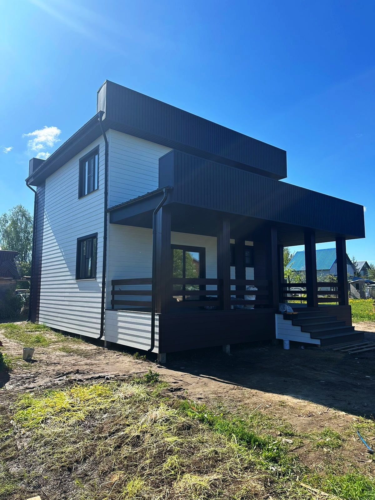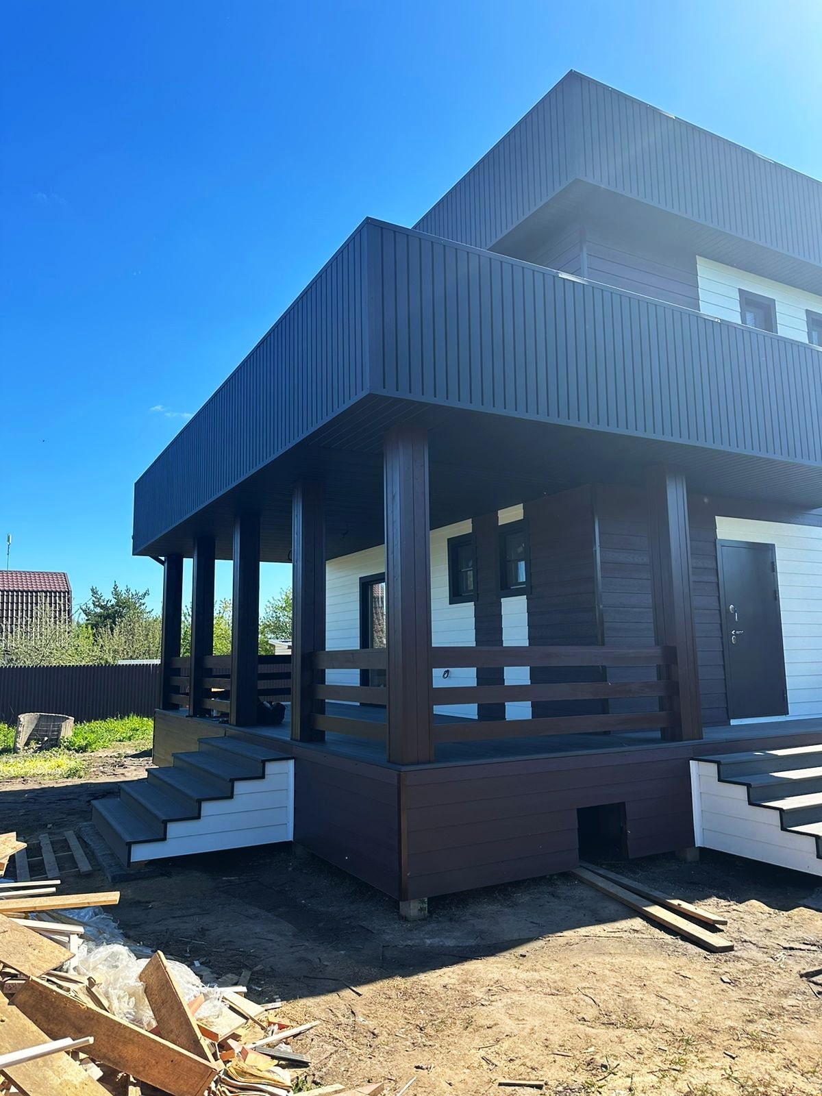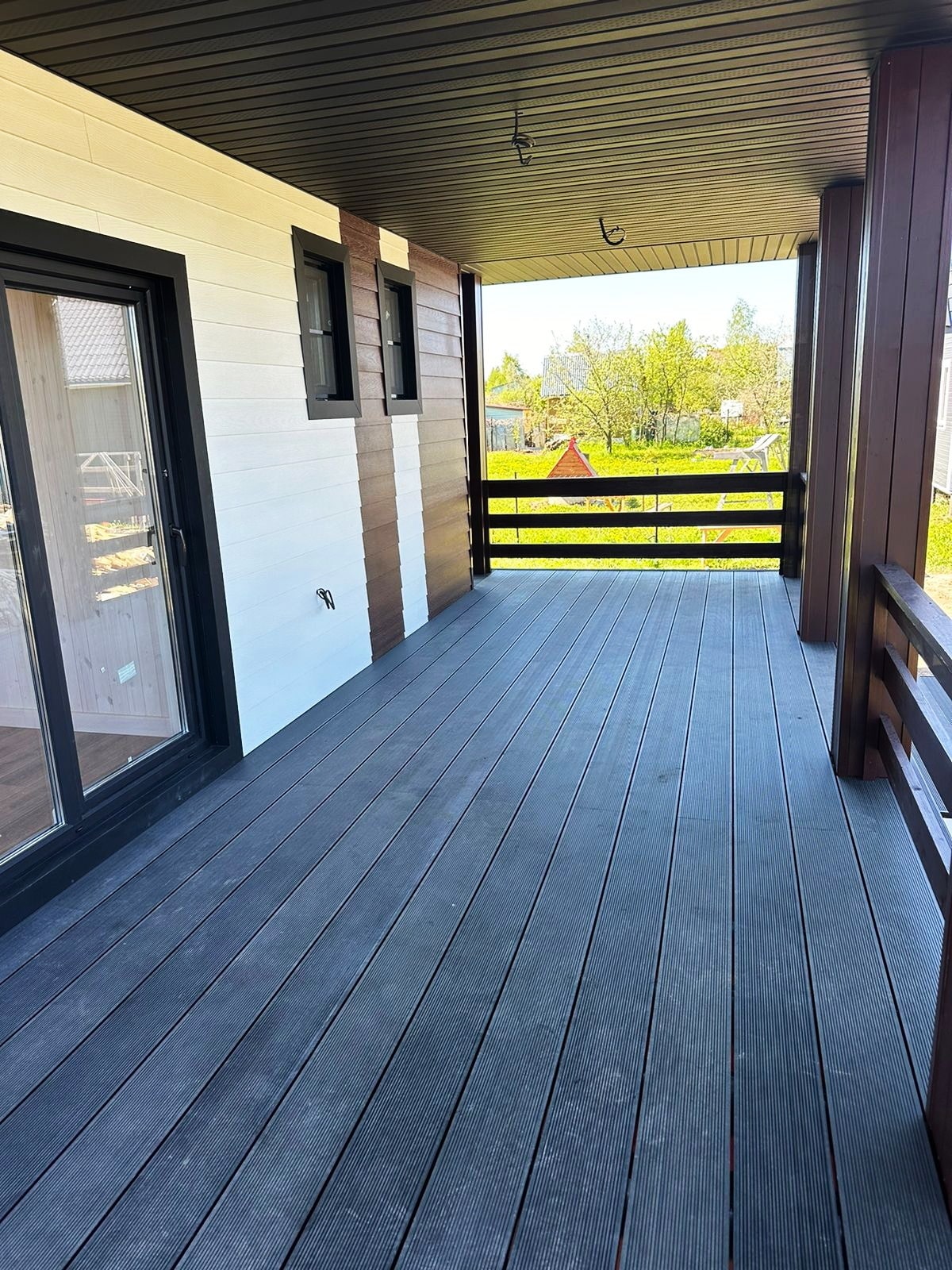 Отличительные особенности проекта - широкое, во всю стену, крыльцо, большие квадратные окна, плоская крыша. Фасады облицованы фибросайдингом и скошенным деревянным планкеном. Дом с усиленным каркасом утеплен по всему периметру минераловатными плитами.