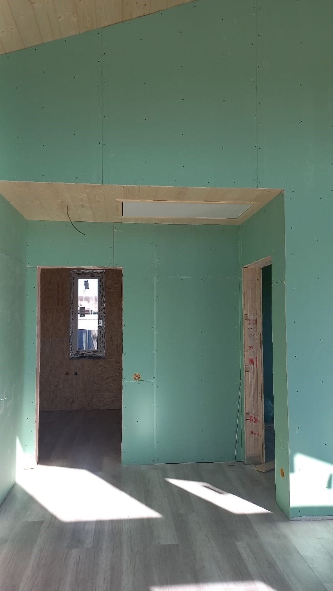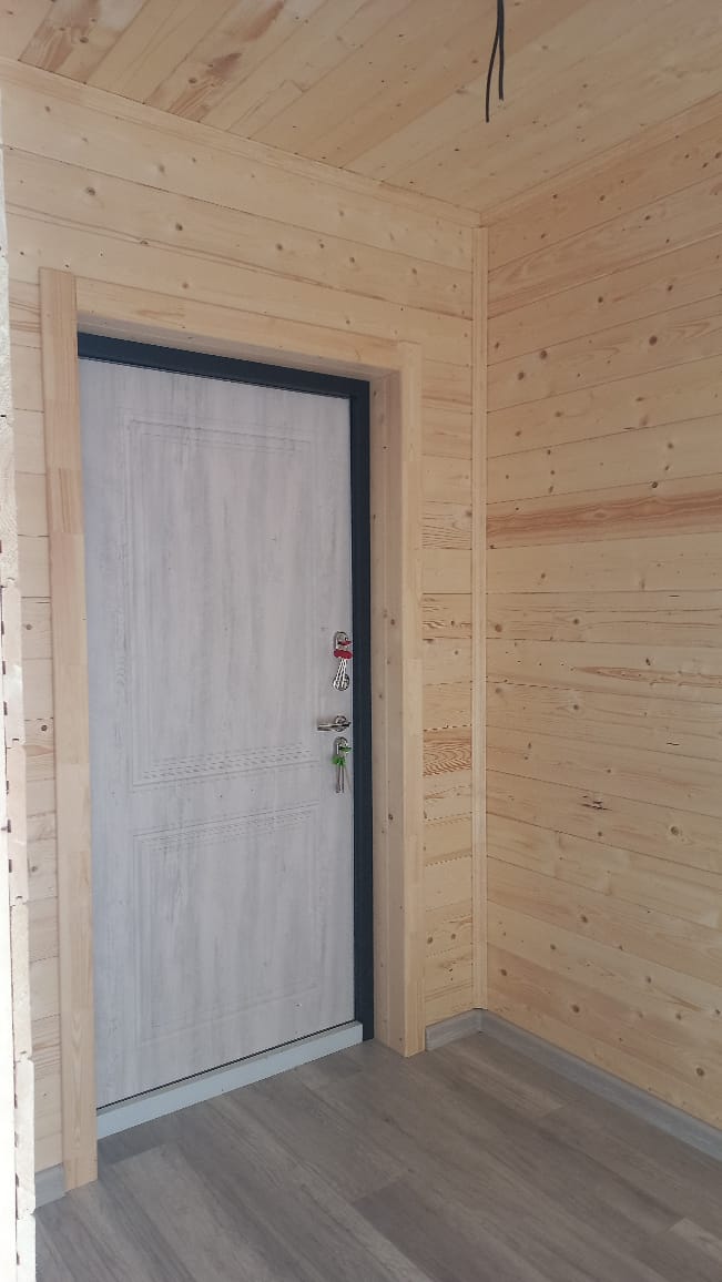 Деревянная обшивка внутренних стен гармонично сочетается с ламинатом и межкомнатными дверями, облицованными Эко-шпоном (производство Россия). Отделка дома выглядит стильно и аккуратно. Каркасный дом "Сказка" идеально вписывается в загородный ландшафт, и является комфортабельным местом проживания, сезонного или постоянного.