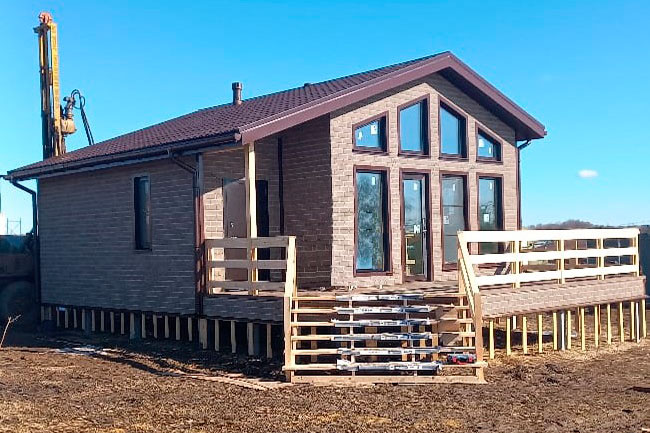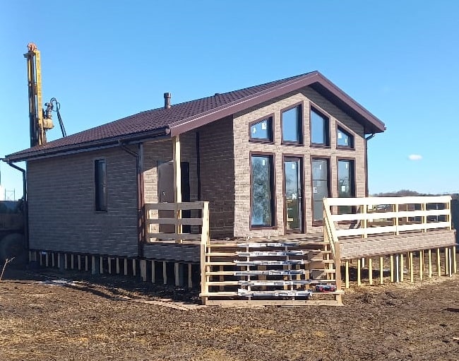 Большая кухня-гостиная и патио (24,9 м2) могут использоваться как обеденная зона во время приезда друзей и родственников. Планировкой жилого дома предусмотрены просторная ванная и санузел, а также небольшой тамбур с выходом на полуоткрытую террасу. Жилая комната хозяйки - уютная, тихая и светлая. Для внешней облицовки фасадов заказчики выбрали плитку Hauberk, - это очень прочный и практичный материал, который сохраняет первоначальные свойства и внешний вид несколько десятков лет.