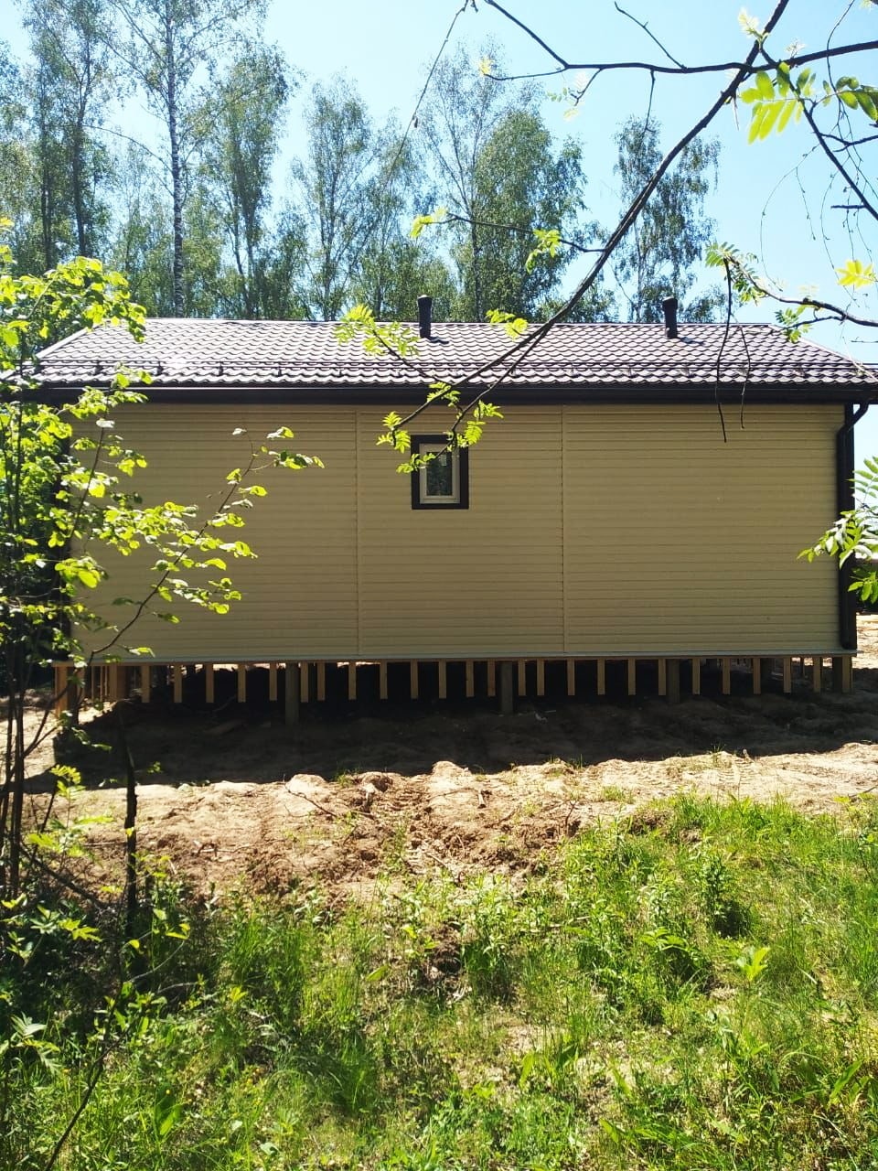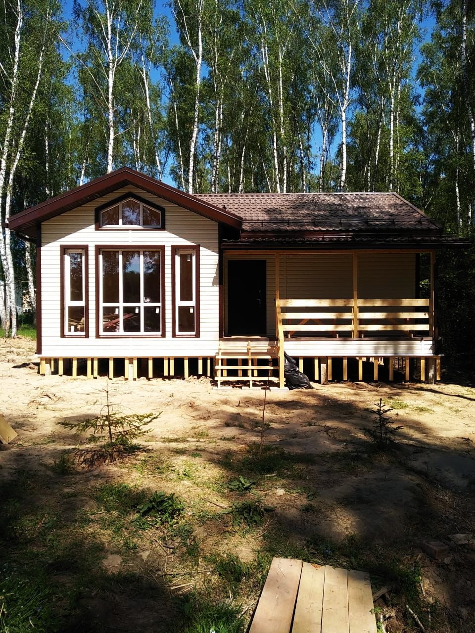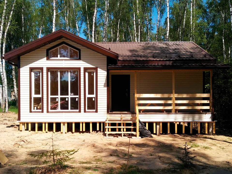 Каркасный одноэтажный дом с удобной планировкой комнат подойдет для постоянного проживания небольшой семьи. Фигурная крыша, большие окна и аккуратные фасады, облицованные сайдингом, придают коттеджу нарядный вид. Дом условно разделен на две части, - в одной из них находятся кухня и гостиная, в другой - две комнаты, в промежуточной зоне - тамбур, санузел, холл.