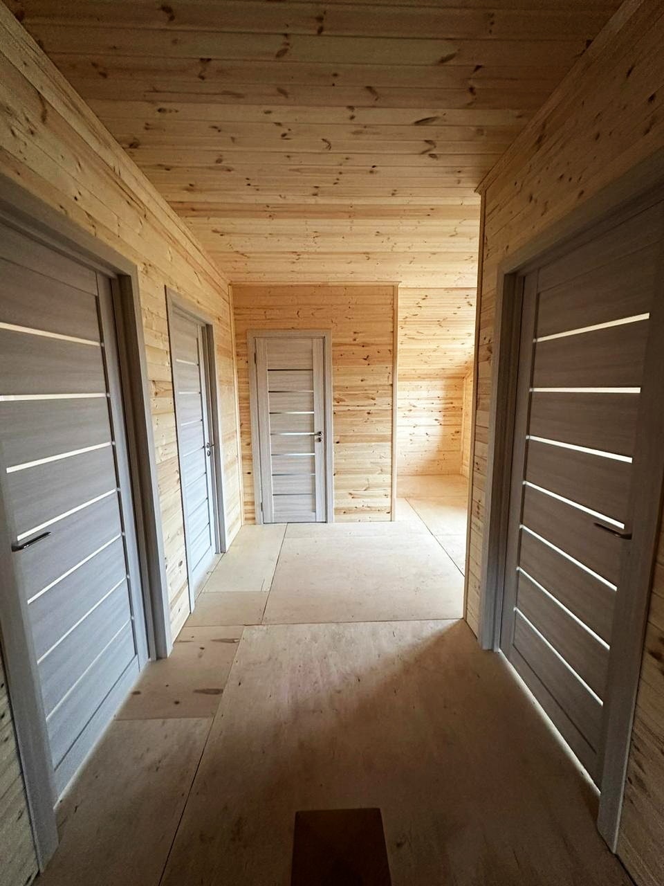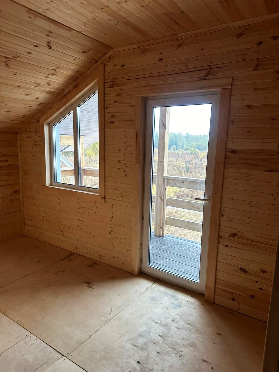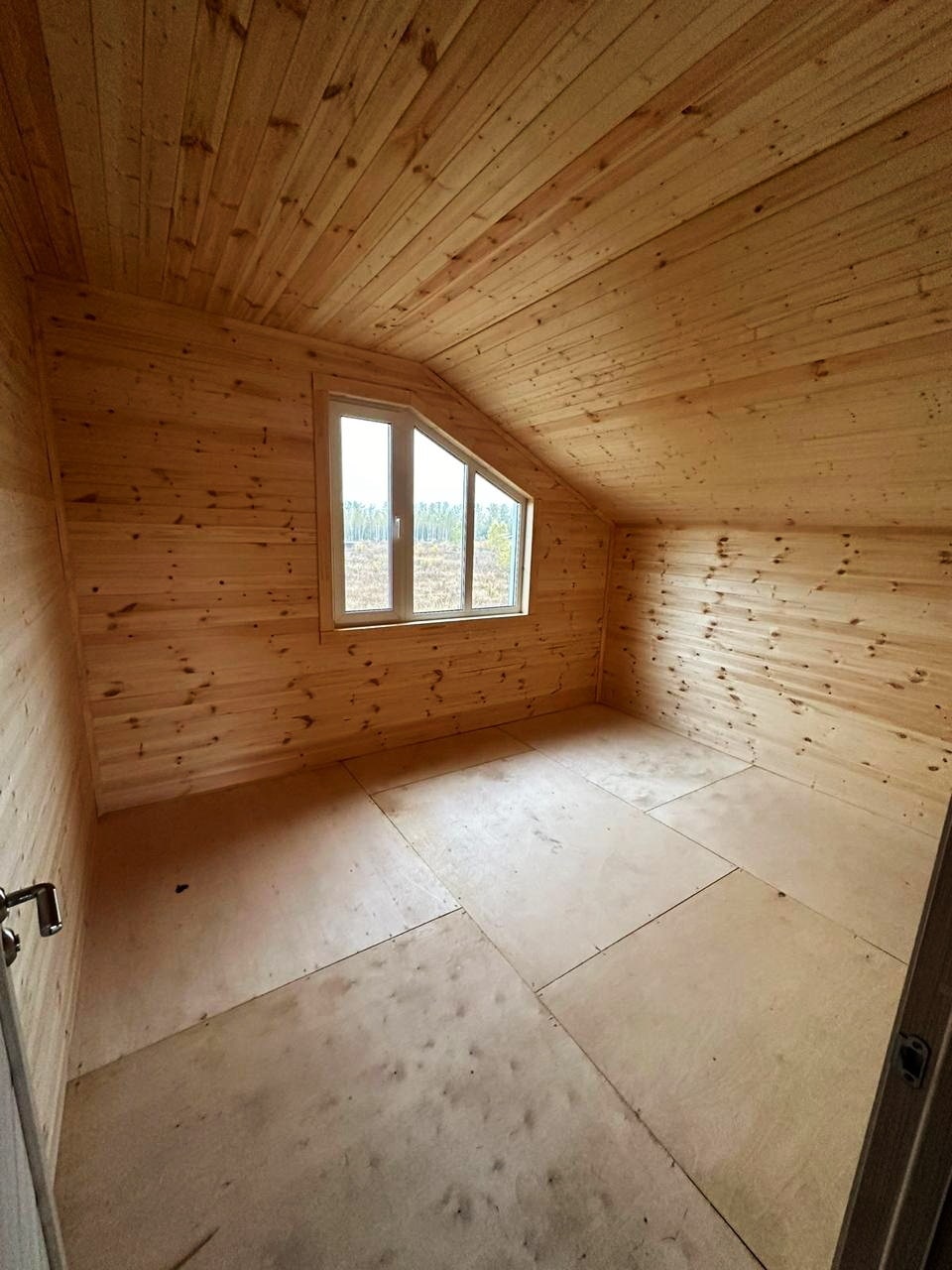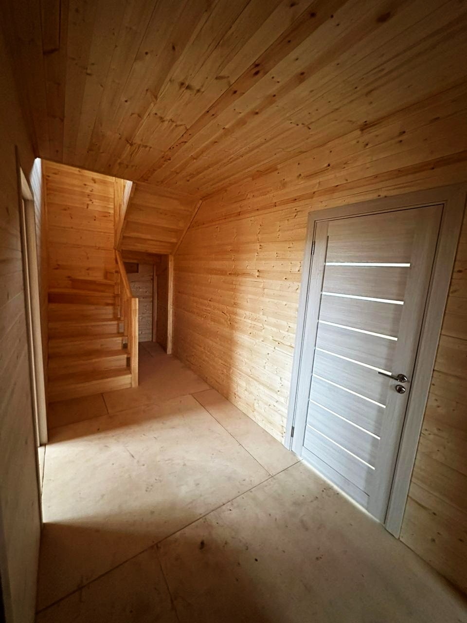 Комфортное жилое пространство. Жильцам не придется выравнивать стены, полы и потолки, все пропорции и геометрические параметры соблюдены идеально. Облицовка вагонкой предусмотрена проектом, так же, как и установка поворотной деревянной лестницы с перильным ограждением. Двери и стеклопакеты установлены герметично, качественная фурнитура обеспечит их надежную эксплуатацию. Заказчики выбрали чистовую отделку с установкой межкомнатных и балконных дверей, которые были ими выбраны самостоятельно.