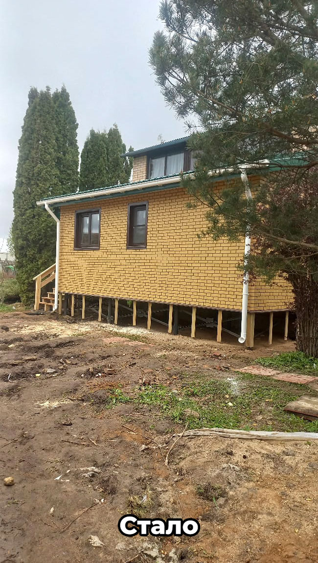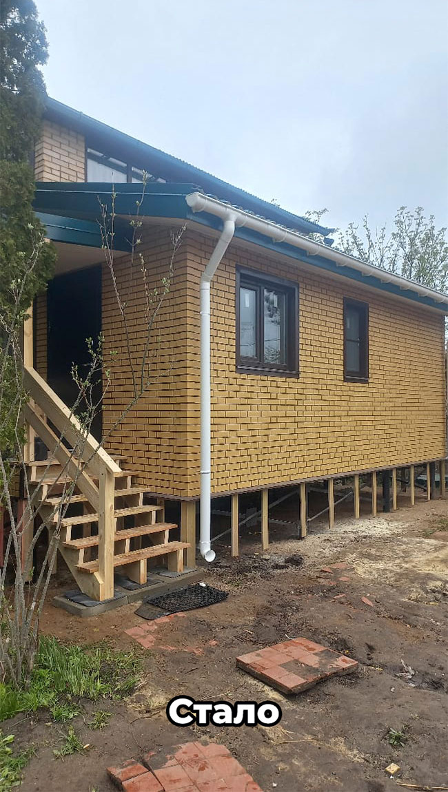 Установлен свайно-ростверковый фундамент на металлических винтовых сваях с подсистемой для крепления отделки цоколя. Для увеличения жесткости фундамента смонтированы диагональные раскосы.