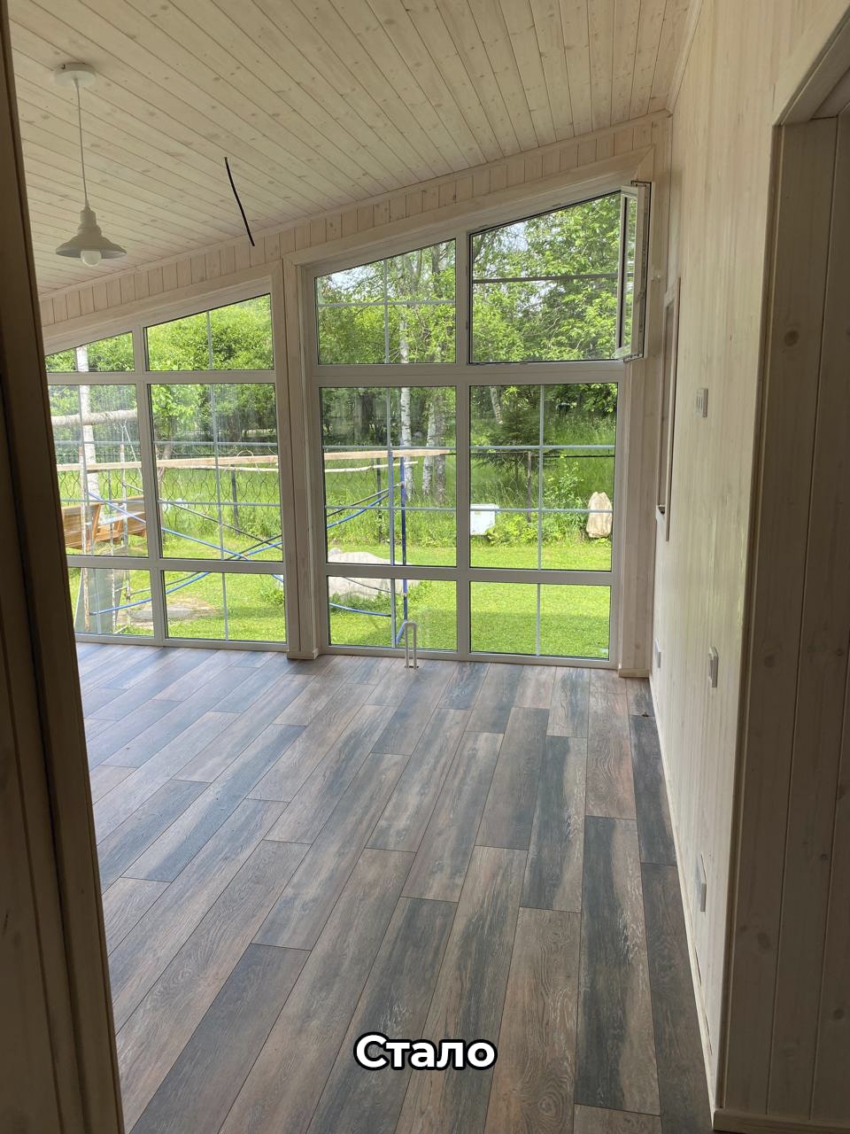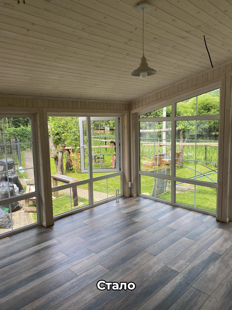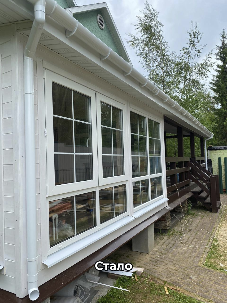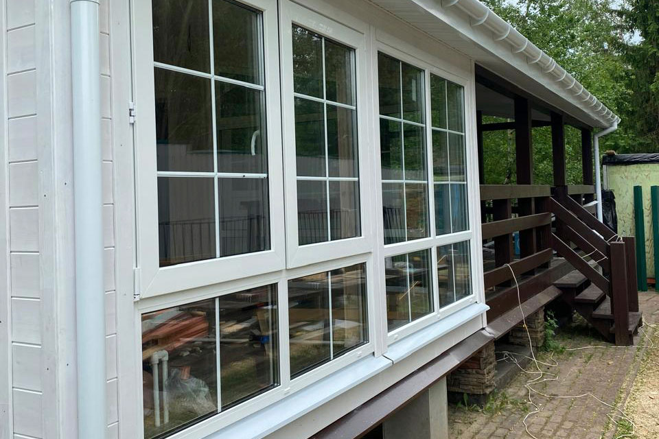 Окна - двухкамерные стеклопакеты в раме ПВХ РЕХАУ. Внутри стеклопакета вставлены декоративные шпроссе.